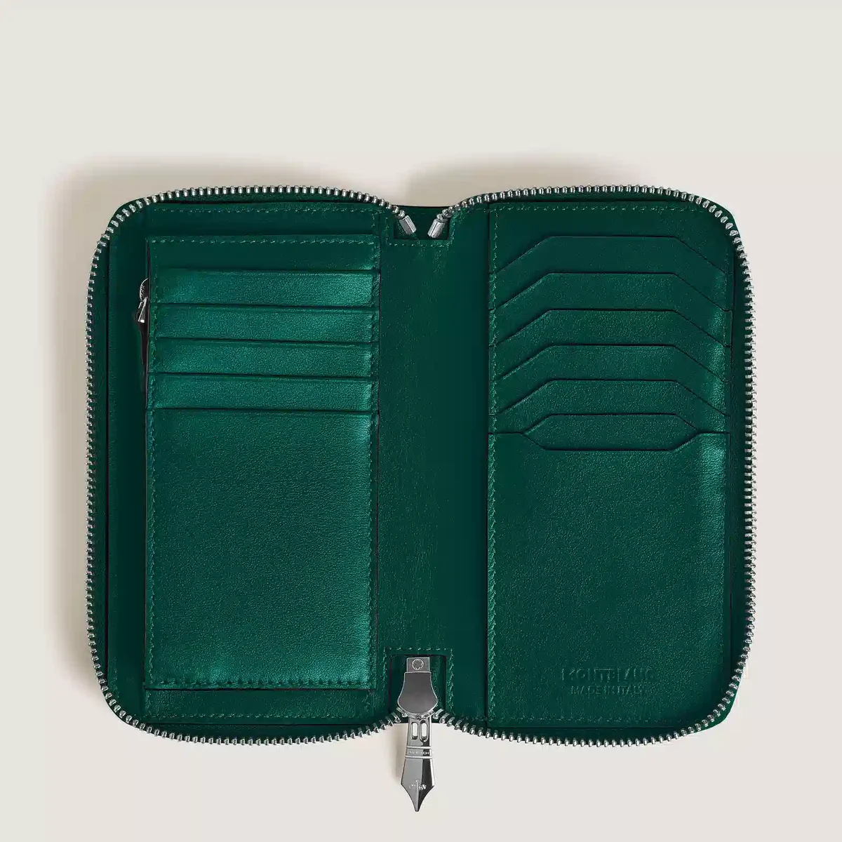 Esta cartera, que combina un diseño elegante con una funcionalidad práctica, es un complemento versátil para cualquier ocasión. Confeccionada en piel de becerro suave de primera calidad en color malaquita, su silueta rectangular de líneas limpias irradia sofisticación. Un tirador inspirado en una plumilla abre la cremallera para revelar tres compartimentos para billetes, un monedero con cremallera, tres bolsillos para objetos pequeños esenciales y ranuras con capacidad para 12 tarjetas de crédito, lo que garantiza una organización sin esfuerzo con un estilo refinado. N.º de identificación: MB220331. Dimensiones: 150 mm * 20 mm * 90 mm. Peso físico: 200 g. Aviso legal exportable: Emblemas. 20 mm * 90 mm