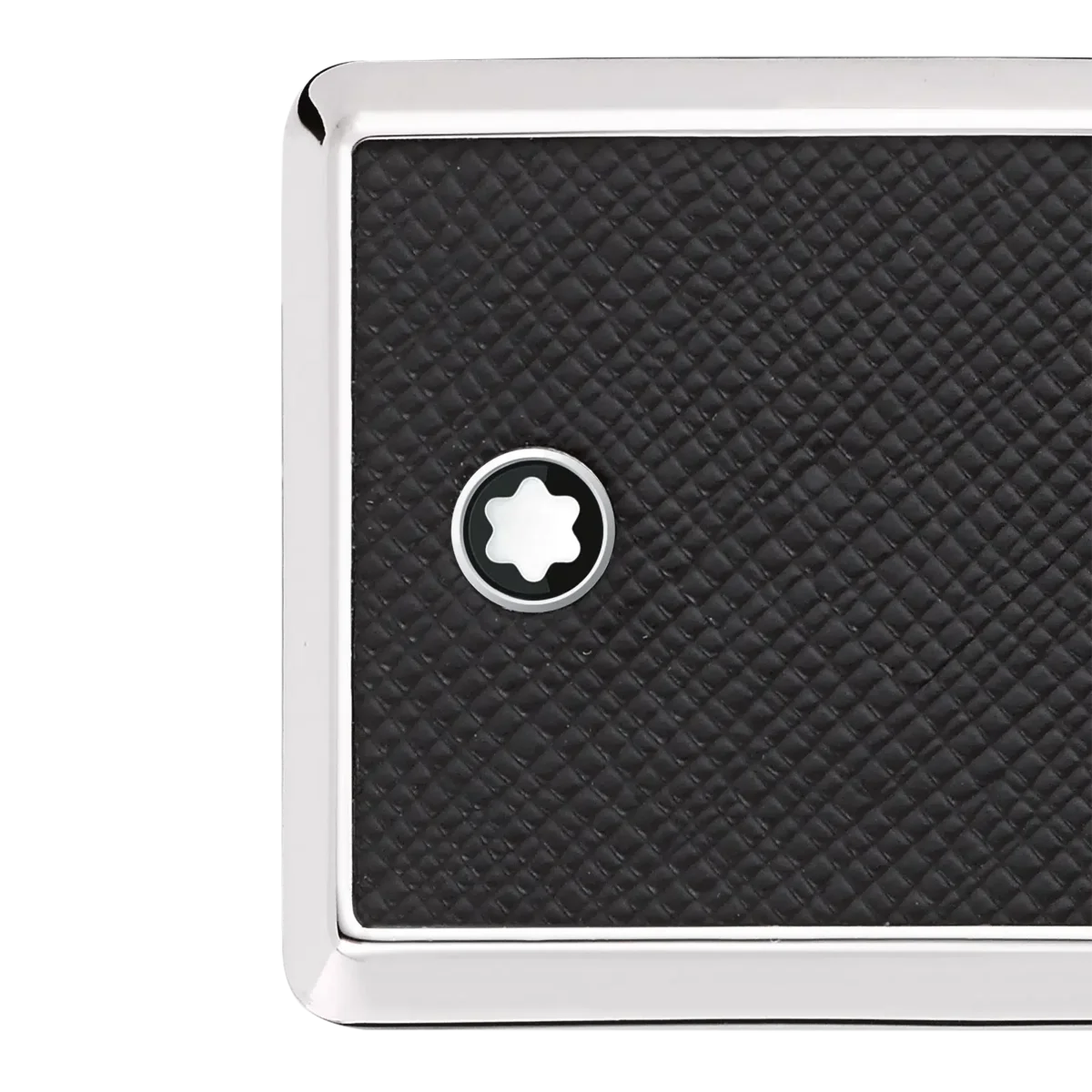Cuero negro con estampado Saffiano rectangular enmarcado y hebilla de acero inoxidable. Correa de cuero negro estampado Saffiano autoajustable, 3 cm x 120 cm. N.º de identificación: MB114421. Dimensiones: 1200 mm * 30 mm * 5 mm. Peso físico: 184 g. Aviso legal exportable: los emblemas se centran manualmente, uno por uno. 5 mm
