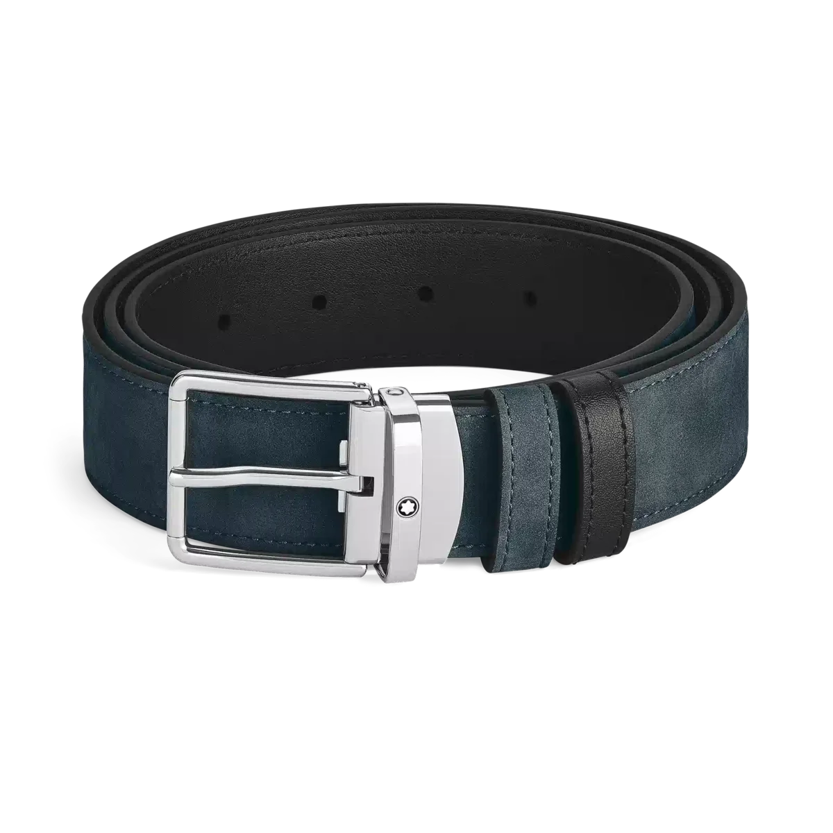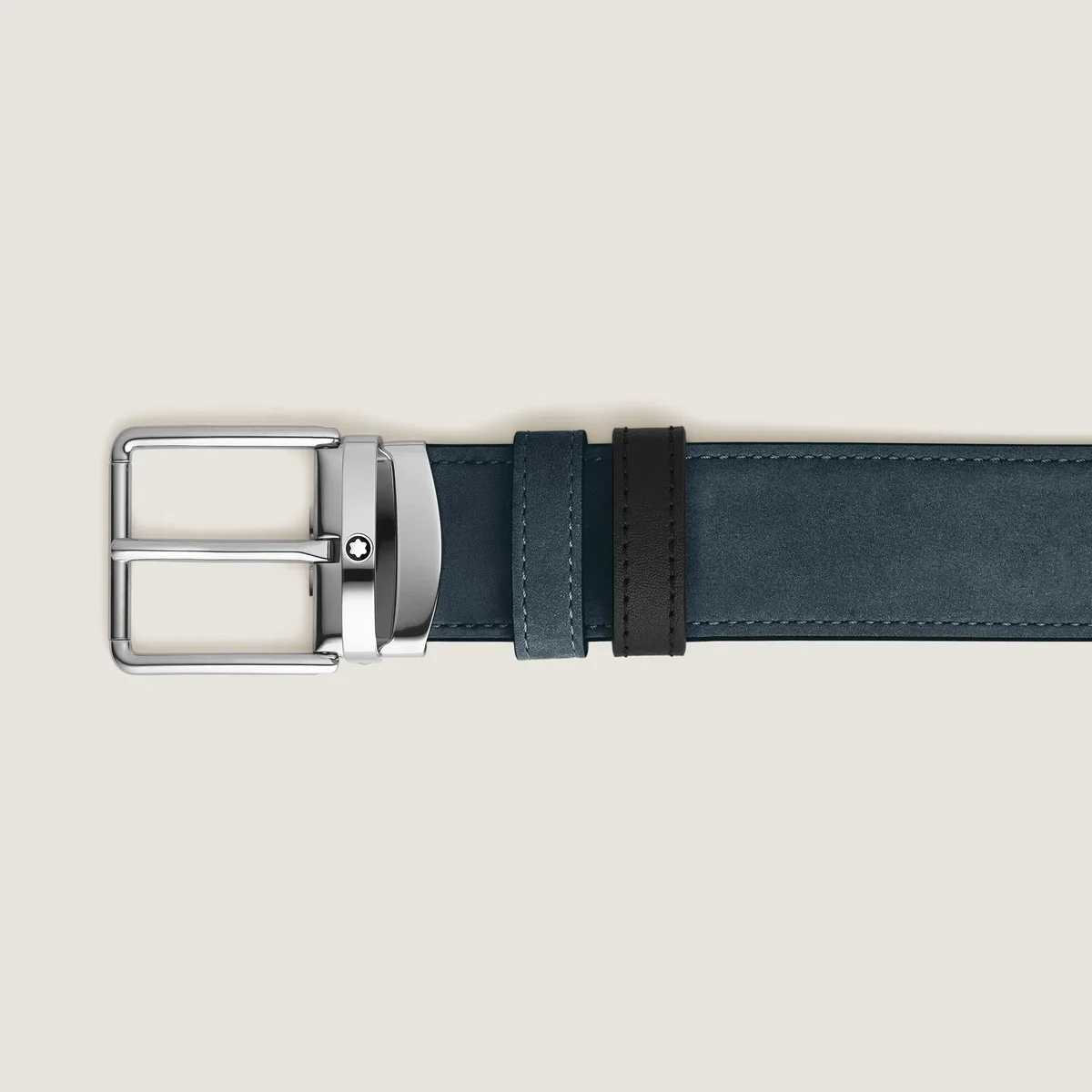 Este cinturón reversible de piel de 35 mm combina a la perfección practicidad y elegancia. Mientras que un lado aporta un toque informal con una suave piel de ante azul aterciopelada, el reverso presenta una piel negra clásica y suave para un look más tradicional. La hebilla Everyday, con su elegante silueta rectangular, está elaborada en PVD recubierto de caucho negro y presenta bordes limpios y un discreto logotipo de Montblanc incrustado en la base. N.º de identificación: MB221007