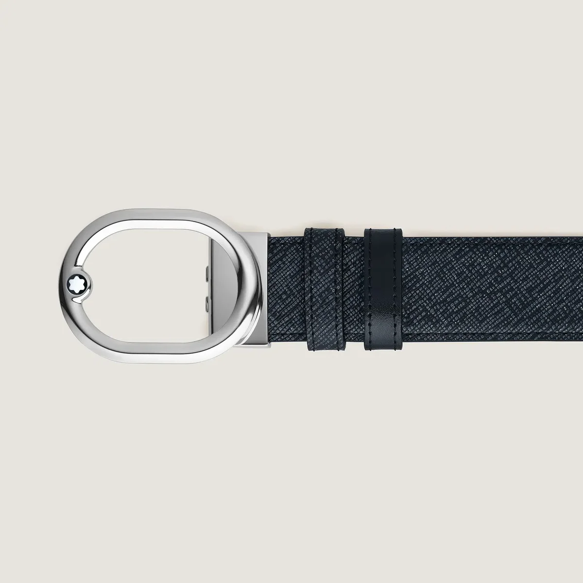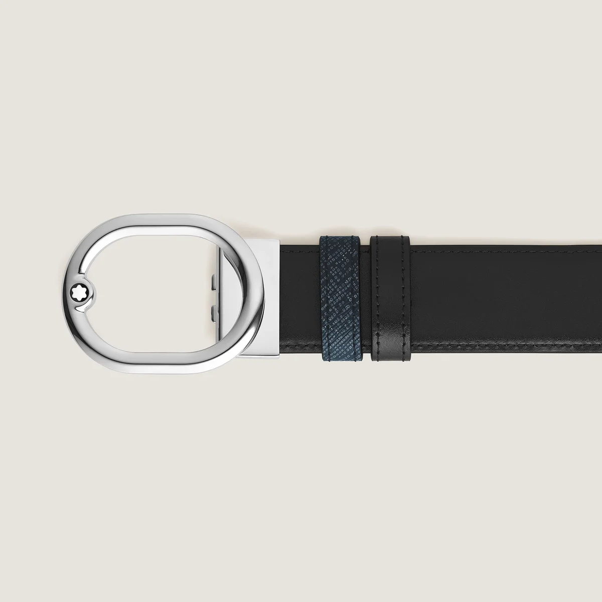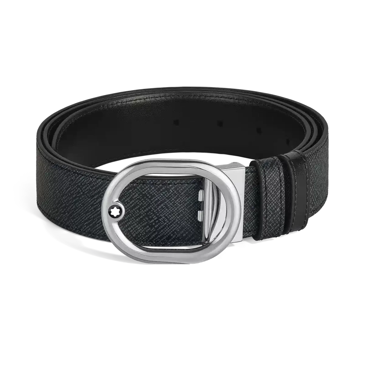 El cinturón reversible L’Ovale de 35 mm combina la elegancia de una hebilla ovalada con acabado de paladio con la versatilidad de dos correas de piel distintas. La hebilla, que se aleja de los diseños cuadrados tradicionales, añade un toque de frescura a su estilo. La correa del cinturón ofrece dos opciones: un lado presenta piel de becerro estampada Sartorial azul tweed para un aspecto cálido y con textura, mientras que el reverso presenta piel Meisterstück negra, lo que proporciona una opción clásica y sofisticada para cualquier ocasión. N.º de identificación MB221025