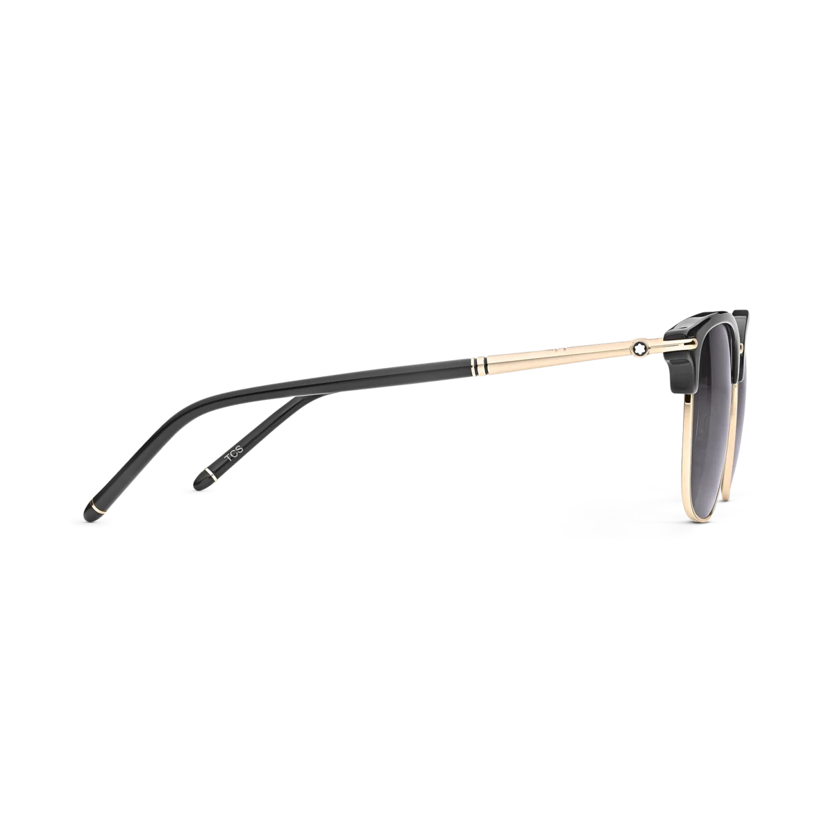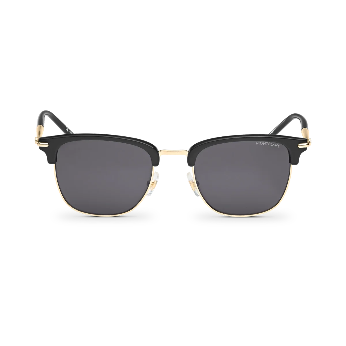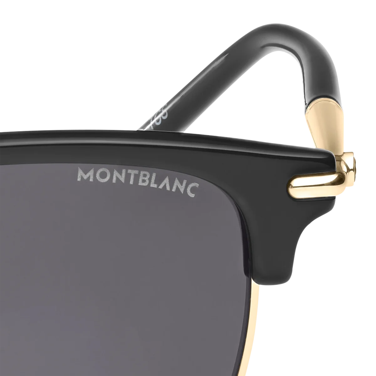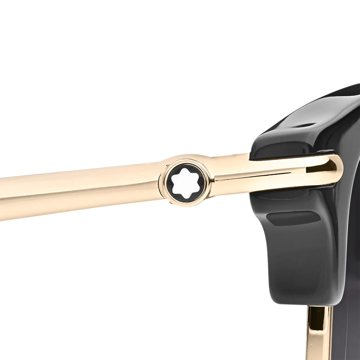Estas gafas de sol de estilo rectangular tienen una montura inyectada de color negro y lentes grises. El emblema Montblanc Snowcap está encapsulado en la patilla y el logotipo de Montblanc está grabado con láser en la lente izquierda. El detalle de tres anillos en la patilla recuerda a la colección Montblanc Meisterstück.