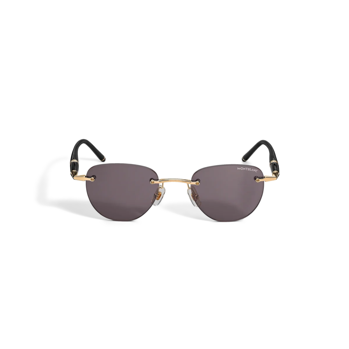 Estas gafas de sol sin montura de estilo redondo tienen una montura metálica dorada y lentes grises. Las patillas tubulares, inspiradas en los instrumentos de escritura Meisterstück, están adornadas con las letras Montblanc. El logotipo de Montblanc está grabado con láser en la lente izquierda.