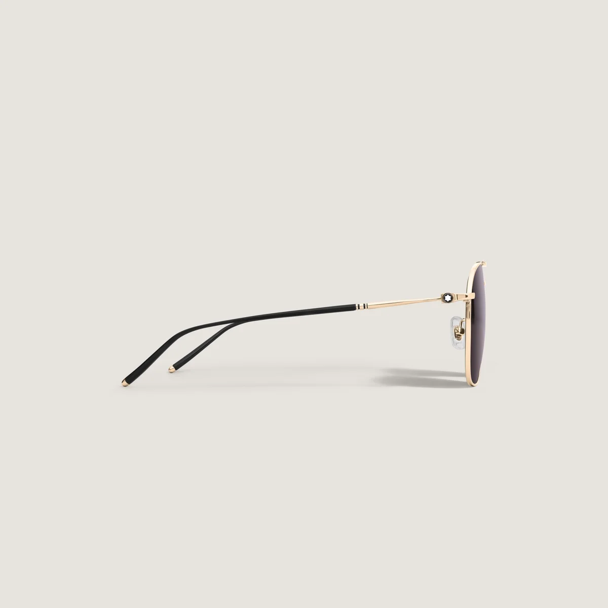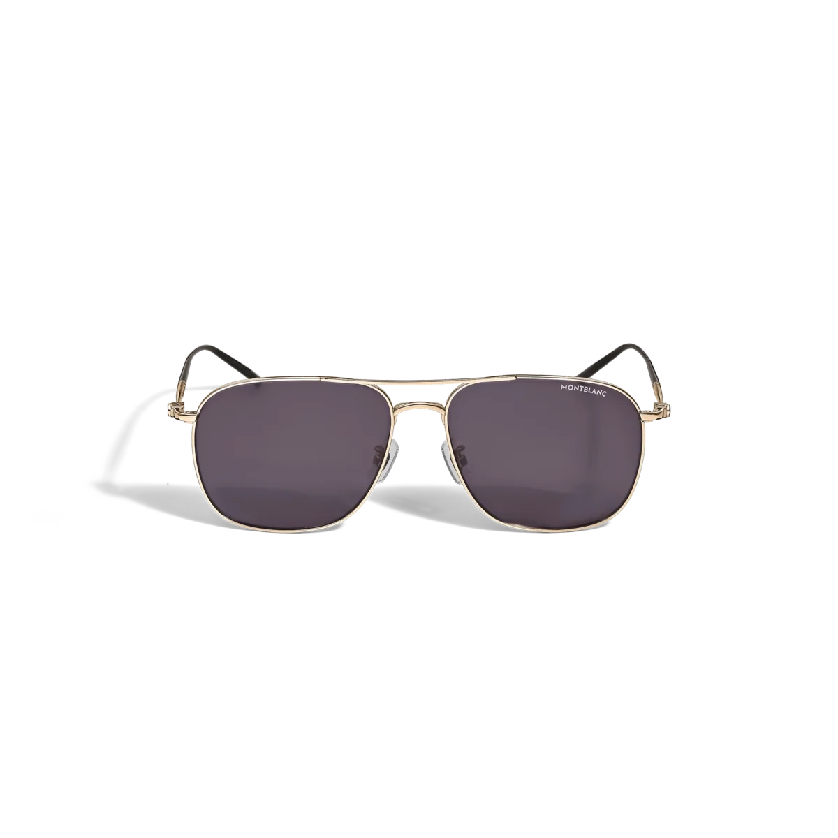 Estas gafas de sol de estilo cuadrado tienen una montura metálica dorada y lentes grises. Cuentan con un puente metálico doble en la parte delantera. Las patillas tubulares, inspiradas en los instrumentos de escritura Meisterstück, están adornadas con un detalle de tres anillos. El logotipo de Montblanc está grabado con láser en la lente izquierda y las puntas de las patillas están encapsuladas con un detalle de esmalte negro. N.º de identificación: MB135563