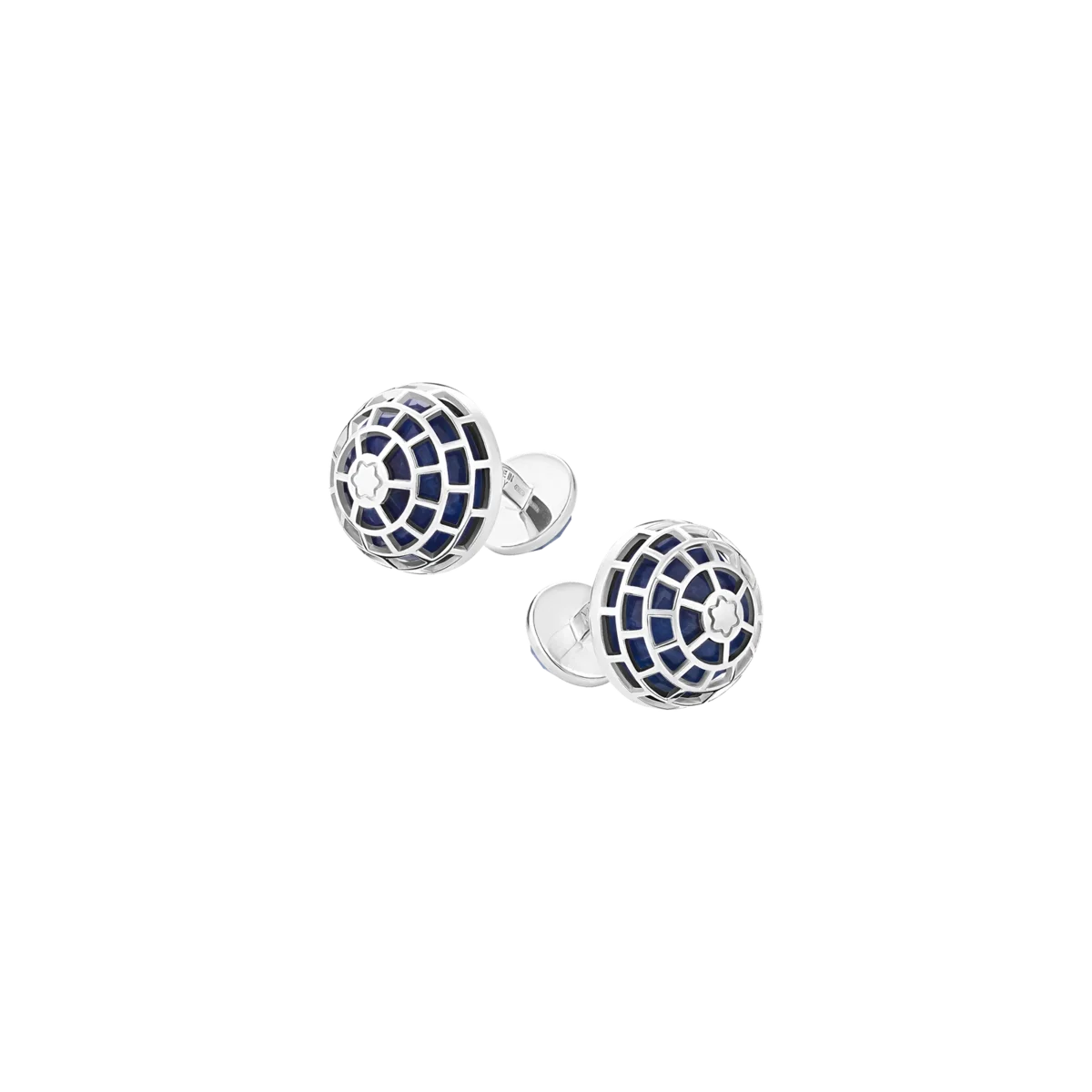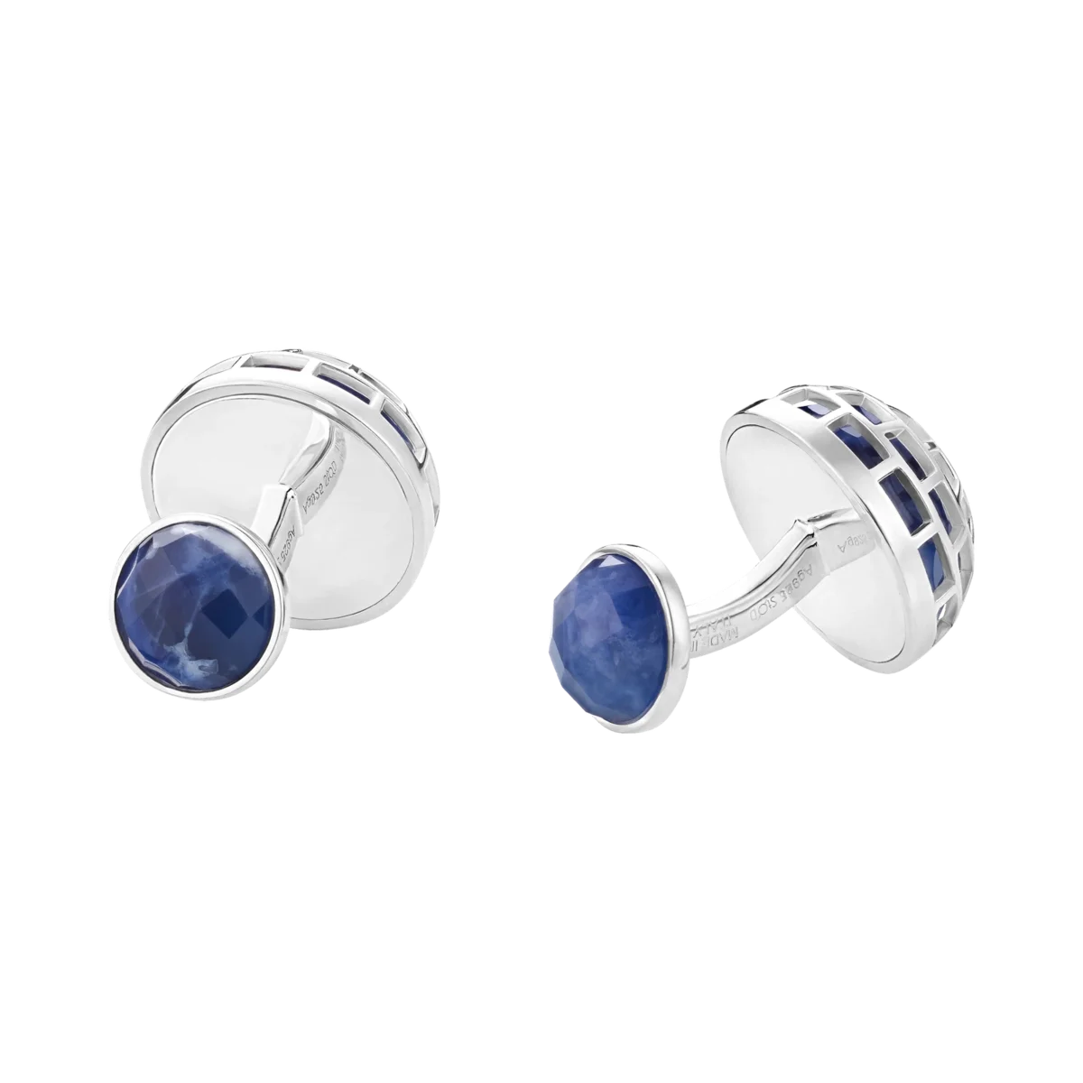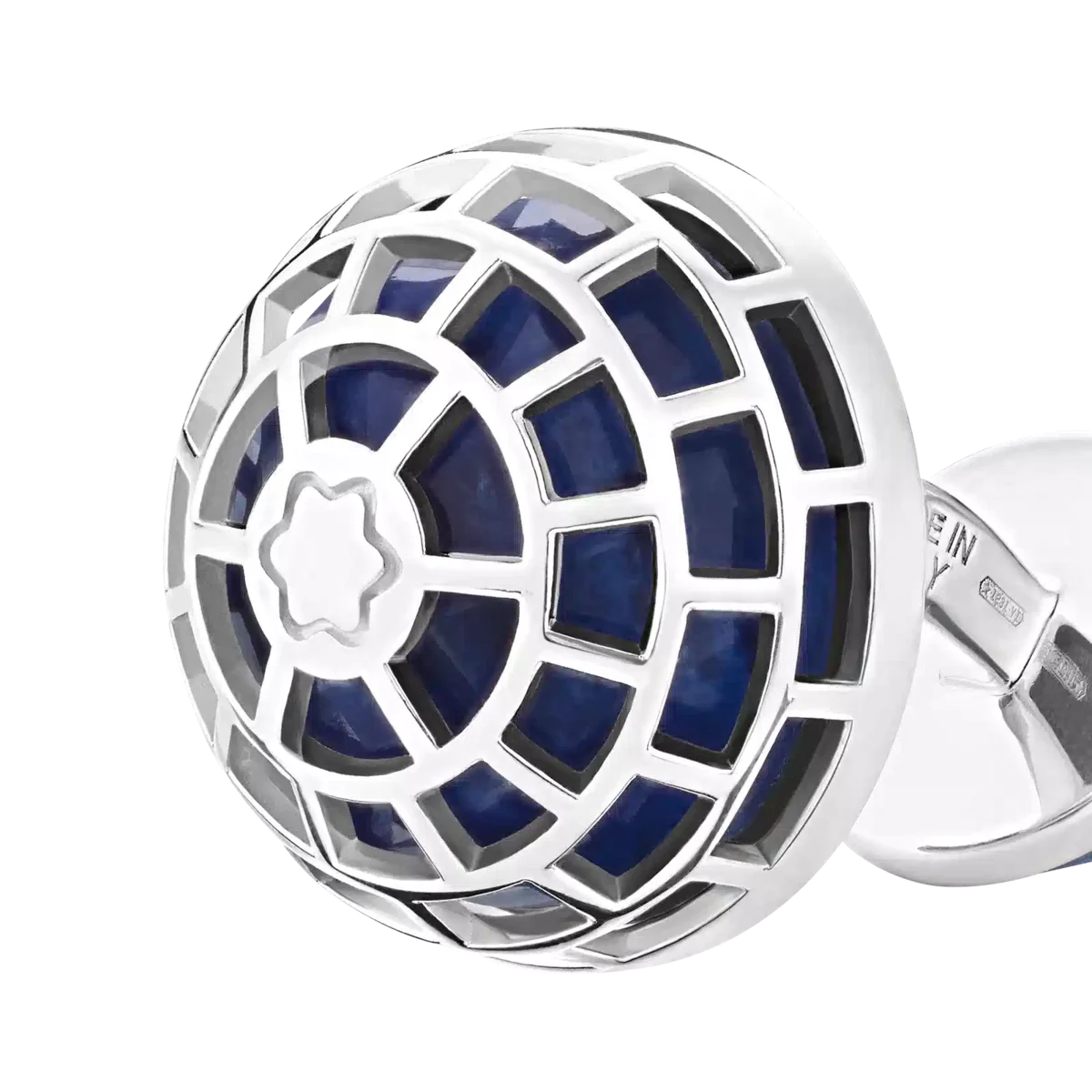 Estos gemelos Montblanc Meisterstück están fabricados en plata con una piedra de sodalita azul encerrada en una forma abovedada contemporánea y complementada con el emblemático emblema Montblanc grabado. La parte posterior de la pieza también está decorada con una piedra de sodalita redonda. N.º de identificación: MB128167. Peso físico: 10,8 g. Aviso legal sobre exportación: nuestros artesanos centran los emblemas manualmente, uno por uno. El emblema está colocado en el centro, pero la presión manual con la máquina puede desplazarlo. Se trata de una característica que no compromete la estética del producto y que, según nuestra política, no puede ser motivo de reclamación.