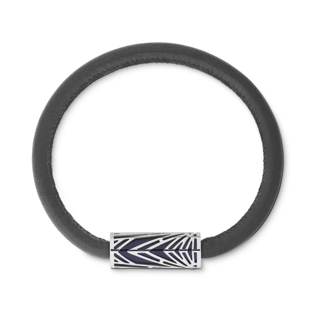 La joya tiene una pulsera de cuero negro y un tubo de acero inoxidable con revestimiento de PVD y laca azul (talla 68). Está inspirada en el patrón Solitaire de archivo.