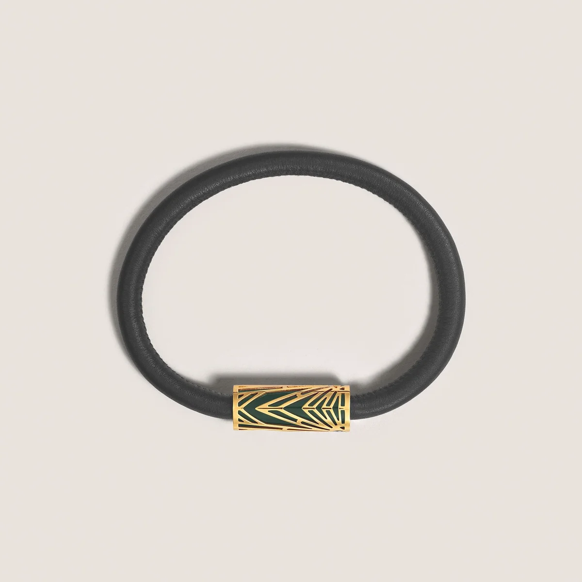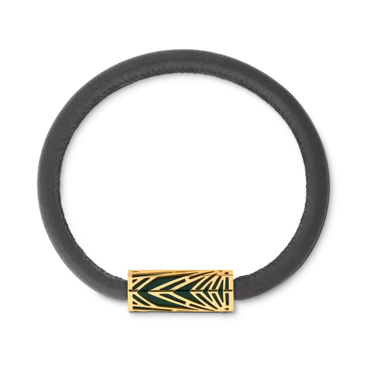 La joya tiene una pulsera de cuero negro y un tubo de acero inoxidable con revestimiento de PVD y laca verde (talla 68). Está inspirada en el patrón Solitaire de archivo.