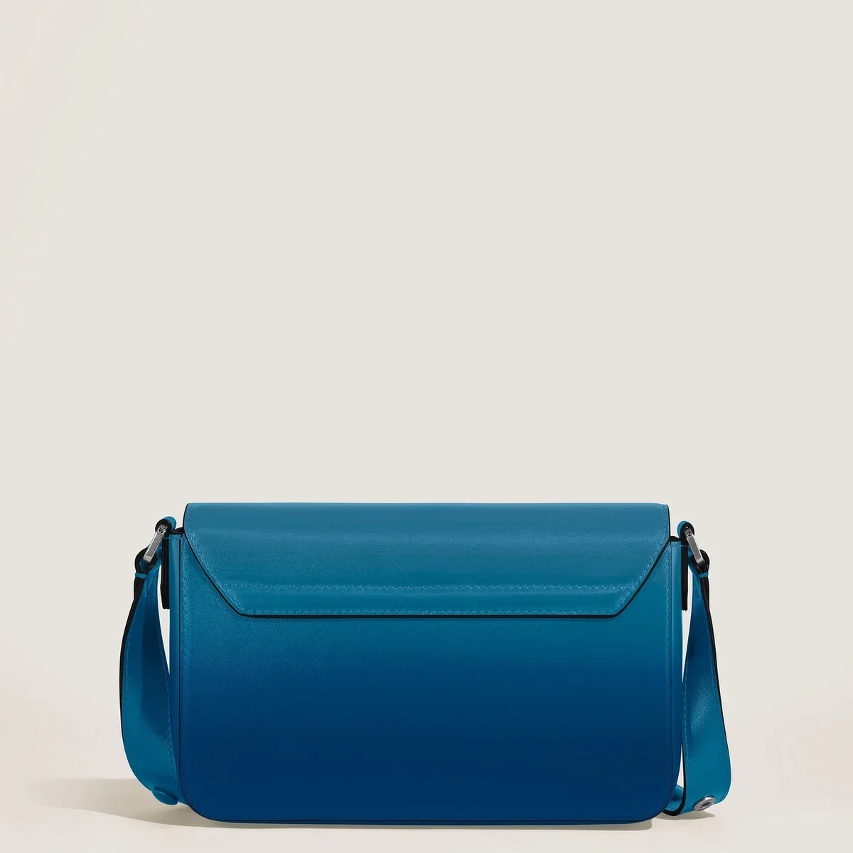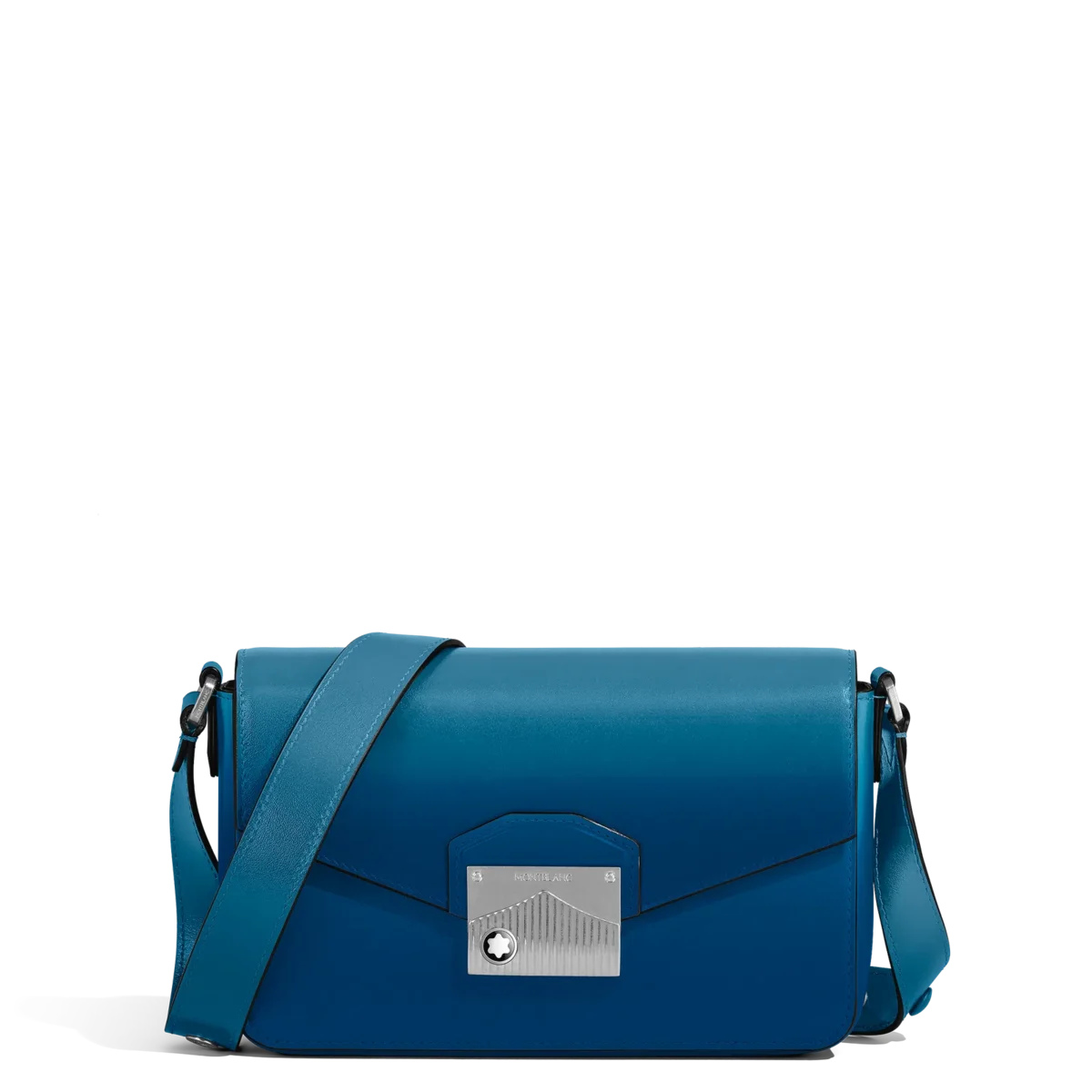 Descubra la nueva mini bandolera Meisterstück. Confeccionada en piel azul ahumada con efecto sfumato, cuenta con un elegante cierre de montaña inspirado en la silueta del Mont Blanc y adornado con un logotipo Montblanc ampliado. El compartimento principal es fácilmente accesible bajo la solapa, mientras que un bolsillo abierto en el interior permite guardar todo de forma organizada. Con una correa de hombro de piel ajustable, esta cartera ofrece estilo y funcionalidad para sus aventuras diarias. N.º de identificación: MB199278. Dimensiones: 210 mm * 50 mm * 120 mm. Peso físico: 450 g. Aviso legal exportable: los emblemas están centrados manualmente. 120 mm