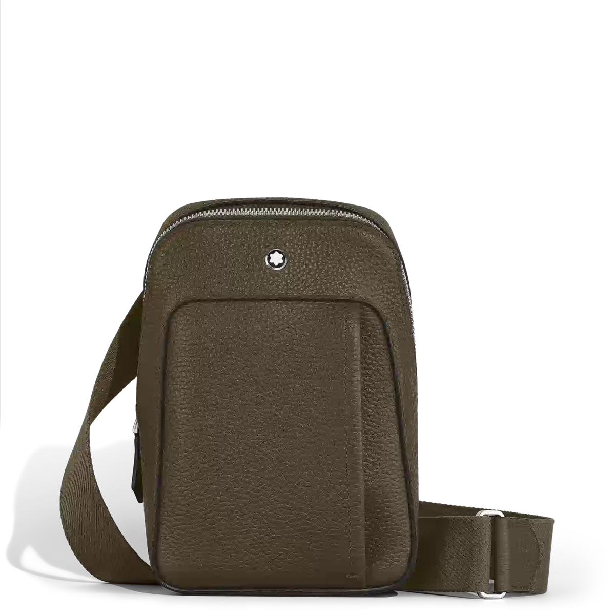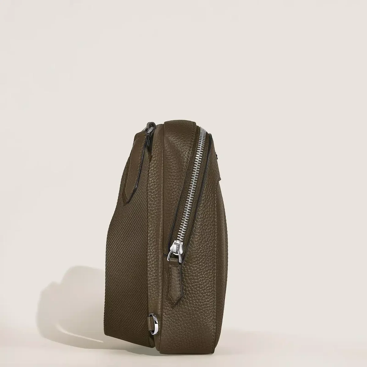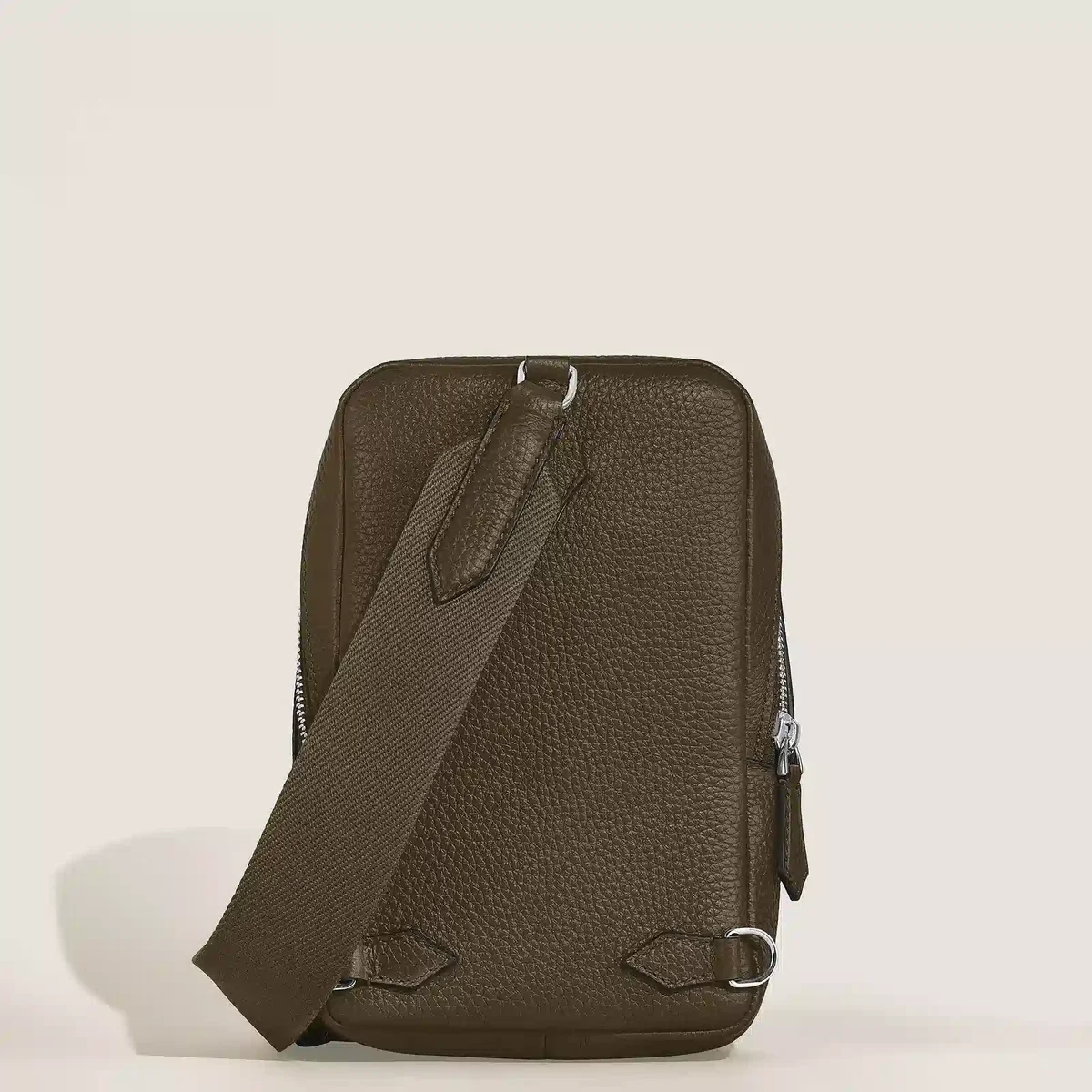 Este bolso para el día a día está confeccionado en suave piel granulada de color caqui y presenta formas suaves y elegantes, pensadas para quienes valoran el lujo sin esfuerzo y la facilidad de acceso. Perfecto para un estilo informal y dinámico, cuenta con cremalleras en forma de plumín y un compartimento principal con tres ranuras para tarjetas y un bolsillo abierto, además de un bolsillo exterior con cremallera para los objetos esenciales. Con su correa desmontable y ajustable, este bolso ofrece una forma sofisticada de llevar tus pertenencias cerca y accesibles.