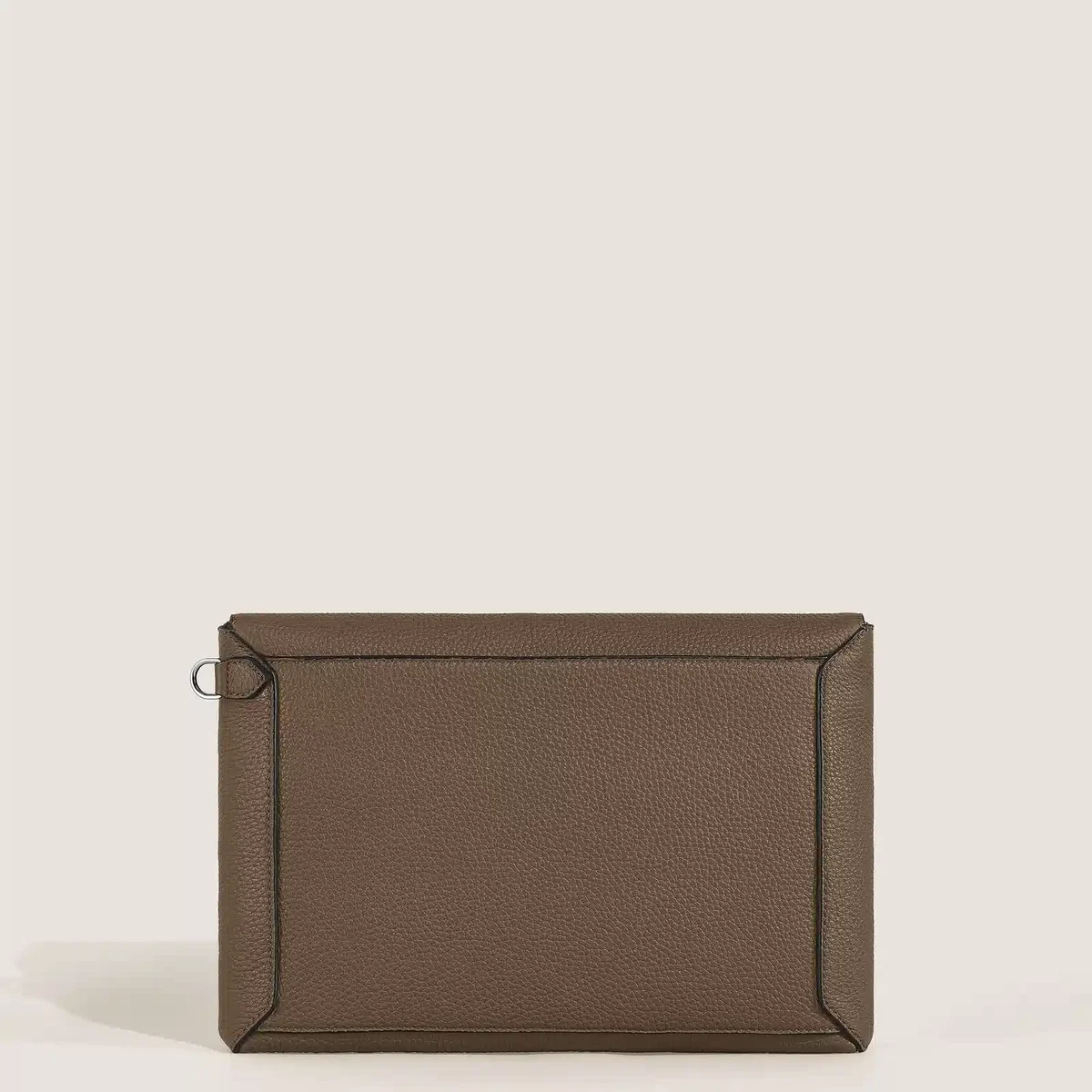 El bolso clutch combina la escritura de Montblanc con una funcionalidad refinada. Su diseño inspirado en un sobre está elaborado en piel granulada negra flexible de color noisette, con costuras de silla de montar que recuerdan el trazo de una pluma sobre una línea punteada. El exclusivo asa delantera en forma de plumilla permite sujetar cómodamente el bolso con una sola mano, mientras que la asa de muñeca desmontable le añade versatilidad. En el interior, incluye un compartimento principal, un bolsillo abierto y dos presillas para instrumentos de escritura, complementados con un bolsillo trasero para mayor practicidad. N.º de identificación MB220211