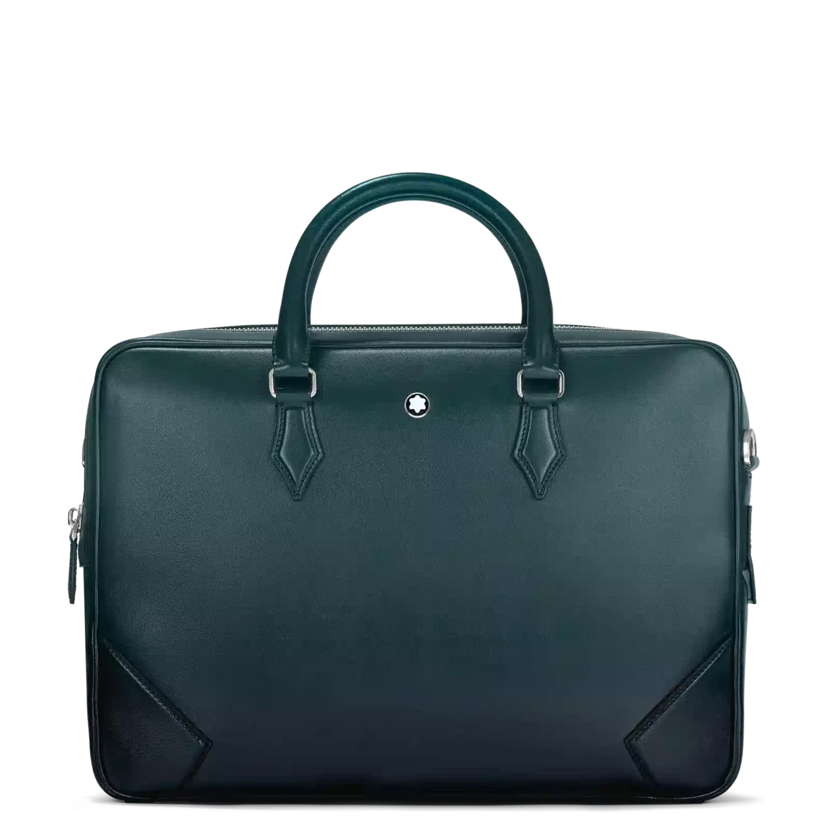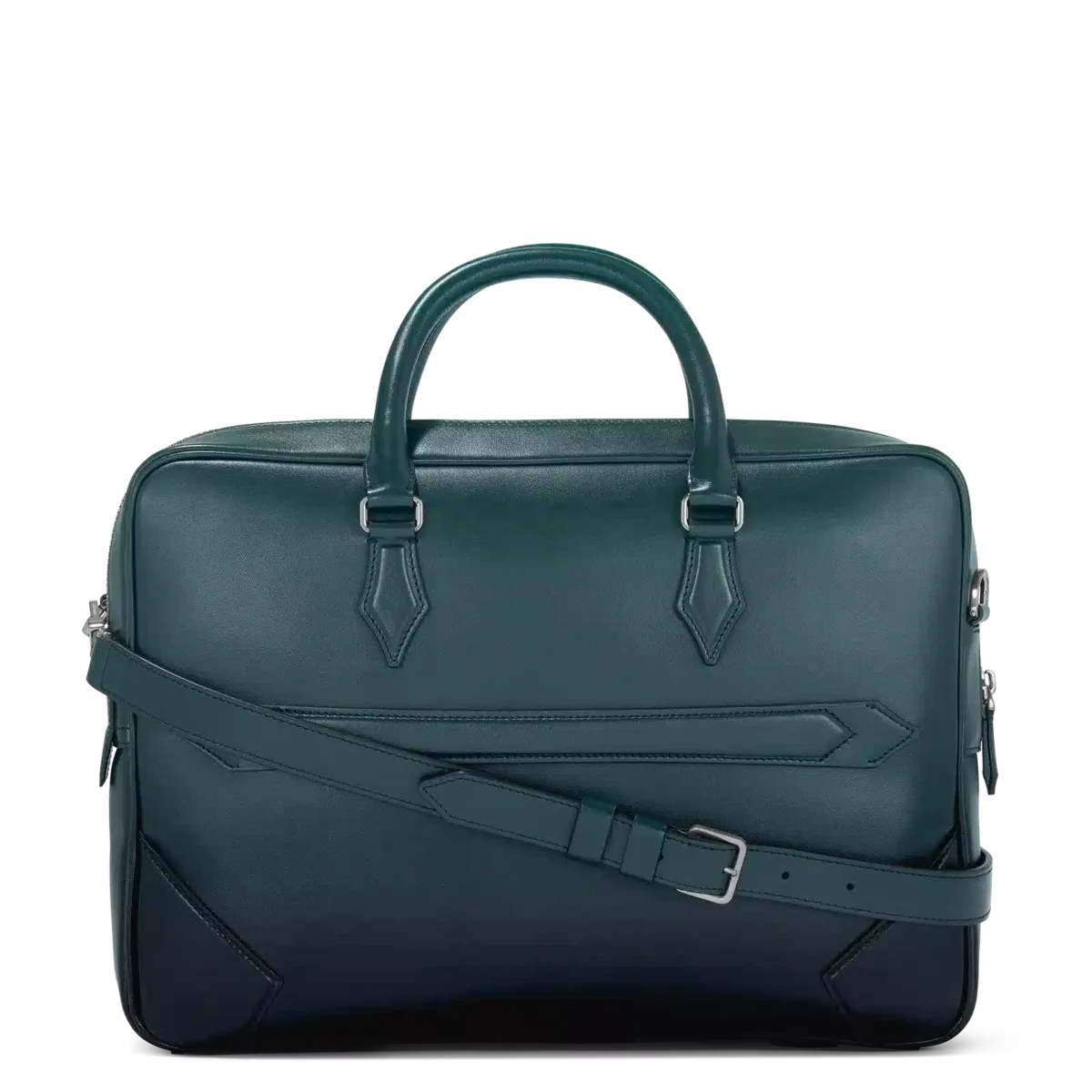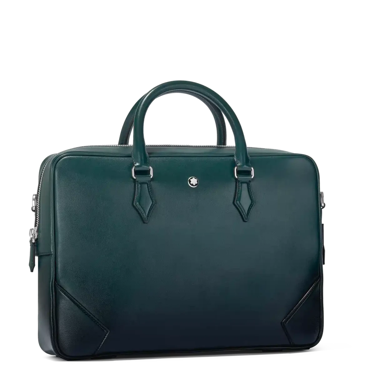 Experimente la esencia de la artesanía refinada con nuestro maletín Meisterstück, parte de nuestra exclusiva cápsula que celebra un siglo de artesanía Meisterstück. Confeccionado en piel verde británica con efecto sfumato, este elegante complemento refleja la esencia de Montblanc. Inspirados en la plumilla, las costuras, los tiradores de la cremallera y las asas rezuman elegancia. Con asas superiores de cuero, una correa para el hombro extraíble y un sistema satélite, ofrece múltiples opciones de transporte. En el interior encontrará un gran bolsillo abierto, un bolsillo con cremallera, dos bolsillos abiertos y dos presillas para instrumentos de escritura, lo que garantiza una organización perfecta. Mejore sus viajes de negocios con este sofisticado maletín para documentos, con capacidad para un ordenador portátil de hasta 13 pulgadas. N.º de identificación: MB198265