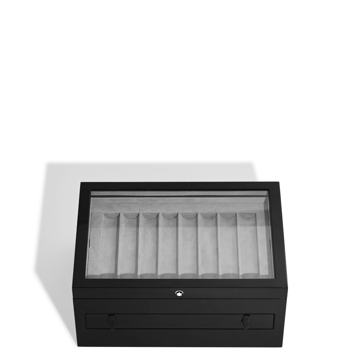 Caja de coleccionista Montblanc, fabricada en madera y lacada en negro con forro de ante beige. Tiene capacidad para 24 instrumentos de escritura en 3 compartimentos.