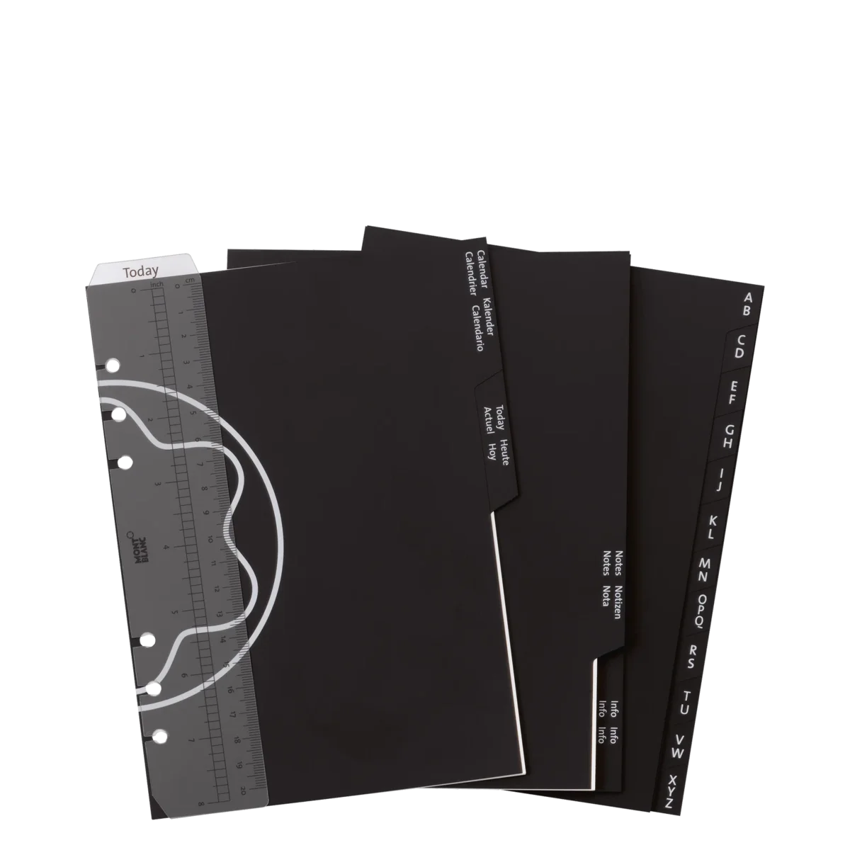 Kit de inicio grande. Juego de hojas divisorias, hojas en blanco, hojas de direcciones, mapa mundial, códigos de marcación internacional, resumen de boutiques, regla y 2 carpetas de plástico transparente para todas las agendas Montblanc de tamaño grande.