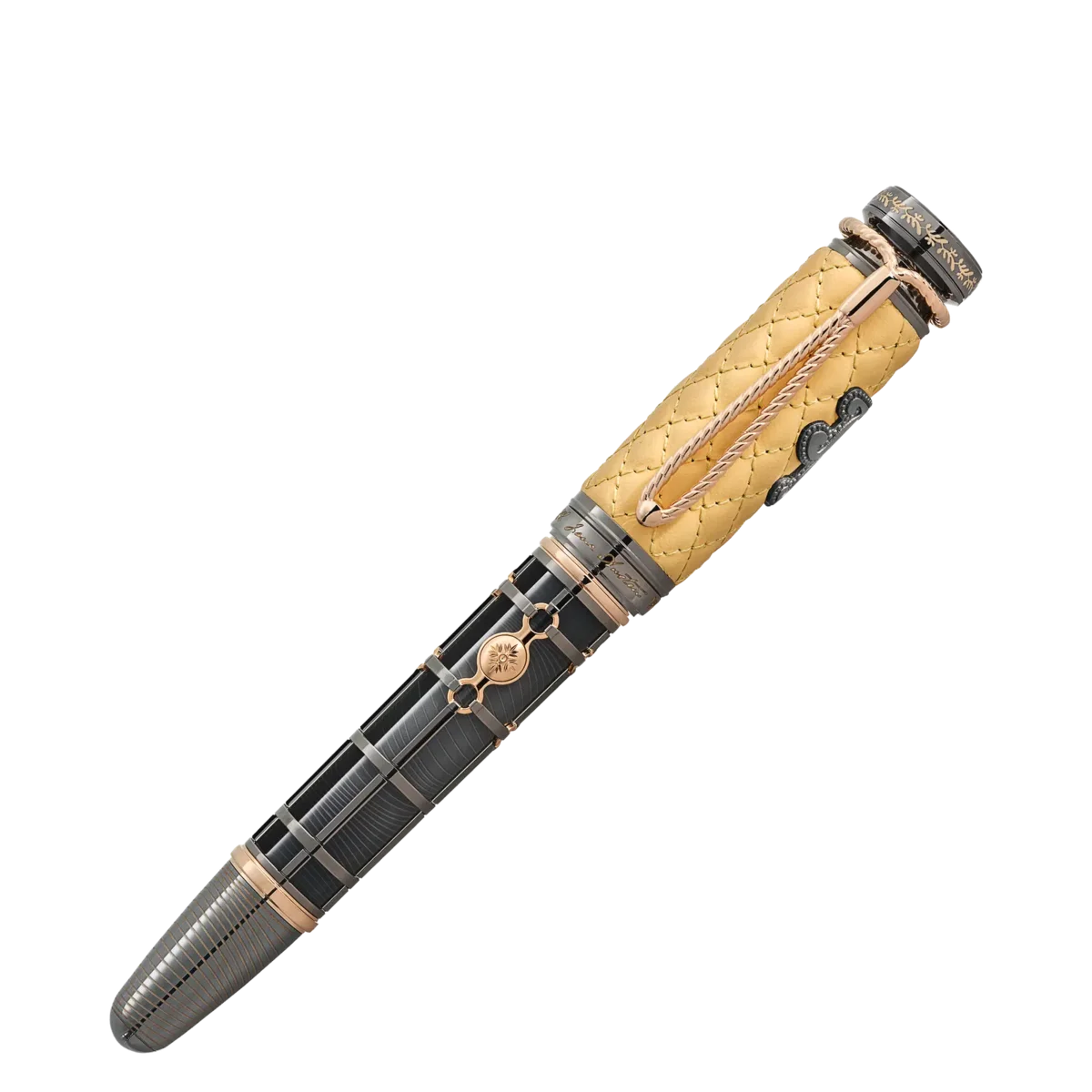 Pocos autores en la historia de la literatura han tenido la capacidad de crear diálogos y dar vida a los personajes con tanta elegancia, ironía y astucia como la autora británica Jane Austen. Montblanc ha creado la Writers Edition Homage to Jane Austen para rendir homenaje a una de las autoras más famosas de la literatura inglesa. Un elemento clave en la obra de Jane Austen es la experiencia de viajar, ya que los viajes y las excursiones suelen funcionar en sus narrativas como catalizadores tanto de encuentros románticos como de conflictos internos. Inspirándose en los carruajes tirados por caballos de la época, el recubrimiento esquelético de oro macizo Au 750 recubierto de rutenio del cuerpo del bolígrafo se asemeja a un arnés, mientras que el patrón ondulado de la laca degradada que hay debajo sugiere la melena ondulante de un caballo. A juego con el barril, el capuchón está fabricado en piel de vacuno inglesa amarilla repujada, inspirada en el interior de los elegantes carruajes de viaje. Está refinado con una incrustación de oro macizo Au 750 recubierto de rutenio con las iniciales de Jane Austen, tal y como aparecen en el estuche para cartas que le talló su hermano. En honor a la novela Orgullo y prejuicio, el anillo del capuchón de oro macizo Au 750 recubierto de rutenio lleva inscritos los números romanos LVI. Este número hace referencia al capítulo 56 de Orgullo y prejuicio, en el que Lady Catherine de Bourgh se apresura en carruaje a visitar a la señorita Bennet para «aclarar las cosas» y sofocar cualquier esperanza de matrimonio.Su estilo de escritura resultó muy popular y las primeras ediciones de sus obras se agotaron rápidamente, pero nadie fuera de su familia sabía que ella era la autora.La portada de su novela Sentido y sensibilidad, publicada en 1811, solo indicaba que la obra había sido escrita «por una dama». Esta declaración de autoría adorna la parte superior del capuchón de la Writers Edition Homage to Jane Austen Limited Edition 97, junto con el emblema de Montblanc en oro macizo Au 750. La silueta del instrumento de escritura se asemeja a un sello de cera, similar al que habría utilizado Jane Austen. El clip recubierto de oro de la Writers Edition Homage to Jane Austen Limited Edition 97 es tan inusual como su capuchón. Con forma de cordón trenzado con cierre de cordón, se asemeja al de una bolsa (retícula) utilizada para llevar polvos, un espejo y el indispensable pañuelo de bolsillo. La única silueta conocida de Jane Austen, que muestra sus delicados rasgos, está inmortalizada en un grabado artístico en el plumín bicolor de oro macizo Au 750 hecho a mano. La parte delantera y los accesorios de oro macizo Au 750 añaden los toques finales al diseño. Limitado a solo 97 piezas, en referencia al año original de publicación de Orgullo y prejuicio, 1797.N.º de identificación: MB130684 Peso físico: 81,8 g Dimensiones: 18 mm * 18 mm * 18 mm