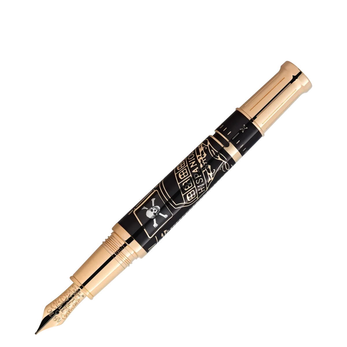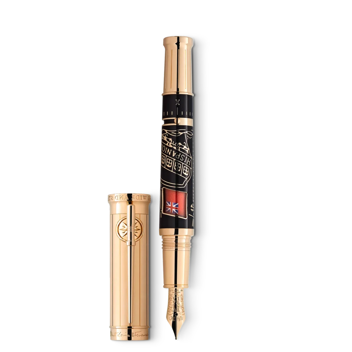 Robert Louis Stevenson, nacido en Edimburgo, Escocia, en 1850, tenía dos grandes deseos: la libertad y sumergirse en otros mundos. Compuso ensayos y relatos de viajes, así como sus legendarias historias de aventuras pobladas de personajes sorprendentes cuyos nombres hacen temblar a los lectores de todo el mundo: Long John Silver, el capitán Flint, Jekyll y Hyde. La Montblanc Writers Edition Homage to Robert Louis Stevenson está dedicada a este imaginativo narrador. La novela «La isla del tesoro» inspiró muchos detalles del diseño de la edición. La forma general del instrumento de escritura y los anillos del cono se combinan para crear la impresión de un histórico catalejo extensible. Recorriendo la historia de «La isla del tesoro», esta edición muestra el famoso Hispaniola en el cuerpo, revestido de preciosa laca negra. Al embarcarse en un viaje, el Hispaniola ondea una bandera británica detrás de una pequeña ventana. Siguiendo la trama del motín de los piratas, la bandera se puede girar con una pequeña perilla para revelar una bandera pirata. Las líneas verticales que recuerdan a las tablas de la goleta «Hispaniola» y un cofre marino tradicional adornan el característico capuchón recubierto de oro. Detrás del característico clip recubierto de oro, las líneas convergen en una rosa de los vientos, mientras que el clip imita la forma de un pasador de amarre, al que se sujetarían las líneas del aparejo de un barco. La parte superior del capuchón está coronada por el emblema de Montblanc en nácar. El anillo del capuchón está adornado con un grabado de la firma de Stevenson. Como referencia a la pasión de Robert Louis Stevenson por la navegación y su reasentamiento en los mares del sur, el plumín de oro macizo Au 750 hecho a mano está grabado con nubes, gaviotas y el título que los samoanos dieron al gran escritor y viajero mundial, «Tusitala».Con el oro característico y/o el recubrimiento de oro característico, Montblanc describe el tono iluminado del oro amarillo que se ha convertido en un tono muy apreciado para los instrumentos de escritura de la Maison.N.º de identificación: MB129521 Peso físico: 106,71 g Dimensiones: 146,7 mm * 18,4 mm