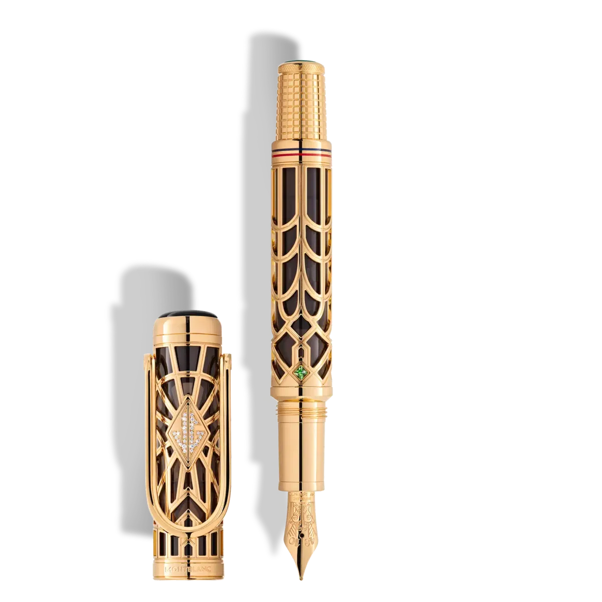 Hay novelas que pasan a la historia de la literatura y, al mismo tiempo, se convierten en símbolo de toda una época. El gran Gatsby, de F. Scott Fitzgerald, es una de esas joyas de la literatura estadounidense moderna. Publicada en 1925, la novela pinta un cuadro fascinante de la era del jazz y los locos años veinte, una época de riqueza y autoindulgencia sin precedentes. La vibrante ciudad de Nueva York, las opulentas mansiones de Long Island y las deslumbrantes fiestas de la alta sociedad son el telón de fondo de la historia de Jay Gatsby, un misterioso millonario que no se detendrá ante nada para recuperar el amor perdido de su juventud, Daisy Buchanan. Montblanc rinde homenaje a esta obra maestra literaria, tan filmada y sinónimo del glamuroso mundo del Art Déco, con la edición limitada Great Characters Homage to The Great Gatsby 100. El Art Déco confería un brillo glamuroso a todo. La arquitectura literalmente irrumpió en el plano bidimensional y se elevó hacia el cielo, simbolizando el progreso y la emancipación. Sus arcos decorativos, escalones, ángulos y líneas irregulares dotaron a los edificios de una dinámica y una estética inconfundibles, y claramente también inspiraron esta edición limitada. Los arcos y líneas simétricos esqueletizados, elaborados en oro amarillo macizo Au 750, revelan la superficie negra y translúcida que hay debajo. Las brillantes tsavoritas verdes de la tapa y el barril hacen referencia a la luz verde del muelle de la casa de Daisy, símbolo de esperanza para el millonario enamorado Jay Gatsby, más conocido como El gran Gatsby. Las imágenes del producto pueden diferir del producto real. Jay Gatsby es la encarnación de un ideal universal, el hombre hecho a sí mismo estadounidense. Sin embargo, detrás de la fachada de riqueza de Gatsby, el sueño comienza a desmoronarse. Su riqueza proviene del comercio de alcohol durante la época de la Ley Seca, cuando la bebida prohibida se envasaba a menudo en pequeñas botellas con tapón de rosca fáciles de ocultar. Cada gota era preciosa. En consecuencia, no solo se veneraba el contenido, sino también el diseño de los petacas. Para la edición limitada Great Characters Homage to The Great Gatsby 100, el cono imita el tapón de rosca grabado de una petaca Art Déco. El mito del sueño americano se evoca en los finos anillos con los colores de la bandera estadounidense que adornan el cono. Al igual que la capa esquelética, los accesorios de la edición están hechos de oro amarillo macizo de 750 milésimas, ya que el oro es el símbolo de la riqueza, el poder y el estatus, y el color amarillo es el que más se menciona en la novela. Por el contrario, el tapón y el cuerpo, de color negro intenso y translúcido, representan la corrupción y la decadencia moral que se esconde tras la brillante fachada de la sociedad acomodada. La radiante luz verde que brilla cada noche en el muelle de la casa de Daisy es el único rayo de esperanza y se representa aquí, junto con la tsavorita del tapón y el cuerpo esqueletizados, mediante una incrustación de malaquita verde en el cono. Representa el anhelo de un futuro mejor y el deseo de Gatsby de recuperar a Daisy. Sin embargo, su amor sigue sin ser correspondido, inalcanzable a pesar de toda su riqueza. El poder embriagador, pero aparentemente ilusorio, del dinero está simbolizado por el clip recubierto de oro en forma de pinza para billetes. Su abertura redondeada está decorada con las iniciales de Jay Gatsby, engastadas en diamantes, en forma de monograma romboidal Art Déco. El emblema de Montblanc que corona la pieza está hecho de nácar rodeado de ónix negro, una combinación de materiales que inspiró algunas de las creaciones más elegantes de los diseñadores de joyas del periodo Art Déco. La elegancia de sus líneas es el motivo clave del Art Déco, llamativo y sofisticado al mismo tiempo.Un grabado puramente lineal también adorna el plumín de oro macizo Au 750 hecho a mano. La cifra 100 es significativa en más de un sentido. Indica el número limitado de piezas de la edición limitada Great Characters Homage to The Great Gatsby 100, en alusión al centenario del personaje de ficción, es decir, el centenario de la publicación de la novela. Además, hace referencia al mundo del dinero y al billete de dólar de mayor denominación en circulación en ese momento. N.º de identificación: MB130686 Peso físico: 103,6 g Dimensiones: 145 mm * 21 mm * 21 mm