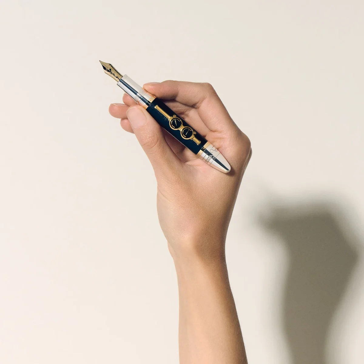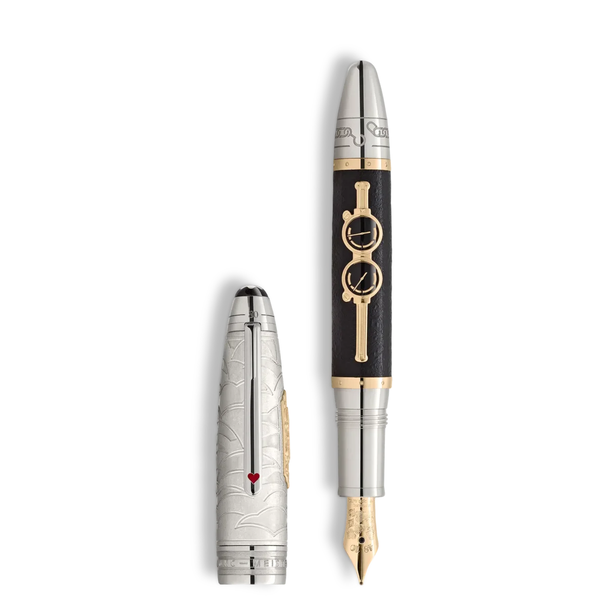 La colección Meisterstück Around the World in 80 Days se inspira en la famosa novela de aventuras de Julio Verne. La pluma estilográfica Limited Edition 811, fabricada en plata de ley Ag 925 y laca estructurada, narra el épico viaje del Sr. Fogg y Passepartout. Embarcándose en la última etapa de su viaje desde Yokohama de regreso a Londres pasando por Estados Unidos, el dúo atraviesa el vasto continente americano en tren, lo que se representa en el cartucho de oro macizo Au750 / 18k incrustado en el capuchón de plata esterlina Ag925. El diseño del capuchón captura el humo ondulante de la locomotora, mientras que una incrustación en 3D que representa las válvulas de presión adorna el cuerpo texturizado. El clip luce un naipe de corazones lacado en rojo, que simboliza la unión entre Phileas Fogg y la princesa Aouda. Además, los naipes representan la atrevida apuesta de Fogg de completar el viaje en solo 80 días. La parte superior del capuchón lleva grabada la cronología del viaje: 36 días de Yokohama a Londres, que culminan en un total de 80 días alrededor del mundo. El cono presenta un patrón de cadena de seguridad, que refleja un momento crucial en el que Passepartout separa el tren de la locomotora para salvar a la tripulación que fue atacada por los sioux. El instrumento de escritura está rematado con un plumín de oro de 18 quilates hecho a mano, adornado con una espinela negra de 1,5 mm y un patrón de naipes.N.º de identificación: MB132900 Peso físico: 107,224 g Dimensiones: 147,5 mm * 20,2 mm