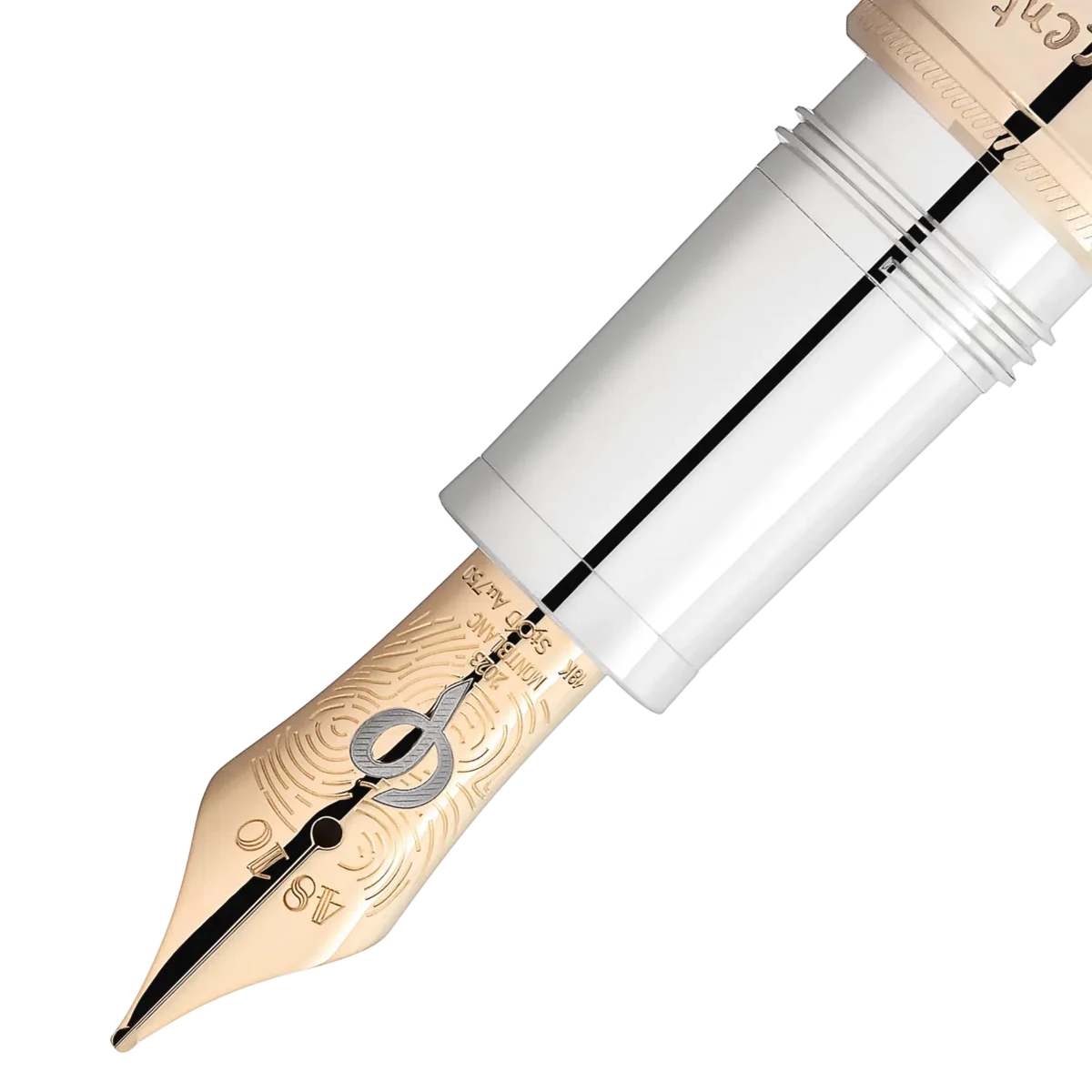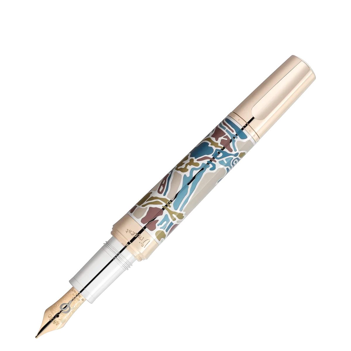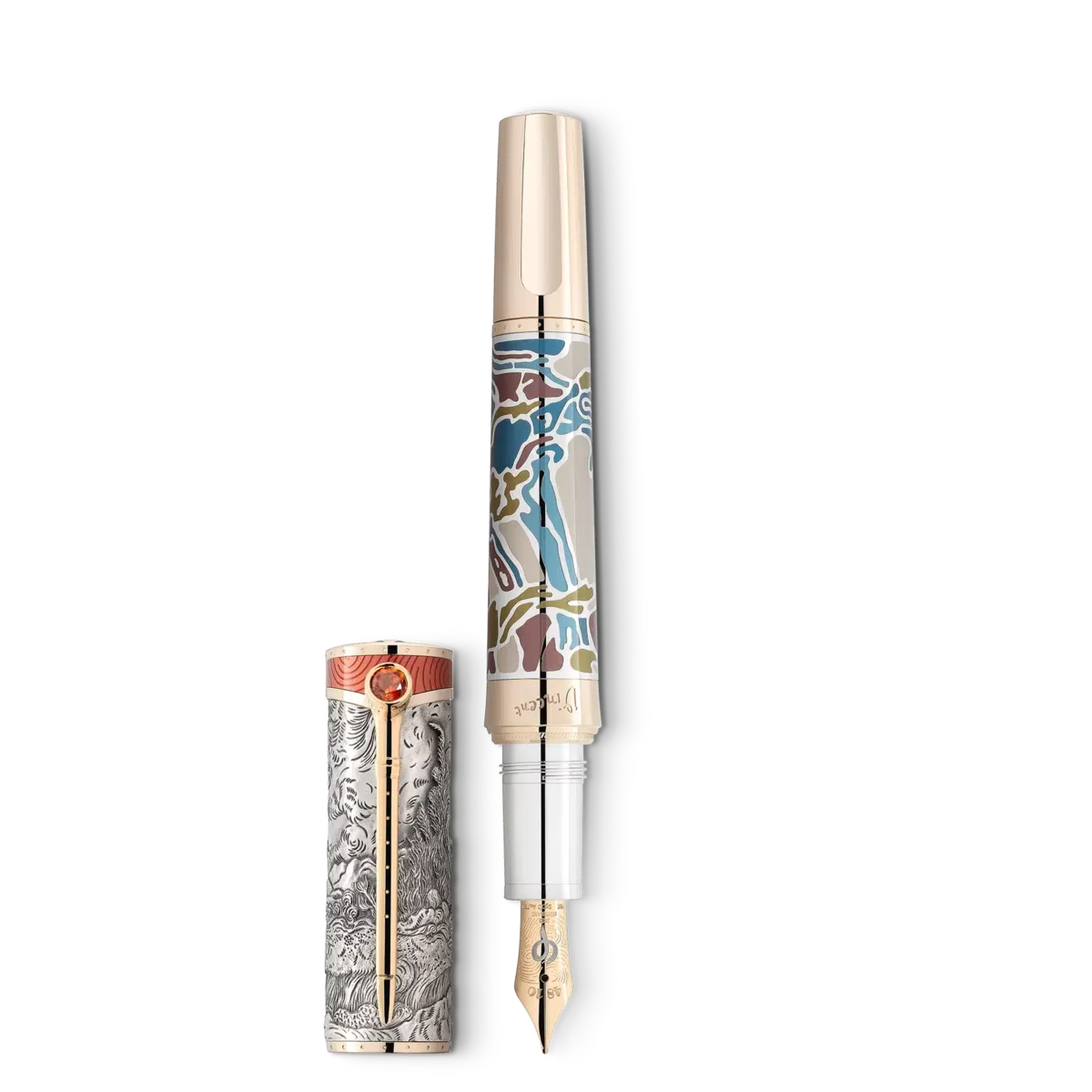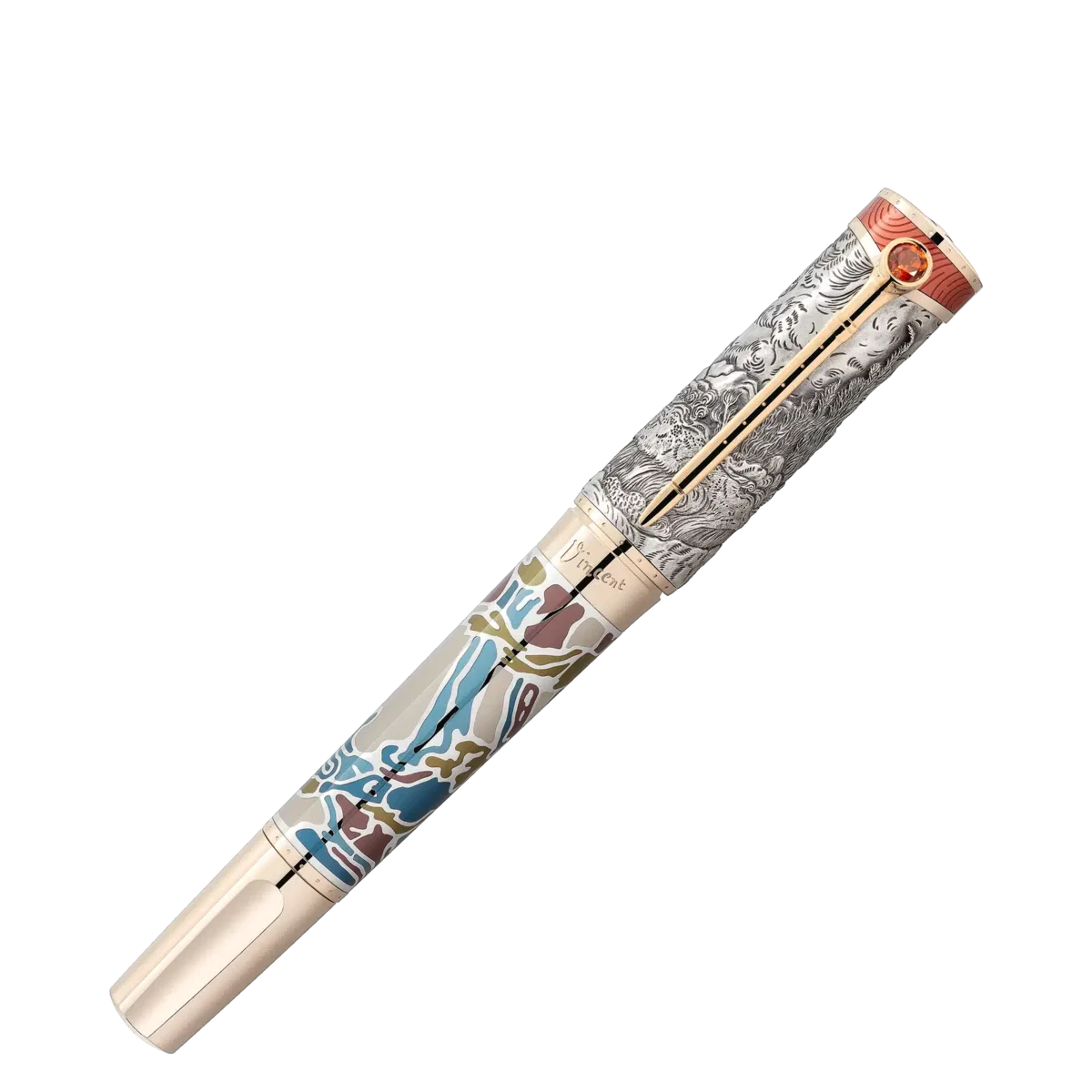 Con la edición limitada 161 Masters of Art Homage to Vincent van Gogh, Montblanc rinde homenaje a Vincent van Gogh, uno de los pintores más populares de finales del siglo XIX. Esta edición hace especial hincapié en su estancia en Saint-Rémy-de-Provence y Auvers-sur-Oise, con detalles de diseño que reflejan, entre otras cosas, su última obra, Raíces de árboles. En Saint-Rémy y Auvers-sur-Oise, Van Gogh perfeccionó su habilidad para pintar escenas naturales tal y como las veía a través del prisma de sus emociones. Campo de trigo y cipreses es una de esas pinturas, que muestra un cielo impetuoso sobre un paisaje lleno de movimiento. Van Gogh pintó esta vista desde el manicomio de Saint-Rémy en tres ocasiones. Su dibujo de la misma vista, realizado con lápiz, pluma de caña y tinta, se interpreta en el grabado de la tapa de plata de ley Ag 925.El grabado 1890 en el anillo del cuerpo, junto a la firma de Vincent en azul, conmemora el año en que dibujó su último cuadro, Raíces de árboles. El cuerpo de plata esterlina Ag 925 está decorado con incrustaciones de laca cuyo diseño y colores se inspiran en Raíces de árboles, que representa un grupo de árboles con las raíces al descubierto por la erosión en la ladera de una colina. Van Gogh desarrolló un estilo más suelto y libre, y llegó a dominar por igual el pincel y la espátula, que utilizaba para crear obras gruesas e impetuosas con «impasto». Su espátula inspiró el clip, mientras que su amplia pincelada quedó inmortalizada en la laca de la parte superior del capuchón. Además, su afición por fumar en pipa, a la que alude en muchos de sus autorretratos, queda plasmada en un sutil detalle del clip: la parte superior tiene la forma de la cazoleta de una pipa y está decorada con un citrino. Como homenaje a la fascinación de Vincent por los grabados tradicionales japoneses en madera, la forma general se inspira en un cuchillo japonés para tallar madera. La forma en que Van Gogh encontró inspiración en el arte japonés demuestra la universalidad del arte y de conceptos artísticos como la proporción áurea, o 1,61 (Phi), que no solo sirvió de inspiración para el grabado del símbolo Phi en el plumín artesanal de oro macizo Au 750, sino también para la limitación a 161 piezas.Los numerosos impulsos creativos de Van Gogh se simbolizan en las facetas de laca azul que coronan la parte superior del capuchón. Incrustado en este campo azul, como una de las brillantes estrellas de Vincent, una imagen que se repite en sus obras, se encuentra el emblema de Montblanc en oro macizo Au 750. Con el oro de la firma y/o el recubrimiento de oro de la firma, Montblanc evoca el tono iluminado del oro amarillo, que se ha convertido en un tono muy apreciado para los instrumentos de escritura de la Maison. N.º de identificación MB129161 Peso físico 146 g