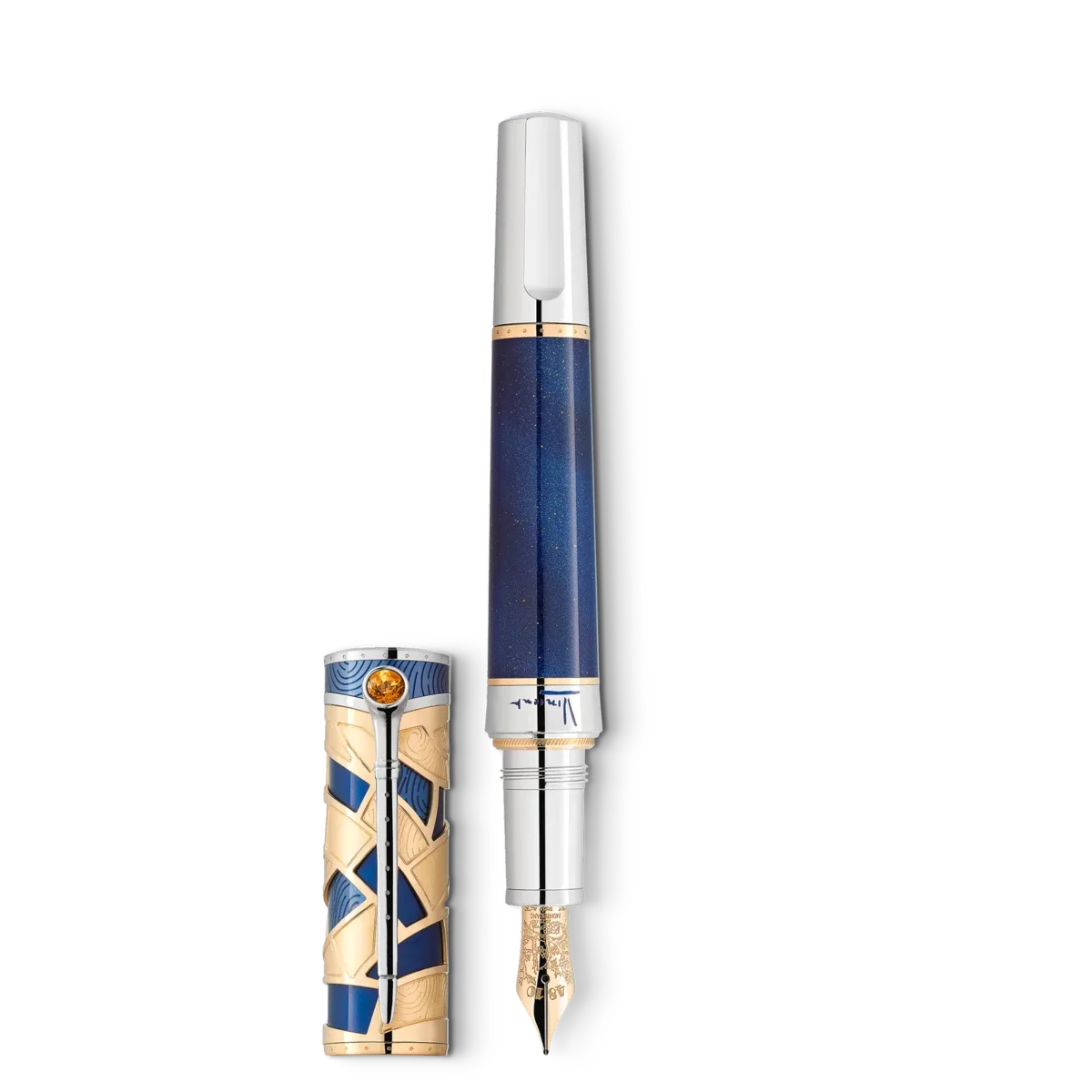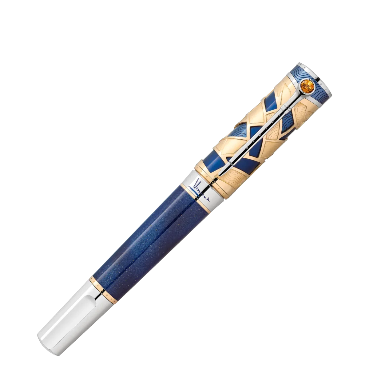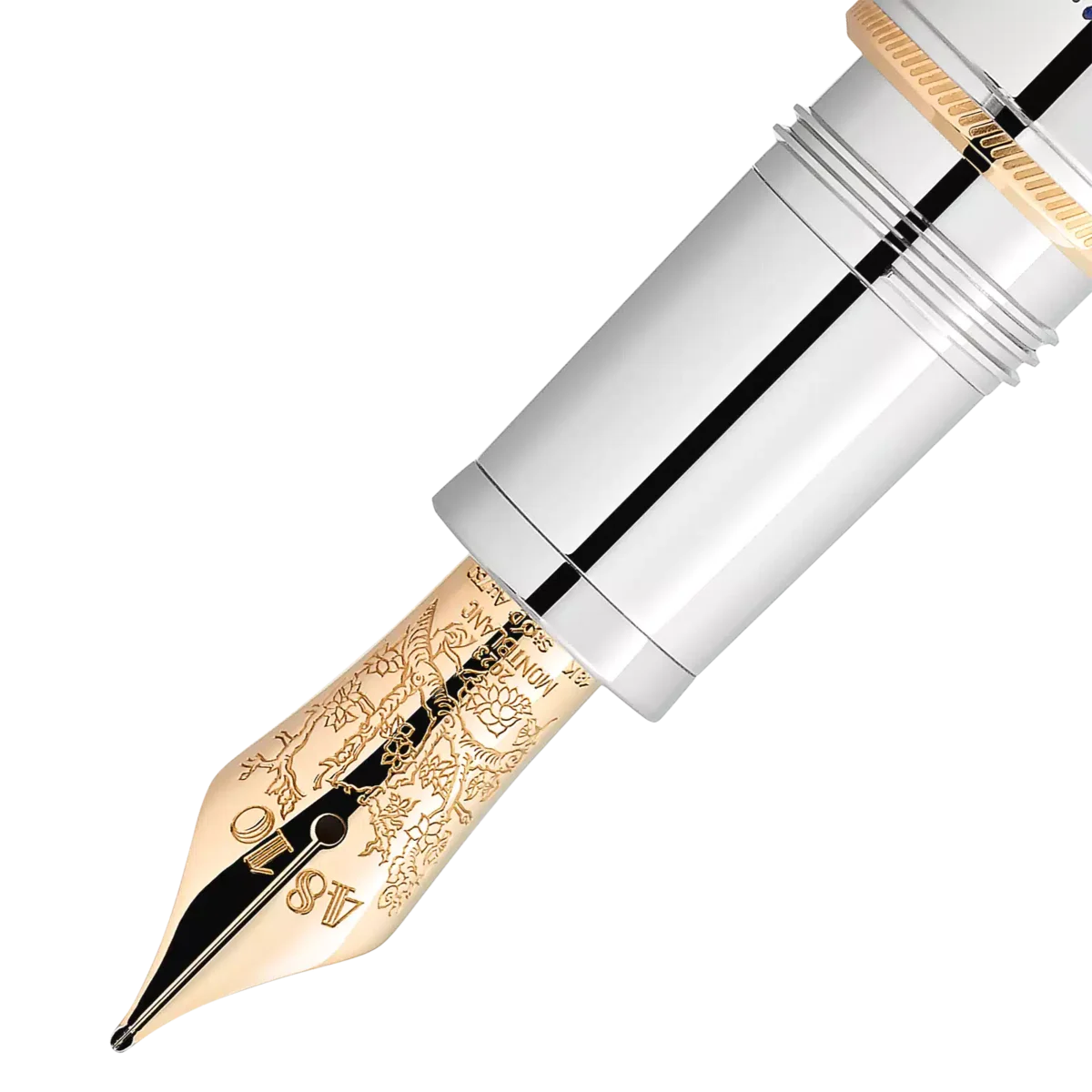 Con la edición limitada Montblanc Masters of Art Homage to Vincent van Gogh 888, Montblanc rinde homenaje a Vincent van Gogh, uno de los pintores más populares de finales del siglo XIX. Esta edición hace especial hincapié en su estancia en Saint-Rémy-de-Provence y Auvers-sur-Oise, con detalles de diseño que reflejan los cielos provenzales y uno de sus cuadros más famosos, «Campo de trigo con cuervos». El año 1889 grabado en el anillo del cuerpo, junto a la firma de Vincent en laca azul, conmemora el año en que se mudó a Saint-Rémy. Vincent Van Gogh creó impresiones memorables de los jardines y campos de trigo cercanos al manicomio donde vivía. Pinturas como el famoso «Campo de trigo con cuervos», de este periodo, marcaron su madurez como artista e inspiraron la composición cromática del capuchón de la edición. Los cielos azules provenzales y los campos de trigo dorados se reflejan en incrustaciones de laca translúcida en diferentes tonos de azul y en el recubrimiento esquelético de oro amarillo macizo Au 750. Las estrellas que brillan en el cielo nocturno sobre los campos de trigo están representadas por las partículas centelleantes de la laca azul del cuerpo y en el emblema Montblanc de oro amarillo macizo Au 750 de la parte superior del capuchón, incrustado en laca azul. Vincent van Gogh creó más de 200 pinturas en el sur de Francia, desarrollando un estilo más suelto y libre y adquiriendo la misma destreza con el pincel y la espátula, que utilizaba para crear un estilo «impasto» grueso e impetuoso. Su espátula inspiró el clip recubierto de platino, mientras que su amplia pincelada queda inmortalizada en la laca azul de la parte superior del capuchón. Además, su afición por fumar en pipa, a la que alude en muchos de sus autorretratos, queda plasmada en un sutil detalle del clip: la parte superior tiene la forma de la cazoleta de una pipa y está adornada con un citrino amarillo.La imagen grabada en el plumín de oro amarillo macizo Au 750 inmortaliza el cuadro de Vincent «Almendro en flor». Su estilo de inspiración japonesa se remonta a una admiración por el arte japonés conocida en aquella época como japonismo. La silueta general tiene la forma de un cuchillo japonés para tallar madera, como símbolo de la fascinación personal de Van Gogh por los grabados tradicionales japoneses en madera. N.º de identificación MB129159 Peso físico 120,1 g Dimensiones 146,5 mm * 18 mm