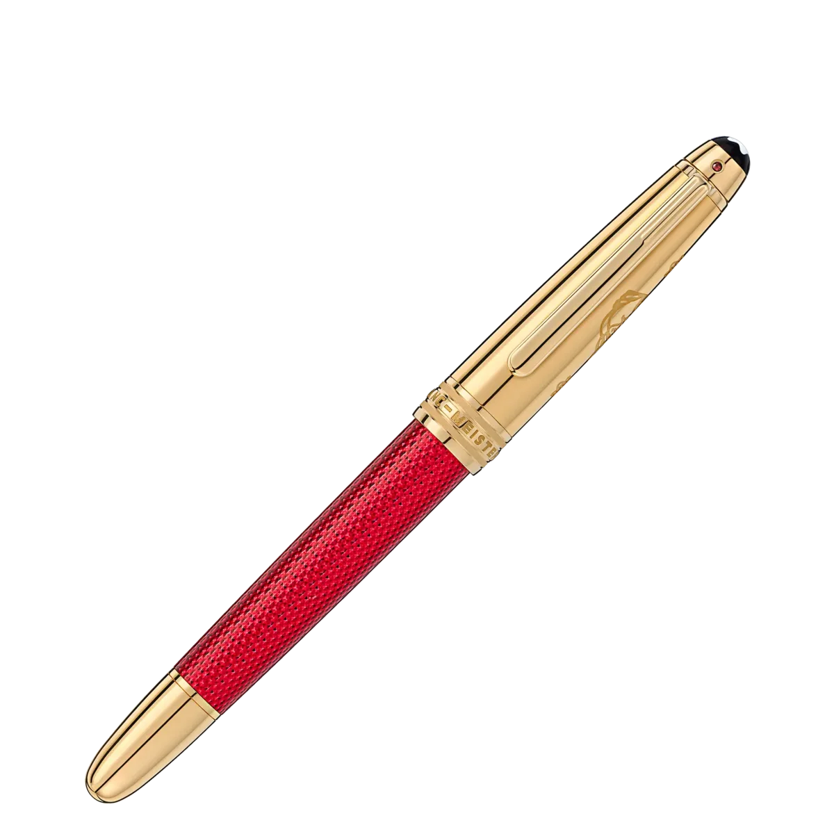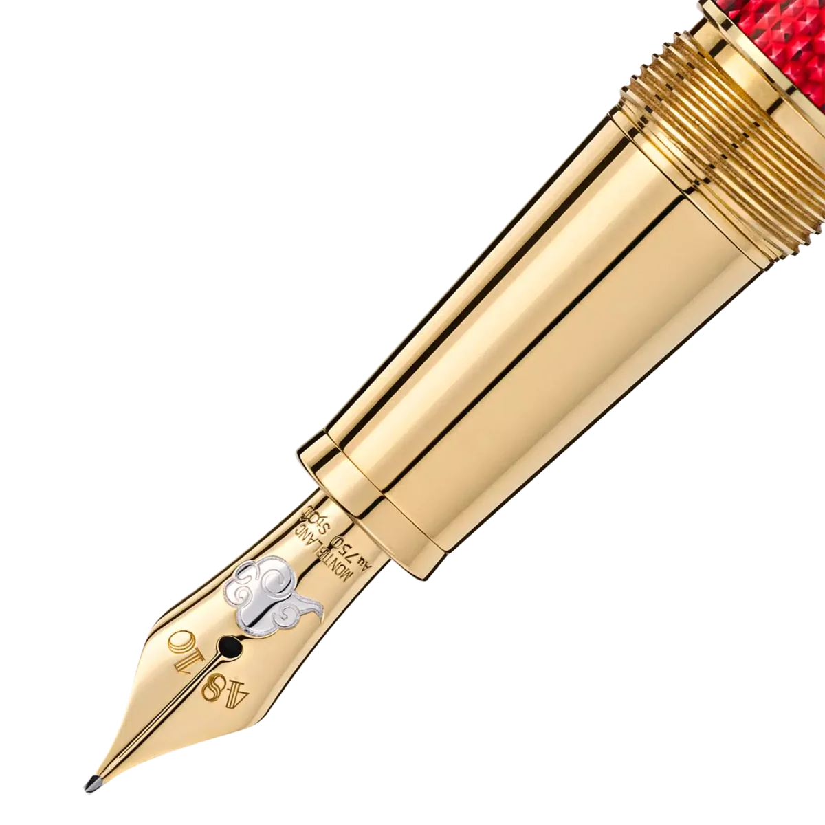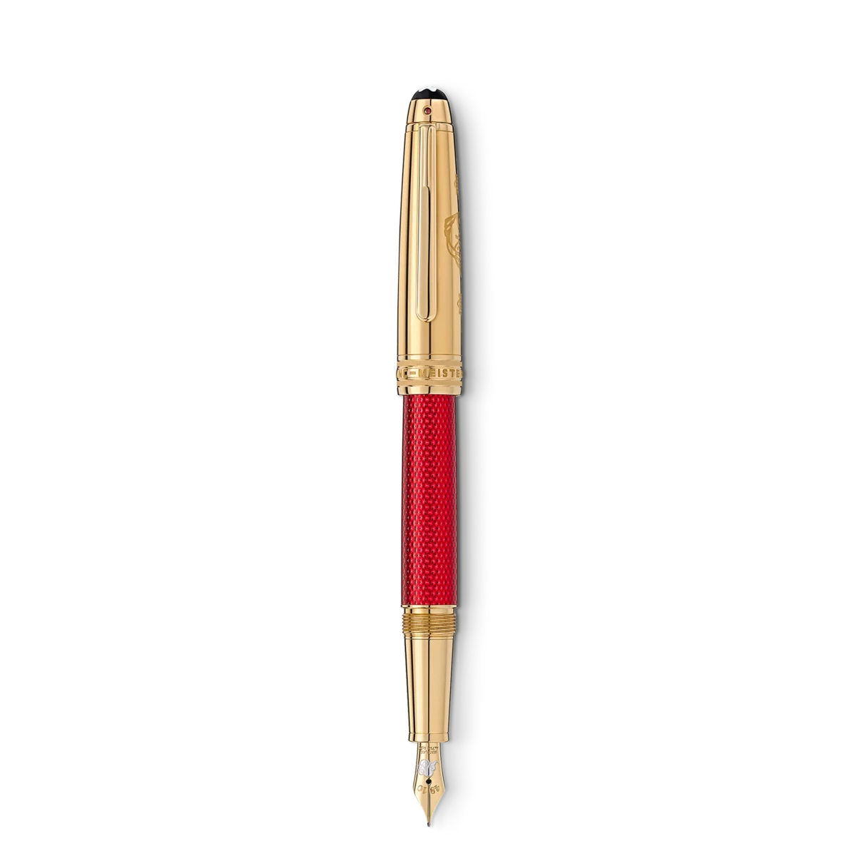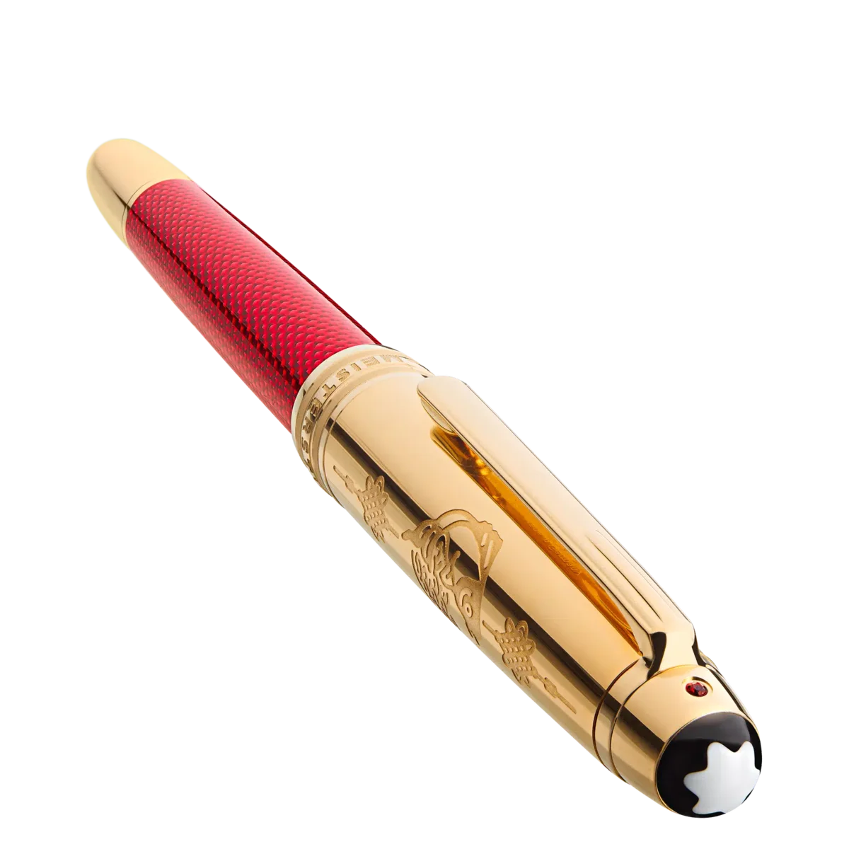 La Meisterstück Solitaire Doué Red Hour es una edición especial que rinde homenaje a algunos de los símbolos chinos más antiguos. Se presenta como una preciosa pluma estilográfica lacada en rojo con accesorios recubiertos de oro. El color rojo del cuerpo simboliza la suerte y la felicidad en la cultura tradicional china. El capuchón está adornado con un diseño que combina nudos chinos y carpas koi, que también son símbolos de suerte. La parte superior del capuchón está engastada con un rubí de 1,5 mm y el plumín de oro está grabado con «nubes auspiciosas» recubiertas de rodio, un símbolo que transmite buena fortuna, suerte, alegría y felicidad.N.º de identificación: MB130203 Peso físico: 50 g Dimensiones: 140 mm * 14,1 mm