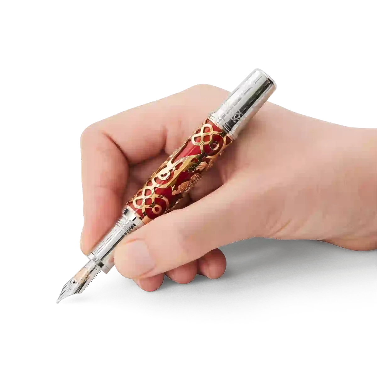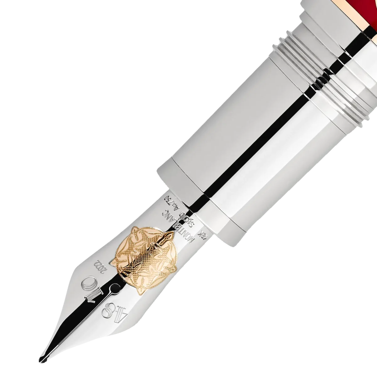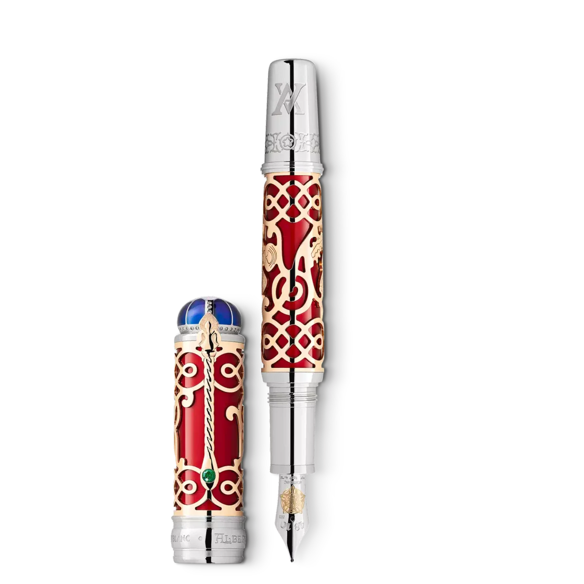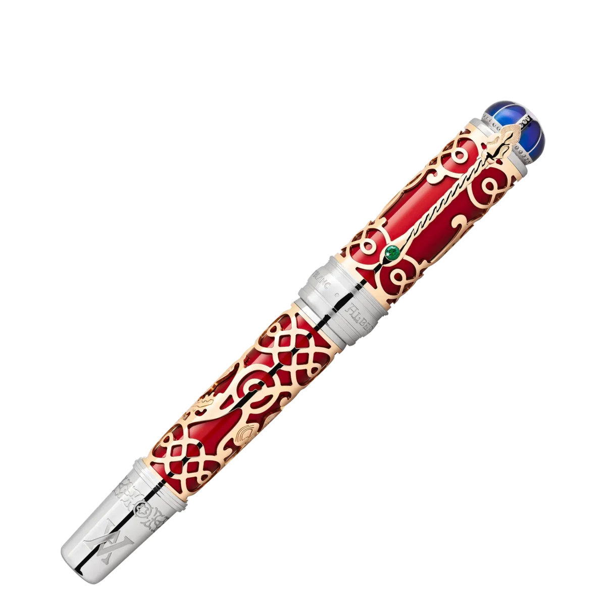La edición Montblanc Patron of Art de 2022 está dedicada a la reina Victoria y al príncipe Alberto. La edición limitada 888 es una edición dedicada a una pareja extraordinaria, una edición en honor a la reina Victoria y otra a su consorte, el príncipe Alberto. La edición limitada 888 Montblanc Patron of Art Homage to Victoria rinde homenaje a Victoria, en particular al día de su coronación. La pluma estilográfica viene con un capuchón y un cuerpo fabricados en laca roja translúcida y una sólida capa esquelética de oro Au 750 / 18K. El esqueleto está inspirado en su collar de coronación y su monograma, mientras que el rojo se inspira en su vestido de coronación. Los accesorios están recubiertos de platino. La forma del clip es un tributo a su cetro, mientras que la tsavorita verde es un homenaje a su anillo de compromiso. La parte superior del capuchón está inspirada en una corona real y está adornada con el emblema de Montblanc hecho de nácar. Mientras que el anillo del capuchón lleva grabado «Albert» y la fecha de su boda, como si se tratara de una alianza, el cono está decorado con un grabado especial. Como homenaje al apodo de Victoria, «la rosa de Inglaterra», la plumilla bicolor de oro macizo Au 750 / 18 quilates, elaborada a mano, lleva grabada una rosa. Con el oro característico y/o el recubrimiento de oro característico, Montblanc describe el tono iluminado del oro amarillo que se ha convertido en un tono muy apreciado para los instrumentos de escritura de la Maison.N.º de identificación: MB127851 Peso físico: 102 g Dimensiones: 145,3 mm * 18,5 mm