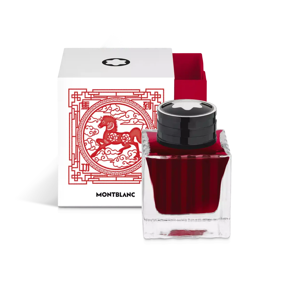 Botella de tinta Montblanc, The Legend of Zodiacs, El caballo, rojo – 50 ml Las botellas de tinta Montblanc Special Edition vienen en un empaque cuadrado que evoca los conceptos y temas de cada colección, lo que las convierte en valiosos artículos coleccionables para los entusiastas de Montblanc.