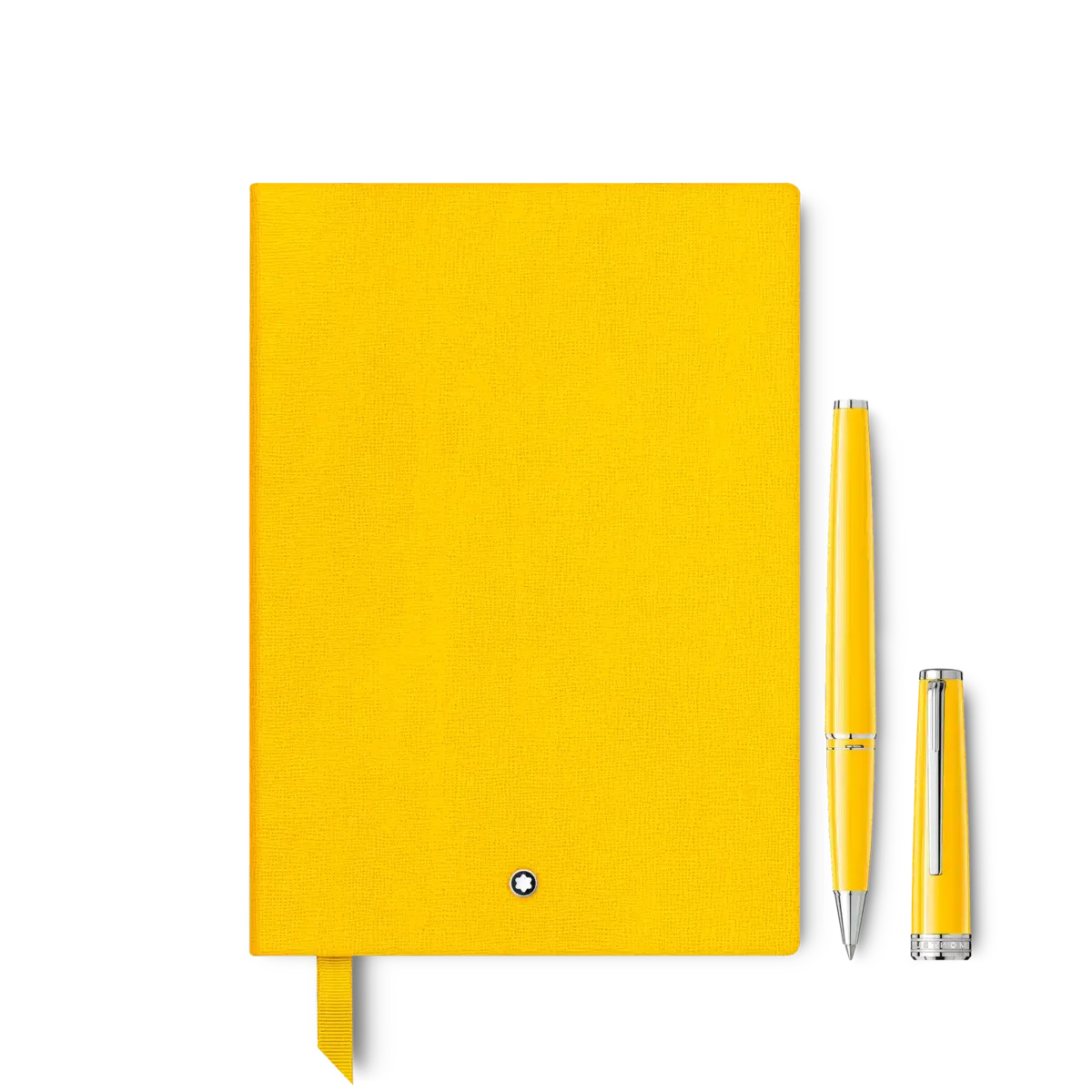 El set incluye un bolígrafo roller PIX amarillo y un cuaderno #146 amarillo. El bolígrafo roller está fabricado en resina preciosa y cuenta con accesorios recubiertos de platino. La parte superior del capuchón está coronada con el emblema blanco de Montblanc. El cuaderno n.º 146 cuenta con 96 hojas de papel rayado, con marca de agua y bordes plateados. N.º de identificación: MB135690. Peso físico: 380 g. Dimensiones: 210 mm x 150 mm x 15 mm.