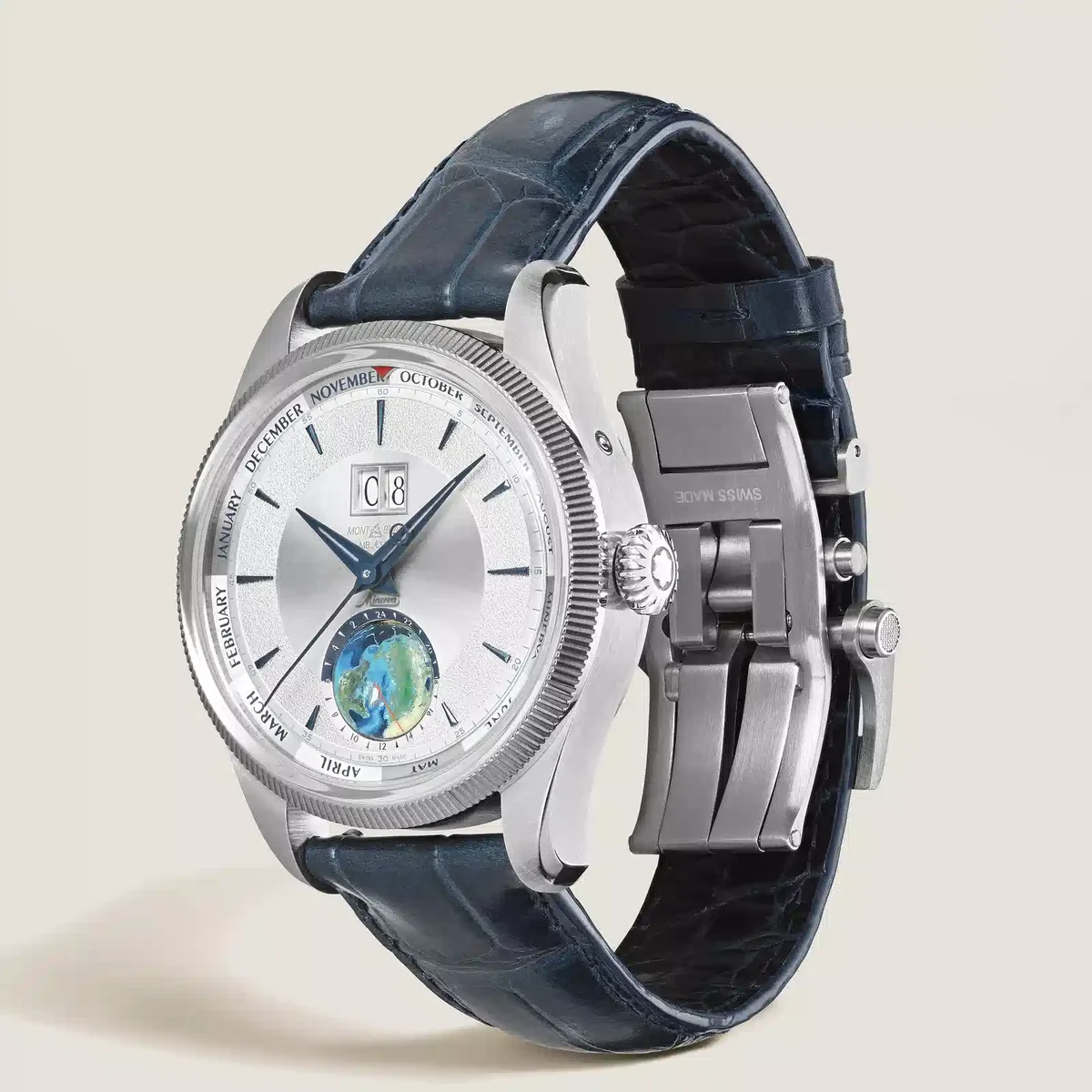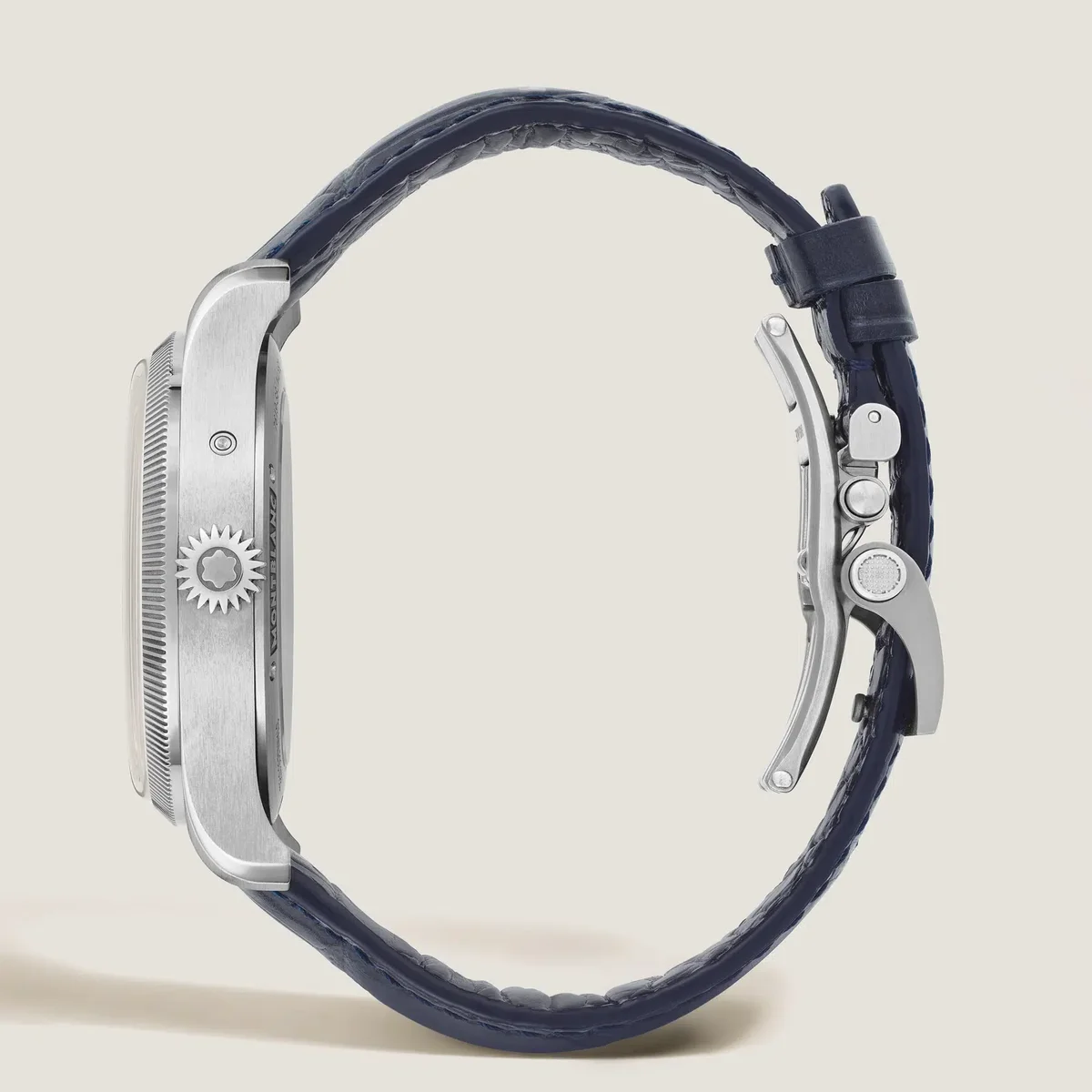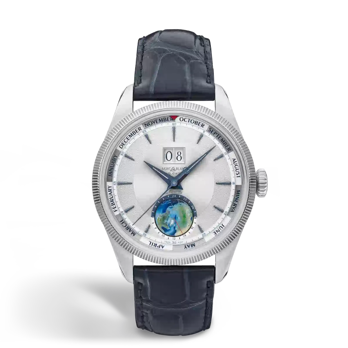 El Montblanc 1858 Calendario Anual Geosphere Edición Limitada se inspira en los códigos estéticos de la herencia de Minerva en la década de 1950, con su esfera granulada de color blanco plateado con rayos de sol y agujas e índices recubiertos de azul. La caja de acero inoxidable de 42 mm está equipada con un bisel fijo estriado de oro blanco 750/1000 (18 quilates) inspirado en los relojes históricos de Minerva. El reloj está impulsado por un calibre MB M14.58 de cuerda manual y acabado a mano, que cuenta con calendario anual, fecha grande y función de hora mundial. Para las funciones del calendario anual, la fecha grande se encuentra a las 12 en punto y cuenta con dos grandes ventanillas situadas una al lado de la otra, mientras que los meses se muestran alrededor de la periferia de la esfera. El punto focal visual de este reloj es, sin duda, su globo terráqueo giratorio tridimensional pintado a mano, que muestra el hemisferio norte con indicación de día y noche y una escala de 24 horas. El reloj se completa con una correa intercambiable de piel de becerro azul con estampado de cocodrilo y un cierre triple desplegable de acero inoxidable con sistema de ajuste fino. N.º de identificación: MB134026