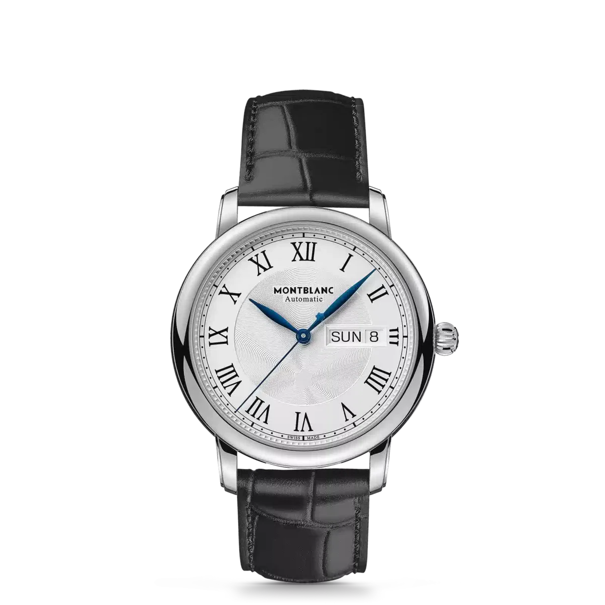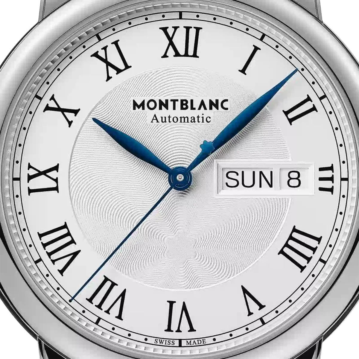 La colección Montblanc Star Legacy se inspira en la herencia de Minerva y en los relojes de bolsillo de la empresa fabricados a finales del siglo XIX y principios del XX.En línea con los códigos de diseño de la línea de productos, el Montblanc Star Legacy Automatic Day & Date presenta una refinada esfera blanco plateada con el patrón guilloché de estrella explosiva de Montblanc, números arábigos, agujas en forma de hoja, un motivo guilloché «filet sauté» y una vía de tren. El reloj está equipado con el calibre automático MB 24.28 y cuenta con las horas, los minutos y los segundos en el centro, y el día y la fecha en una ventanilla a las tres en punto. Viene en una caja de acero inoxidable de 39 mm y está equipado con una correa de piel de becerro negra con estampado de cocodrilo. N.º de identificación: MB128686