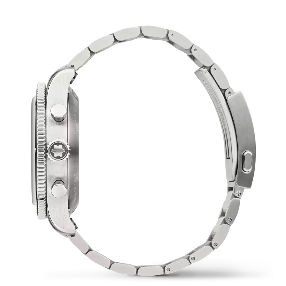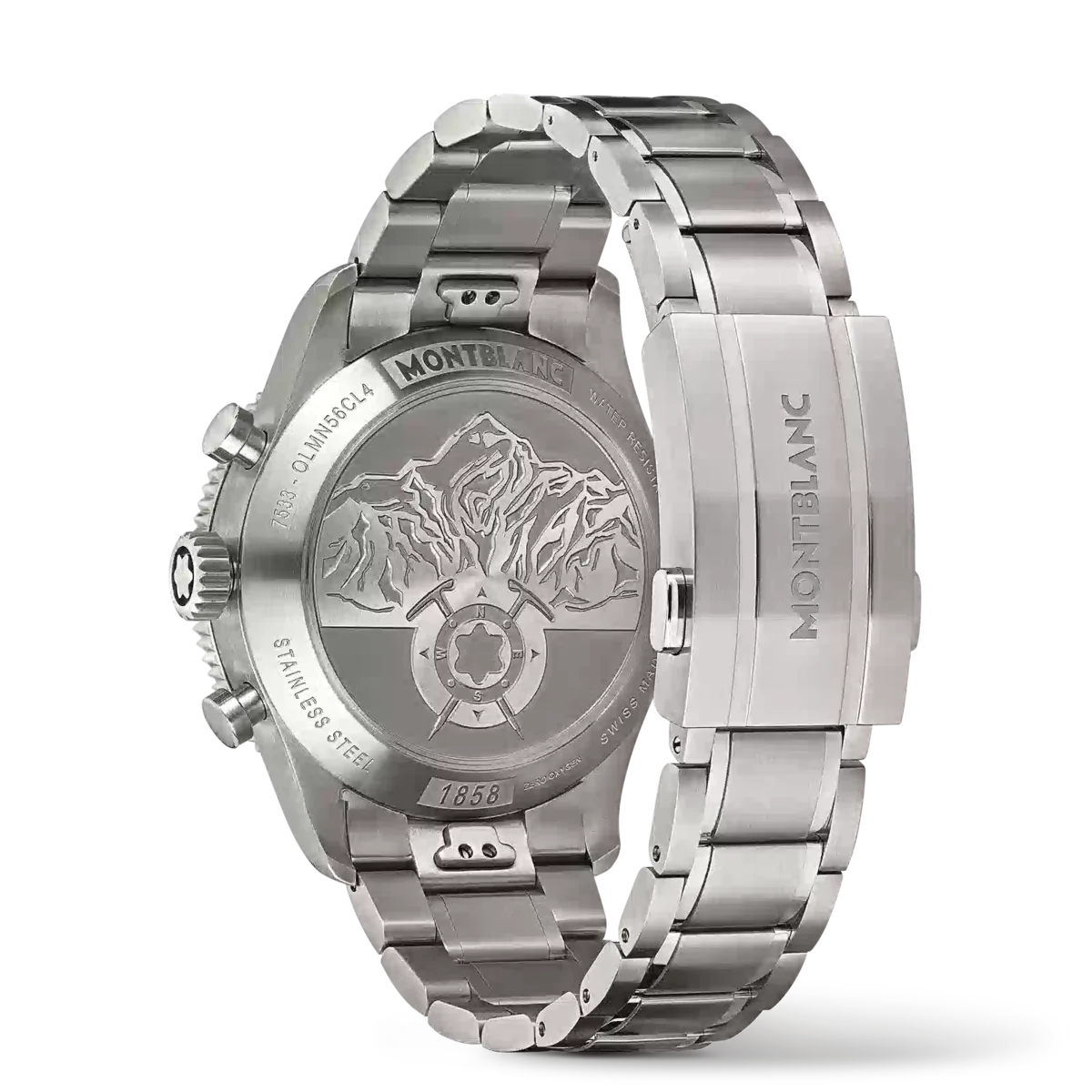 En homenaje a las cimas más altas del mundo y a los alpinistas que se atreven a escalarlas soportando condiciones extremas, el Montblanc 1858 Automatic Chronograph 0 Oxygen The 8000 se presenta en una caja de acero inoxidable de 42 mm totalmente desprovista de oxígeno. Esto ofrece varias ventajas para los exploradores, ya que elimina el empañamiento y evita la oxidación, lo que permite que el movimiento dure mucho más tiempo con mayor precisión. El reloj está impulsado por el cronógrafo automático MB 25.13 y cuenta con un bisel acanalado bidireccional de cerámica negra con puntos cardinales luminiscentes; una esfera gris oscuro con patrón de glaciar sfumato con detalles en naranja y luminiscencia azul. El fondo de la caja está grabado con el motivo «Spirit of Exploration» y el reloj está equipado con un brazalete intercambiable de acero inoxidable cónico con un sistema de ajuste fino. N.º de identificación: MB130983