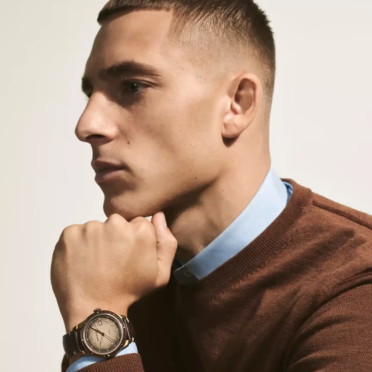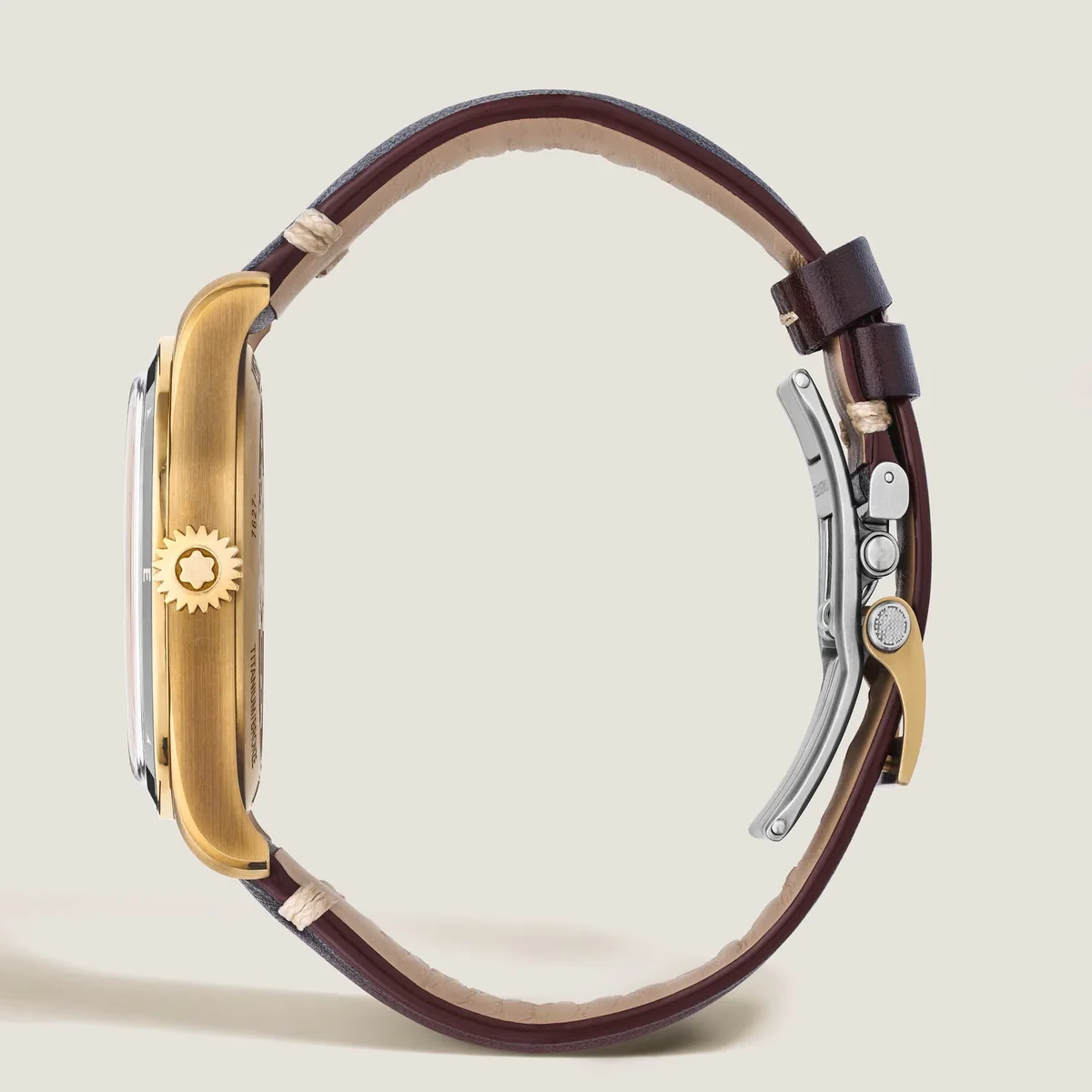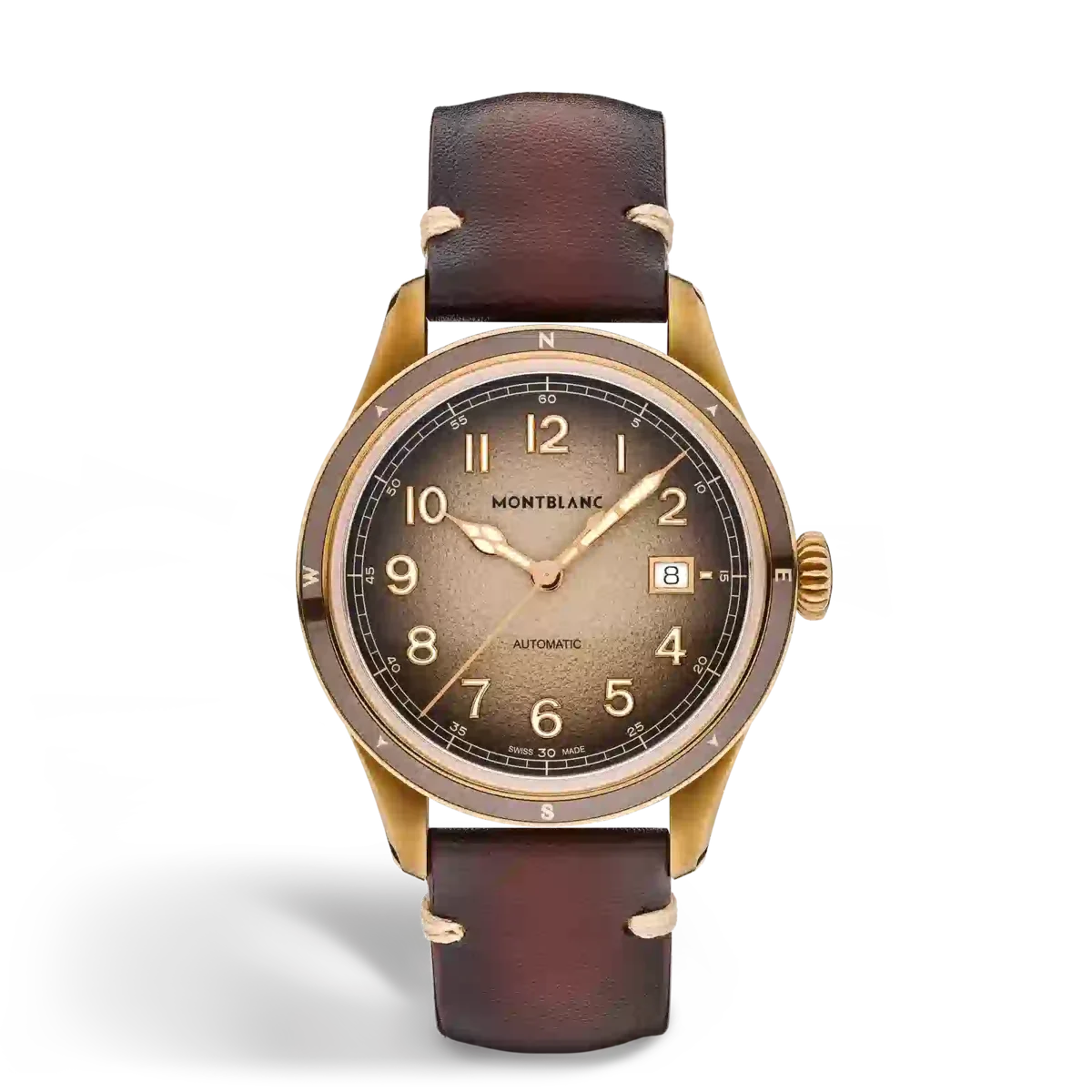El Montblanc 1858 Automatic Date 0 Oxygen se presenta en una caja de bronce de 41 mm totalmente desprovista de oxígeno. Se completa con un bisel fijo con inserción de cerámica marrón y puntos cardinales luminiscentes. El fondo de la caja presenta el grabado especial «Spirit of Exploration». El reloj está impulsado por el calibre automático MB 24.17 y viene con una esfera marrón graneada sfumato con números arábigos recubiertos de oro rosa luminiscente blanco. Está equipado con una correa intercambiable de piel de becerro marrón sfumato con costuras beige. N.º de identificación MB134339 Ancho de la asa 20 mm