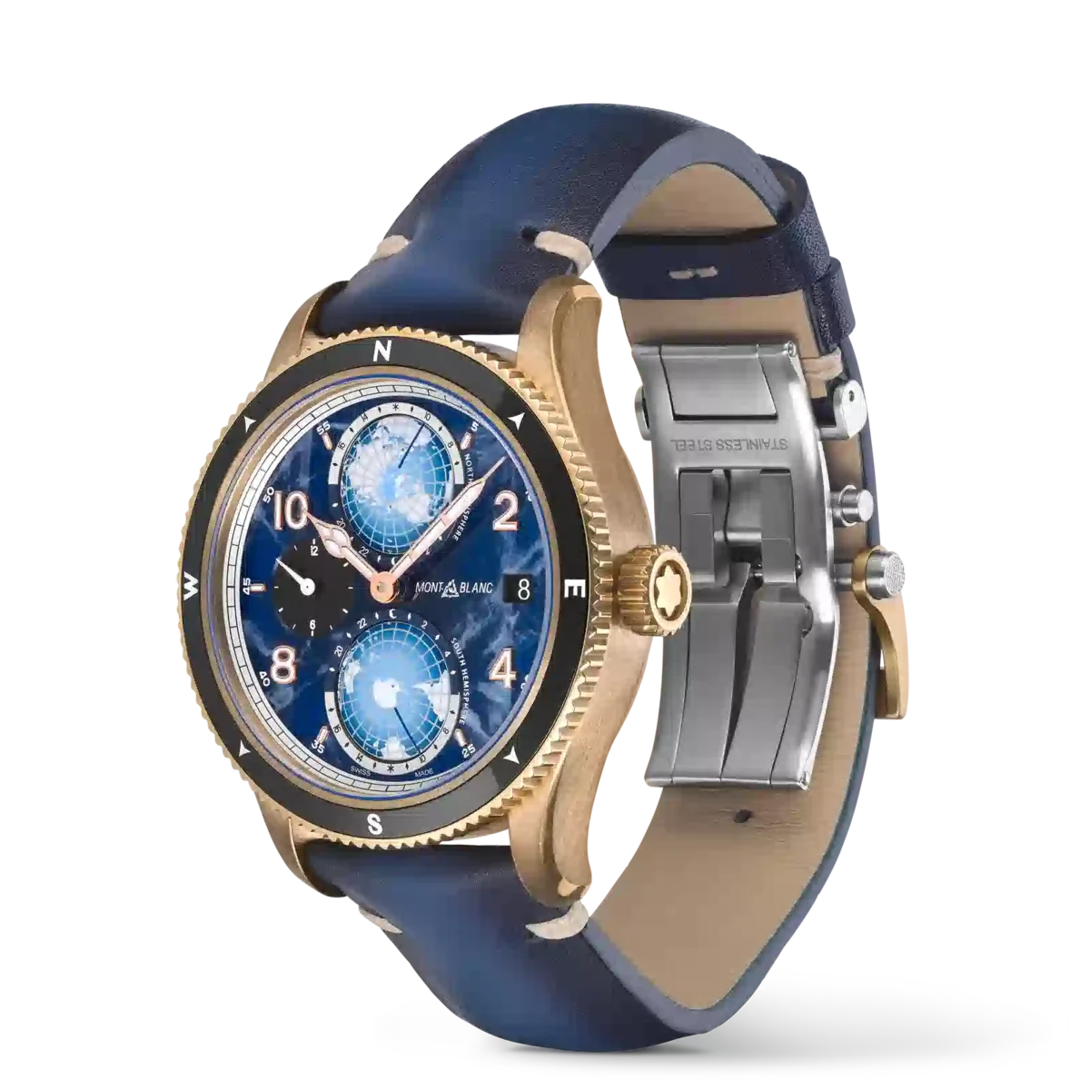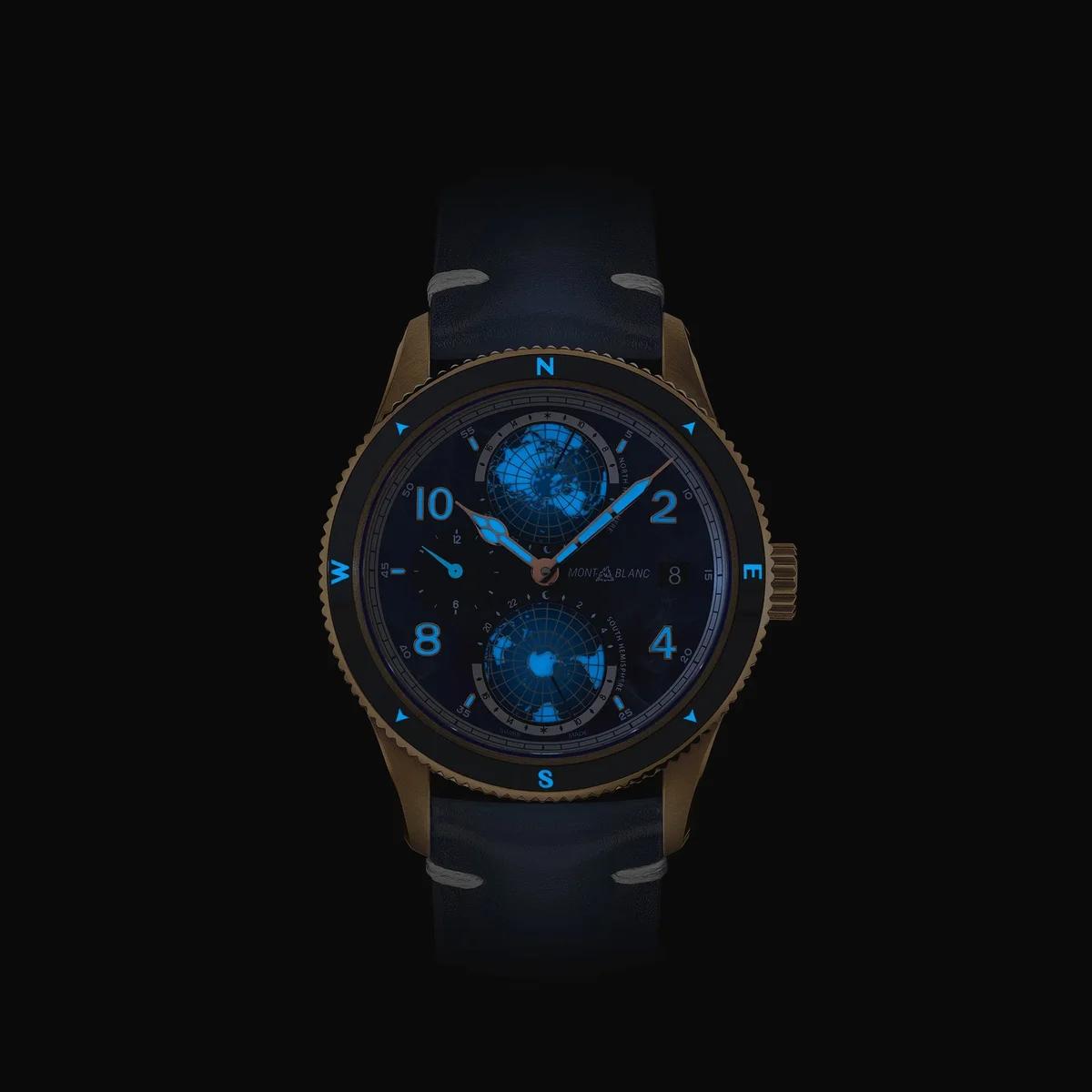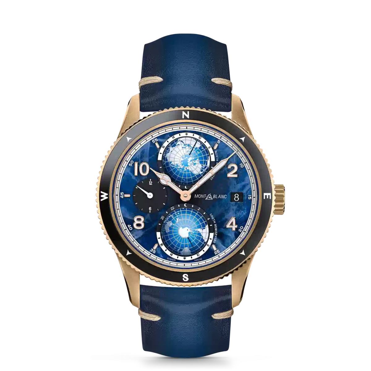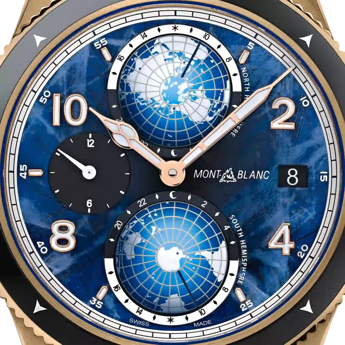 El Montblanc 1858 Geosphere 0 Oxygen Edición Limitada carece por completo de oxígeno para mejorar el rendimiento y la precisión del reloj a lo largo del tiempo, incluso en algunos de los entornos montañosos más hostiles. La ausencia total de oxígeno en el interior del movimiento no solo elimina el empañamiento, que puede producirse con los cambios drásticos de temperatura a gran altitud, sino que también evita la oxidación. Sin oxígeno, todos los componentes duran mucho más y proporcionan una mayor precisión con el paso del tiempo. El reloj presenta una caja de bronce de 42 mm con un bisel cerámico moleteado bidireccional con puntos cardinales luminiscentes y la esfera con motivo glaciar de la Maison. El reloj está impulsado por el movimiento automático MB 29.25 con complicación de manufactura. Al igual que en todos los modelos 1858 Geosphere, tanto el hemisferio norte como el sur están representados con dos globos terráqueos tridimensionales e incluyen una indicación de día y noche para que el usuario pueda ver qué hora es en todo el planeta con solo un vistazo. N.º de identificación: MB129415
