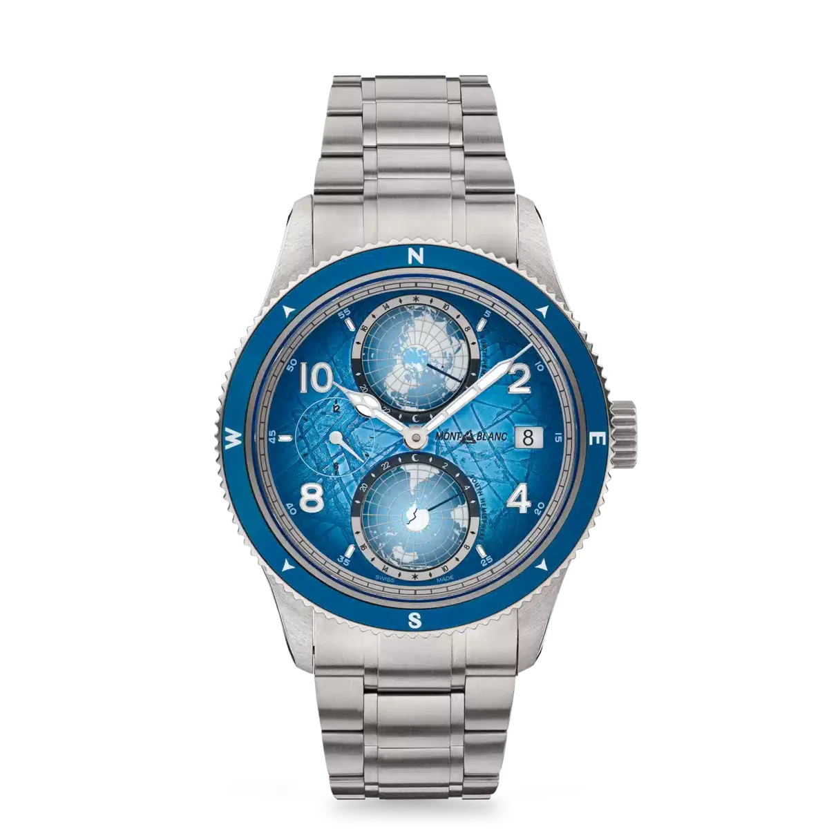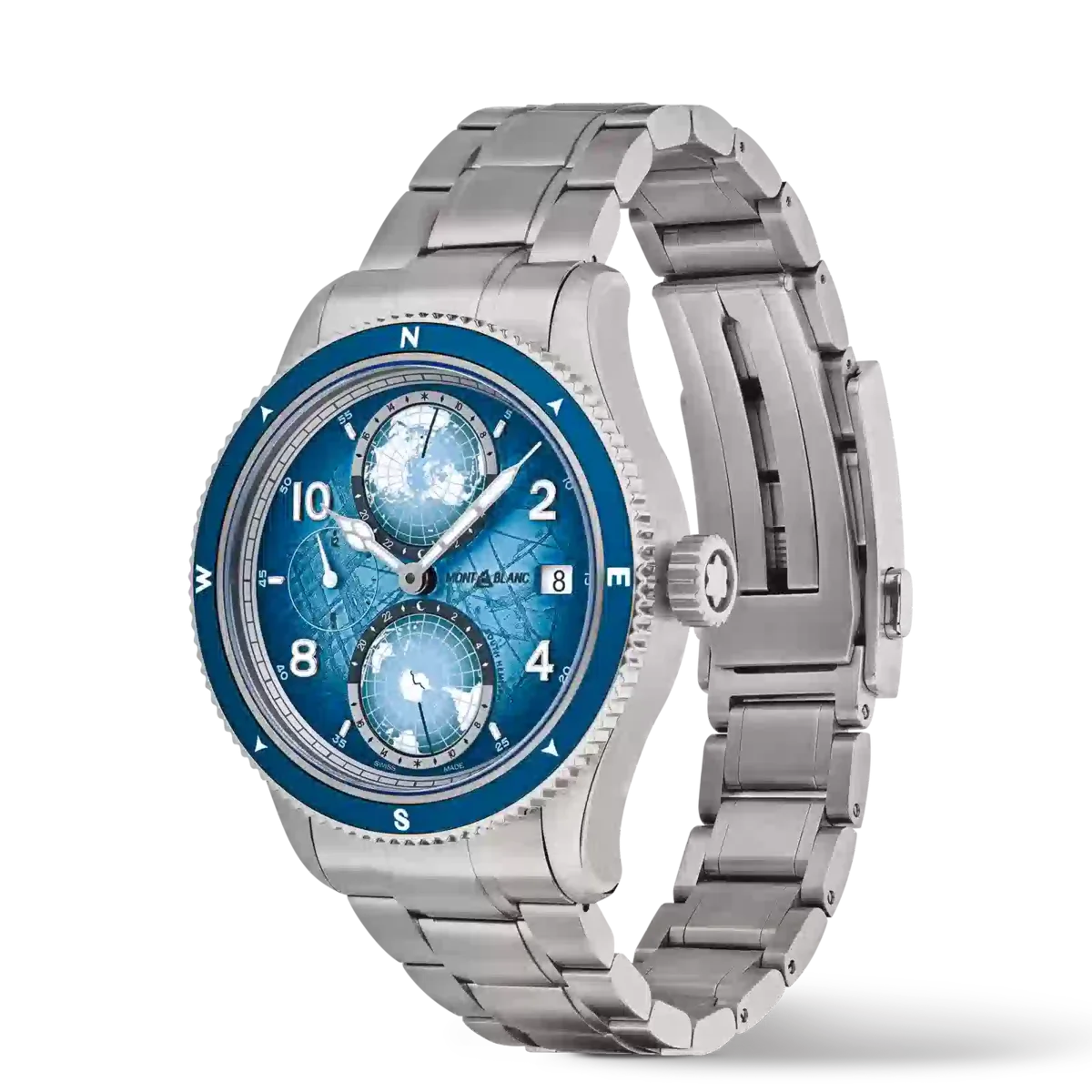 Esta edición limitada de 1990 piezas del Montblanc 1858 Geosphere se inspira en las exploraciones del Polo Sur en el continente antártico. El reloj funciona con el movimiento automático de Montblanc con complicación Manufacture Worldtime, el Calibre MB 29.25, que indica la hora en todo el mundo mediante distintivos globos giratorios luminiscentes; también indica el día y la noche, una doble hora y la fecha. Alojada en una caja ultraligera de titanio de 42 mm completamente desprovista de oxígeno, esta nueva innovación técnica ofrece varias ventajas para los exploradores, ya que elimina el empañamiento y evita la oxidación, lo que permite que el movimiento dure mucho más tiempo con mayor precisión. El reloj está equipado con una esfera azul hielo con patrón sfumato glaciar y un bisel de aluminio anodizado bidireccional a juego, y está disponible con un brazalete cónico intercambiable con un sistema de ajuste fino y una correa textil gris con patrón de cuerda. En el fondo de la caja hay un grabado láser en 3D de un paisaje helado con la aurora austral. N.º de identificación: MB130961 Ancho de la asa: 22 mm