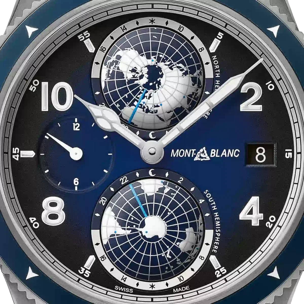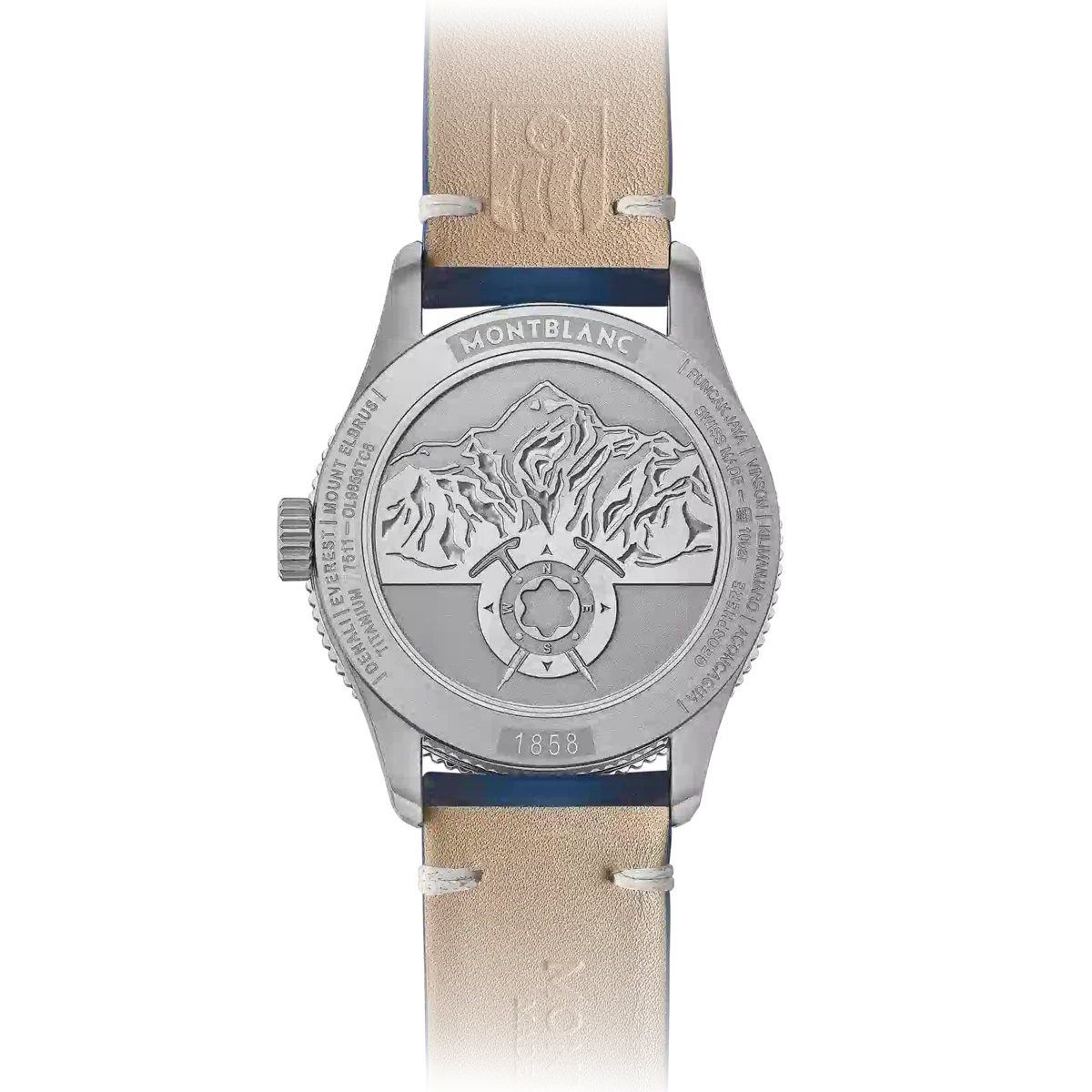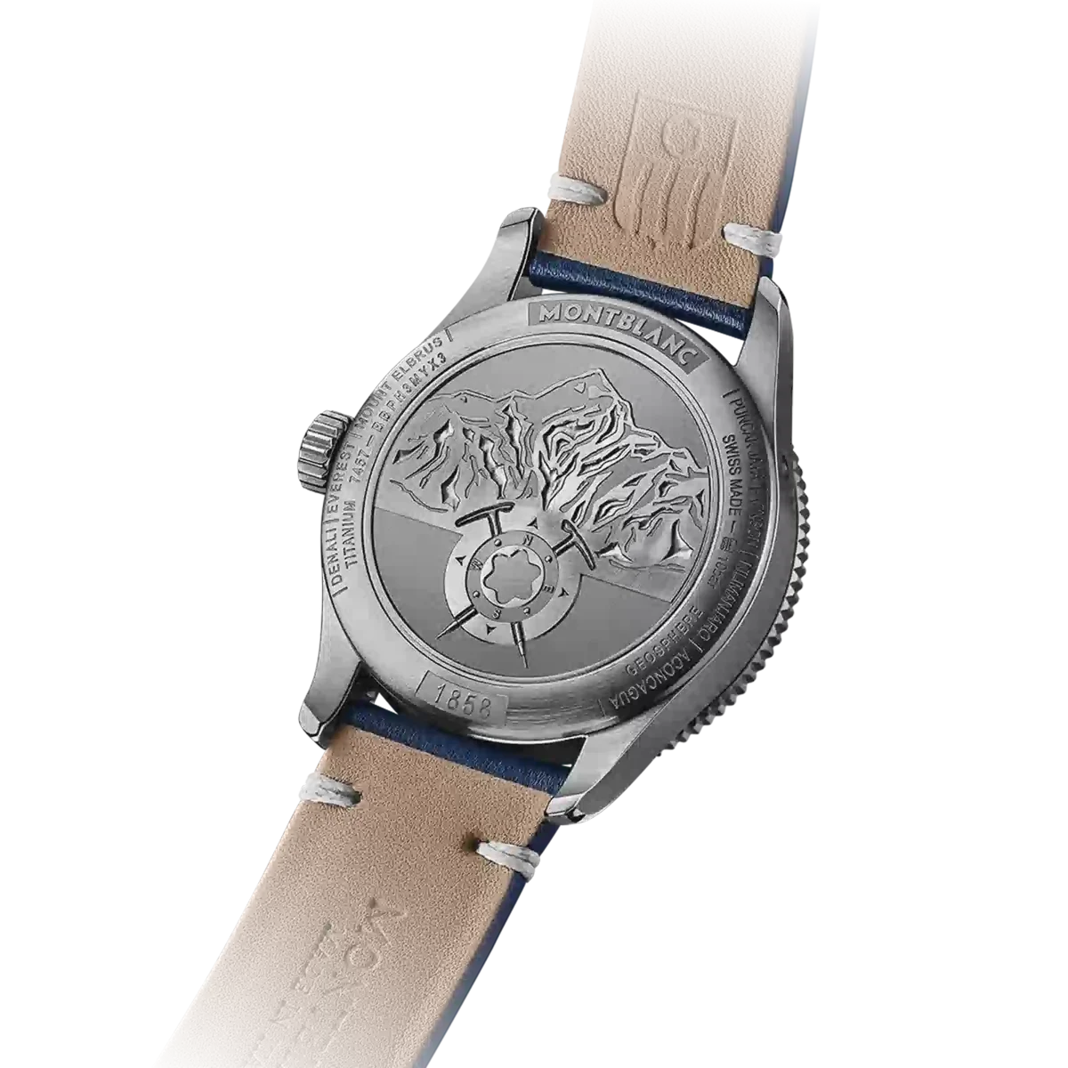 La línea de productos Montblanc 1858 se inspira en los relojes profesionales Minerva de los años 20 y 30, concebidos para uso militar y exploración. Reinterpretando estos legendarios relojes, la línea de productos Montblanc 1858 expresa el espíritu de la exploración de la montaña, encarnando la tendencia moderna de volver a la naturaleza. El Montblanc 1858 Geosphere está dedicado al reto de escalar las Siete Cumbres del mundo, el santo grial de las aventuras de alpinismo. Se presenta en una caja de titanio de 42 mm combinada con detalles de diseño en azul y blanco hielo contrastante, inspirándose en los colores de los glaciares. El reloj cuenta con una complicación de hora mundial desarrollada por los relojeros de Montblanc en Villeret: dos globos abombados que giran en direcciones opuestas y completan una rotación completa en 24 horas. Ambos están rodeados por una escala con las 24 zonas horarias, junto con una indicación de día y noche en colores contrastantes. Esto proporciona una forma instintiva de apreciar las diferentes zonas horarias, con la ayuda de SuperLumiNova® aplicado a los continentes para aumentar la visibilidad y el rendimiento por la noche. El reloj se completa con una correa de piel de becerro azul sfumato con costuras blancas. N.º de identificación: MB125565