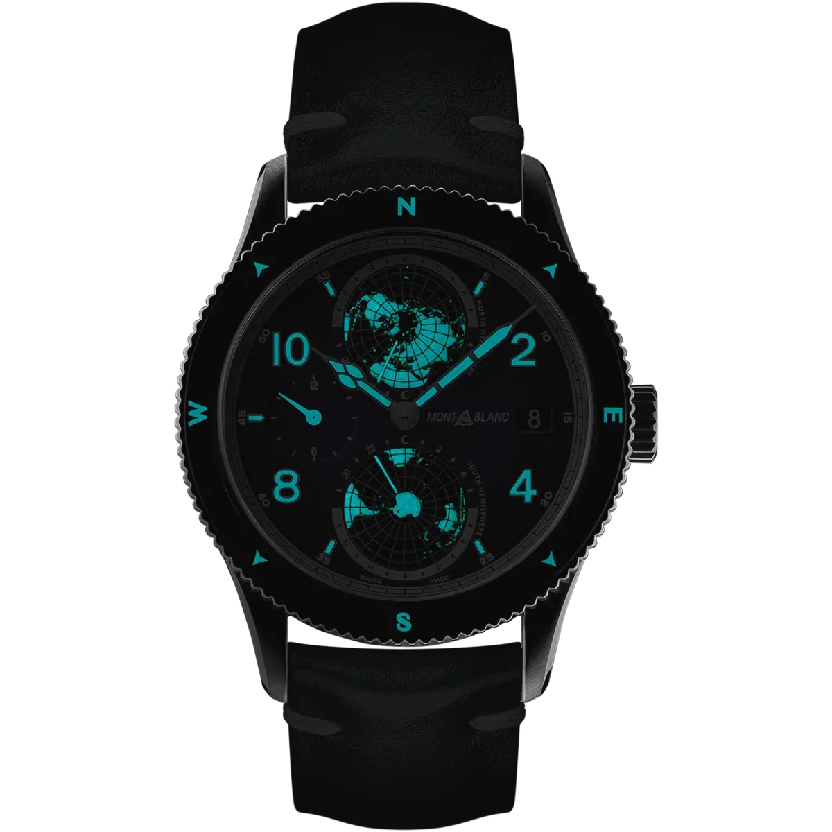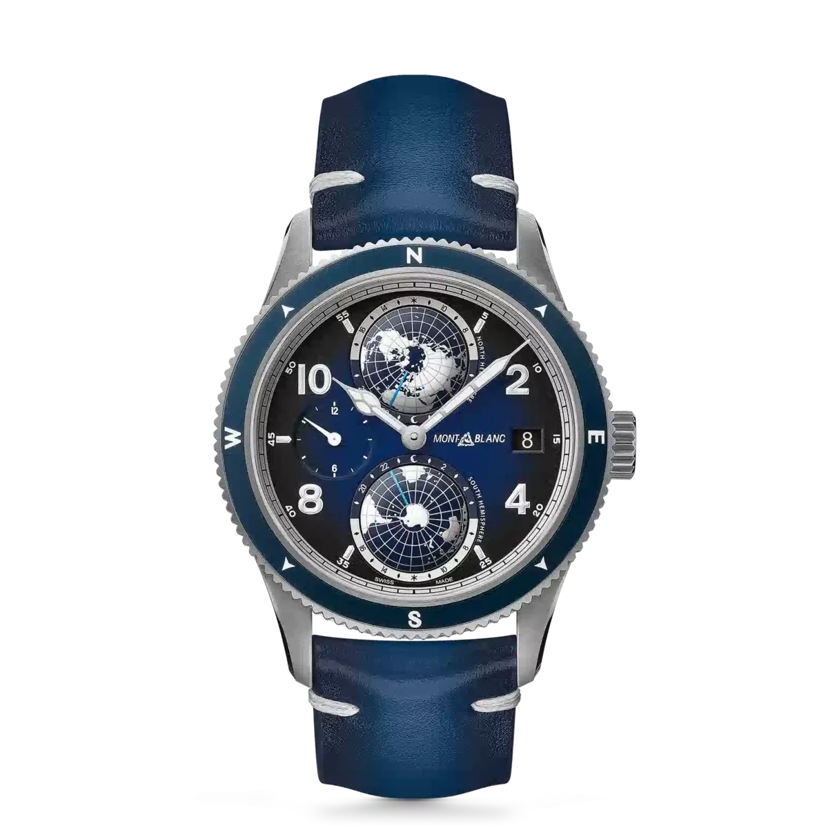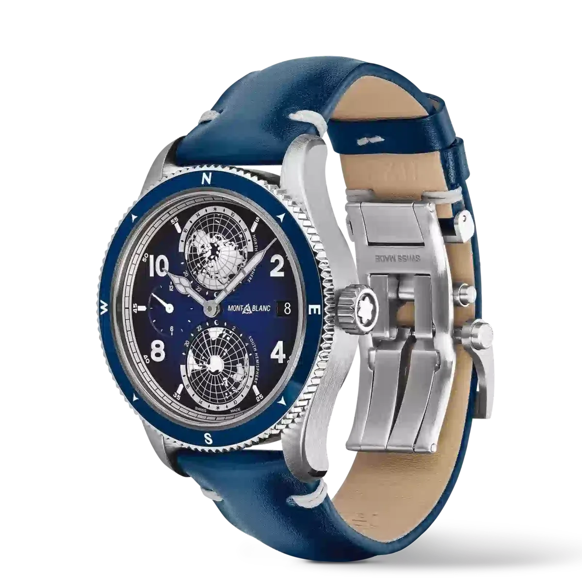 La línea de productos Montblanc 1858 se inspira en los relojes profesionales Minerva de los años 20 y 30, concebidos para uso militar y exploración. Reinterpretando estos legendarios relojes, la línea de productos Montblanc 1858 expresa el espíritu de la exploración de la montaña, encarnando la tendencia moderna de volver a la naturaleza. El Montblanc 1858 Geosphere está dedicado al reto de escalar las Siete Cumbres del mundo, el santo grial de las aventuras de alpinismo. Se presenta en una caja de titanio de 42 mm combinada con detalles de diseño en azul y blanco hielo contrastante, inspirándose en los colores de los glaciares. El reloj cuenta con una complicación de hora mundial desarrollada por los relojeros de Montblanc en Villeret: dos globos abombados que giran en direcciones opuestas y completan una rotación completa en 24 horas. Ambos están rodeados por una escala con las 24 zonas horarias, junto con una indicación de día y noche en colores contrastantes. Esto proporciona una forma instintiva de apreciar las diferentes zonas horarias, con la ayuda de SuperLumiNova® aplicado a los continentes para aumentar la visibilidad y el rendimiento por la noche. El reloj se completa con una correa de piel de becerro azul sfumato con costuras blancas. N.º de identificación: MB125565