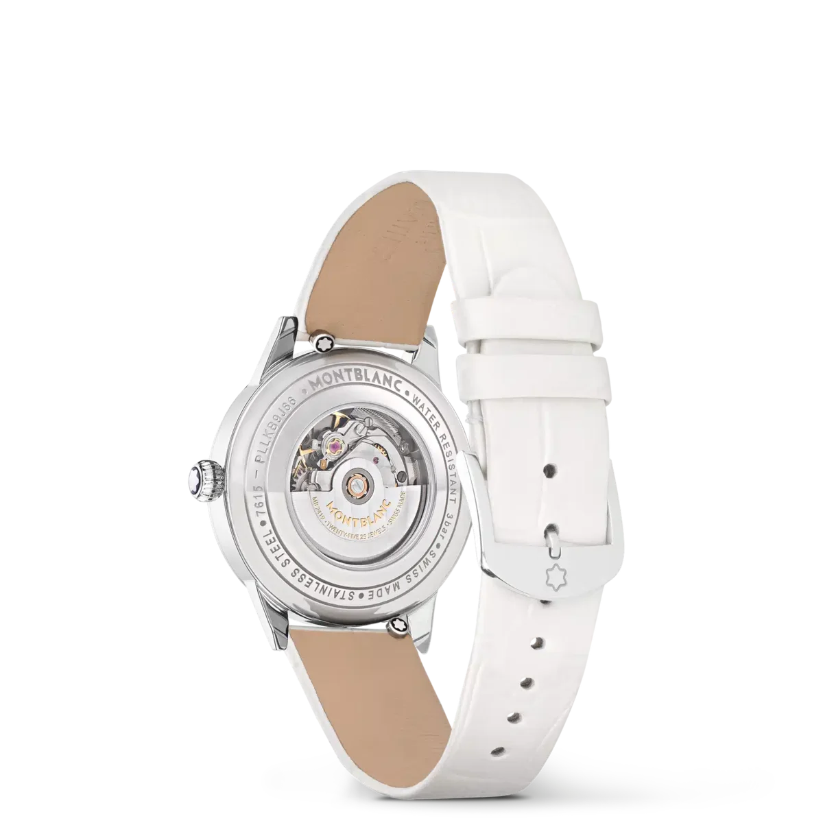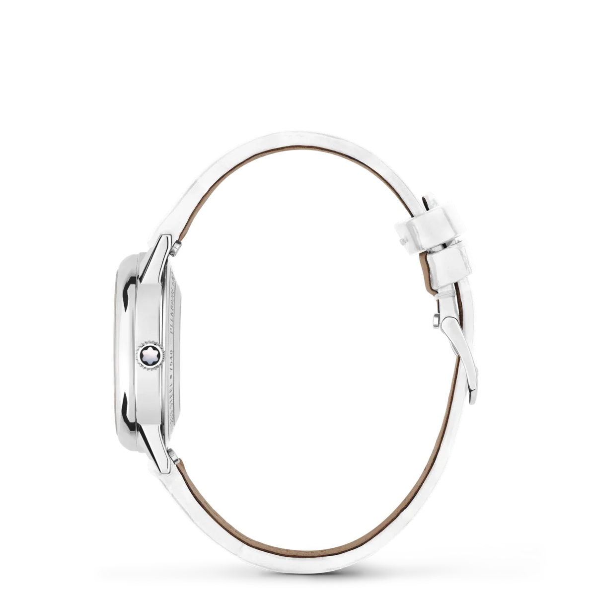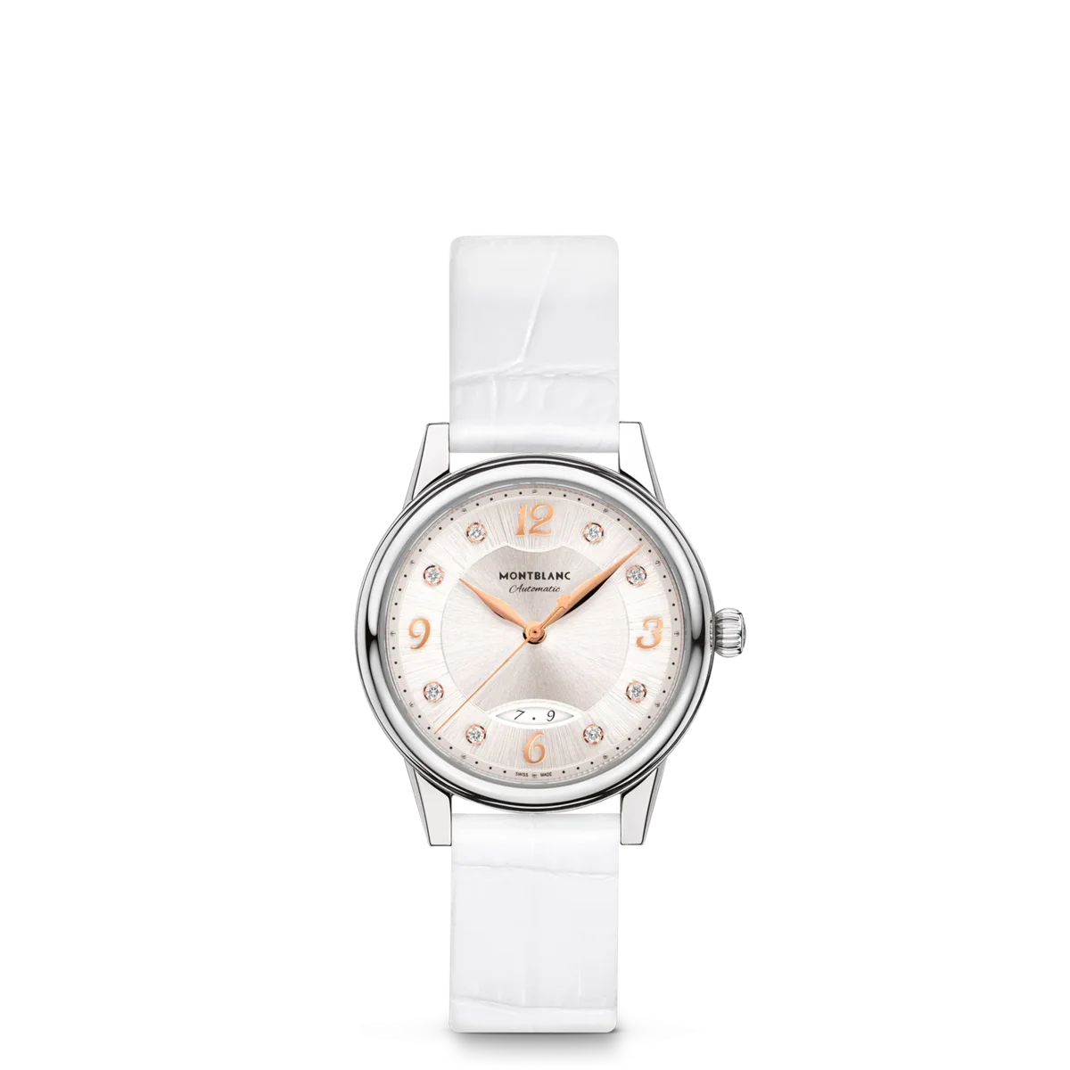 Interpretando los códigos de la alta relojería de una manera elegante y femenina, el Montblanc Bohème Automatic Date se inspira en el mundo de la escritura a mano y se presenta en una caja de acero inoxidable de 30 mm. Cuenta con una elegante esfera plateada cepillada adornada con índices de diamantes, números arábigos florales recubiertos de oro rosa y agujas. Otros detalles refinados son el patrón filet sauté y una técnica de estampado llamada filé d’étoiles. Equipado con el calibre automático MB 24.29, este modelo indica las horas, los minutos y los segundos, así como la fecha, que se muestra en una ventanilla almendrada con números escritos a mano. La romántica tipografía también se ha aplicado a la esfera para la mención «Automatic». Este reloj está equipado con una correa intercambiable de piel de becerro blanca con estampado de cocodrilo y una correa adicional. N.º de identificación MB133305 Ancho de la asa 14 mm