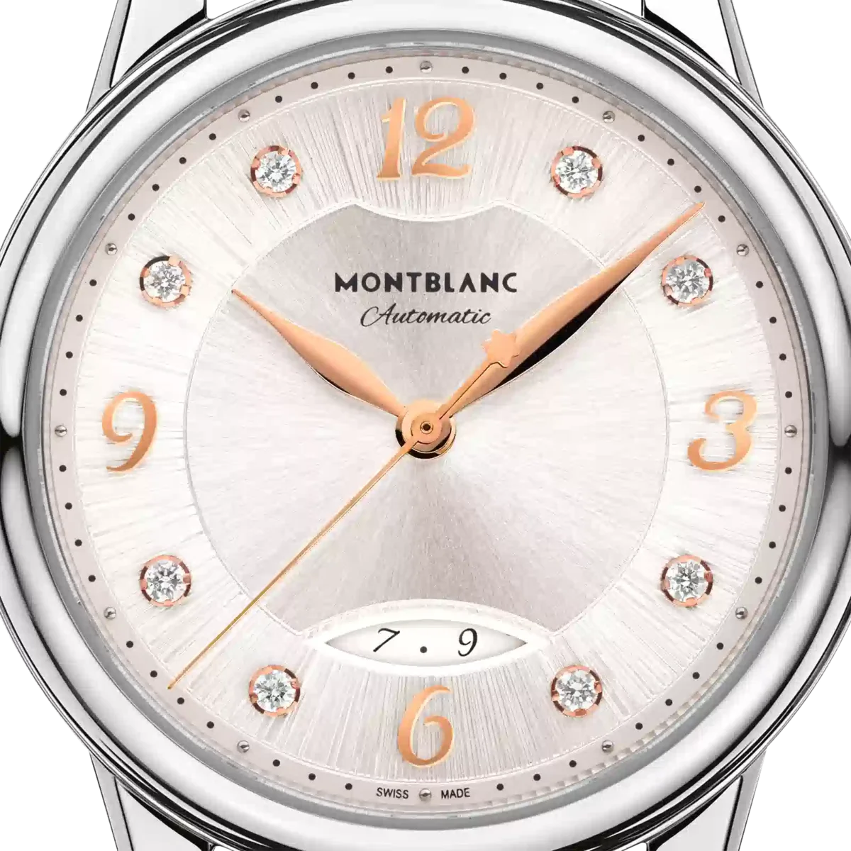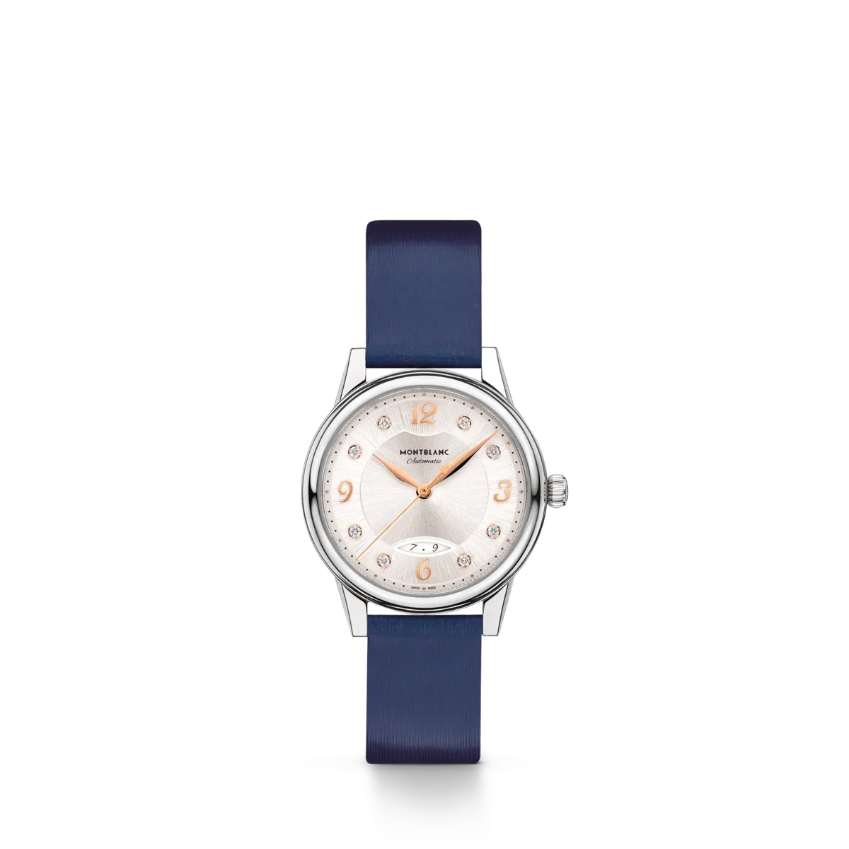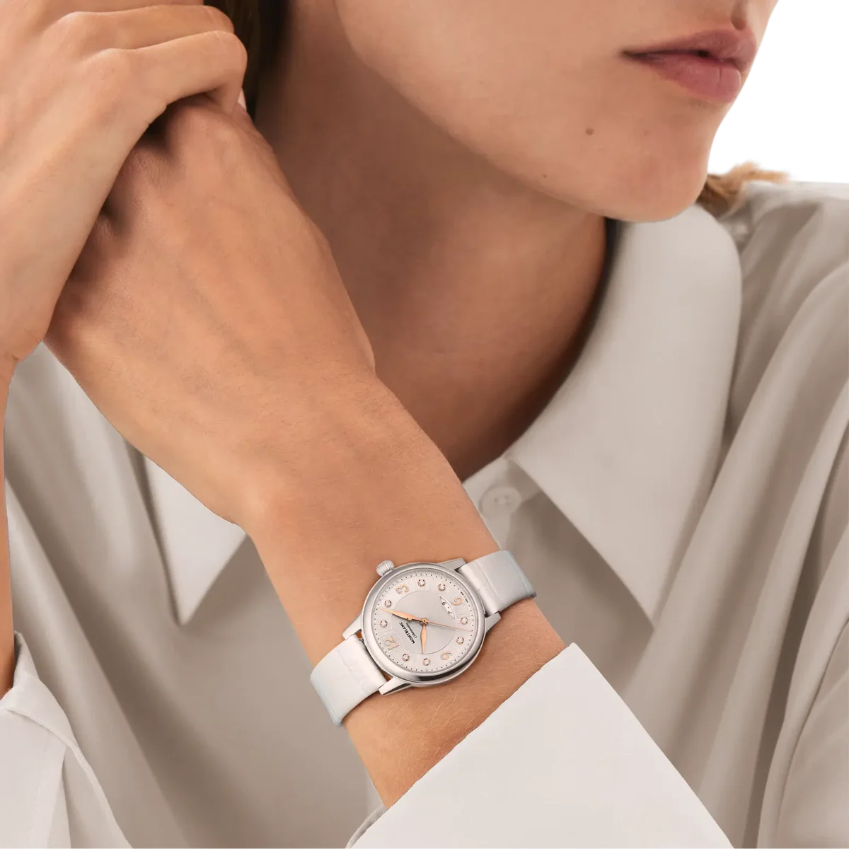 Interpretando los códigos de la alta relojería de una manera elegante y femenina, el Montblanc Bohème Automatic Date se inspira en el mundo de la escritura a mano y se presenta en una caja de acero inoxidable de 30 mm. Cuenta con una elegante esfera plateada cepillada adornada con índices de diamantes, números arábigos florales recubiertos de oro rosa y agujas. Otros detalles refinados son el patrón filet sauté y una técnica de estampado llamada filé d’étoiles. Equipado con el calibre automático MB 24.29, este modelo indica las horas, los minutos y los segundos, así como la fecha, que se muestra en una ventanilla almendrada con números escritos a mano. La romántica tipografía también se ha aplicado a la esfera para la mención «Automatic». Este reloj está equipado con una correa intercambiable de piel de becerro blanca con estampado de cocodrilo y una correa adicional. N.º de identificación MB133305 Ancho de la asa 14 mm