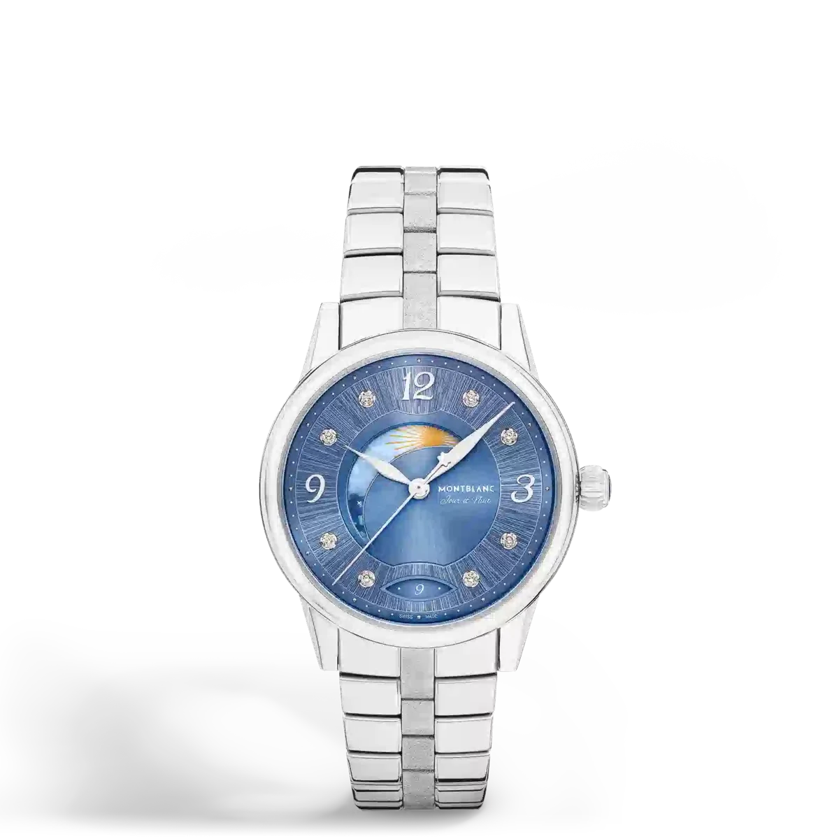 Interpretando los códigos de la alta relojería de una manera elegante y femenina, el Montblanc Bohème Day & Night se inspira en el mundo de la caligrafía y las acuarelas y se presenta en una caja de acero inoxidable de 34 mm. Cuenta con una elegante esfera azul con acabado cepillado adornada con índices de diamantes, números arábigos florales recubiertos de rodio y agujas. Otros detalles refinados son el patrón filet sauté y una técnica de estampado llamada filé d’étoiles. Equipado con el calibre automático MB 24.20, este modelo indica las horas, los minutos y los segundos, así como la fecha, que se muestra en una ventanilla almendrada con números escritos a mano. La romántica tipografía también se ha aplicado a la esfera para la mención del día y la noche «Jour et Nuit». La complicación celestial de día y noche muestra los cambios del cielo a lo largo de un periodo de 24 horas y aporta un toque romántico y artístico al reloj, ya que está creada con acuarelas. Este reloj está equipado con un brazalete intercambiable de acero inoxidable con un eslabón central texturizado y un sistema de ajuste fino. N.º de identificación: MB134343