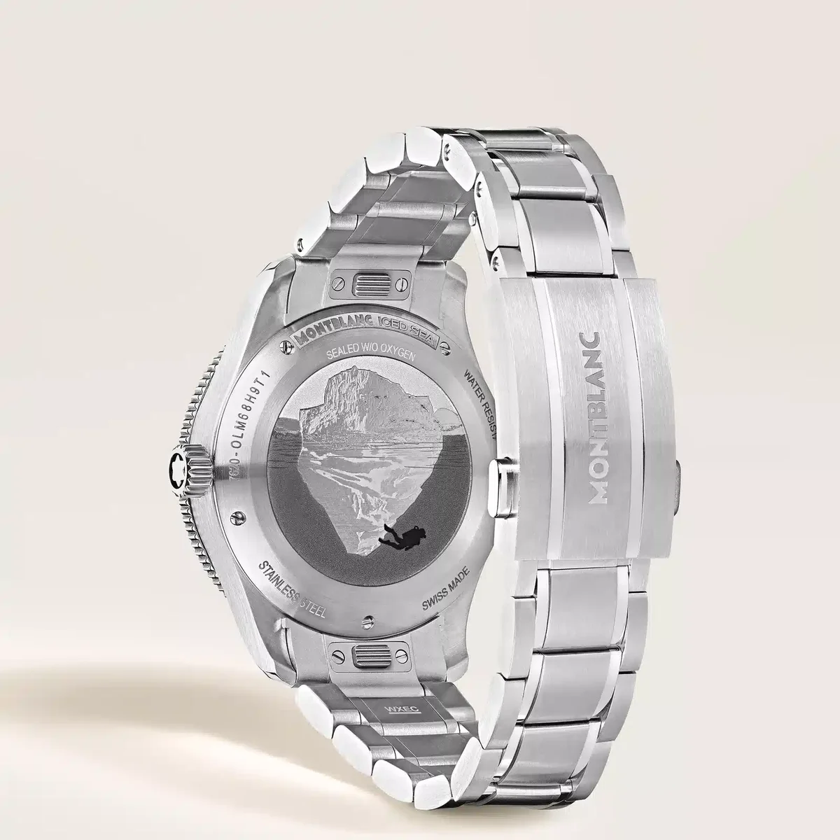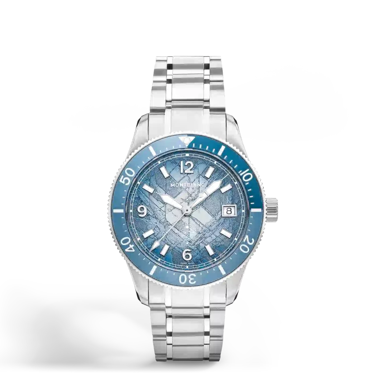 El Montblanc Iced Sea Automatic Date 0 Oxygen, con esfera azul con patrón glaciar sfumato, da la impresión de estar contemplando las profundidades de un glaciar. Inspirada en el Mer de Glace, esta textura glaciar se ha conseguido utilizando una técnica ancestral casi olvidada llamada gratté-boisé. El reloj está alojado en una caja de acero inoxidable de 38 mm totalmente desprovista de oxígeno y viene con un bisel giratorio unidireccional con inserción de aluminio anodizado azul bicolor, un grabado en 3D en el fondo de la caja y un brazalete de acero inoxidable intercambiable con sistema de ajuste fino. El reloj cumple con la norma ISO 6425 para buceo y tiene una resistencia al agua de 300 metros. N.º de identificación: MB134022