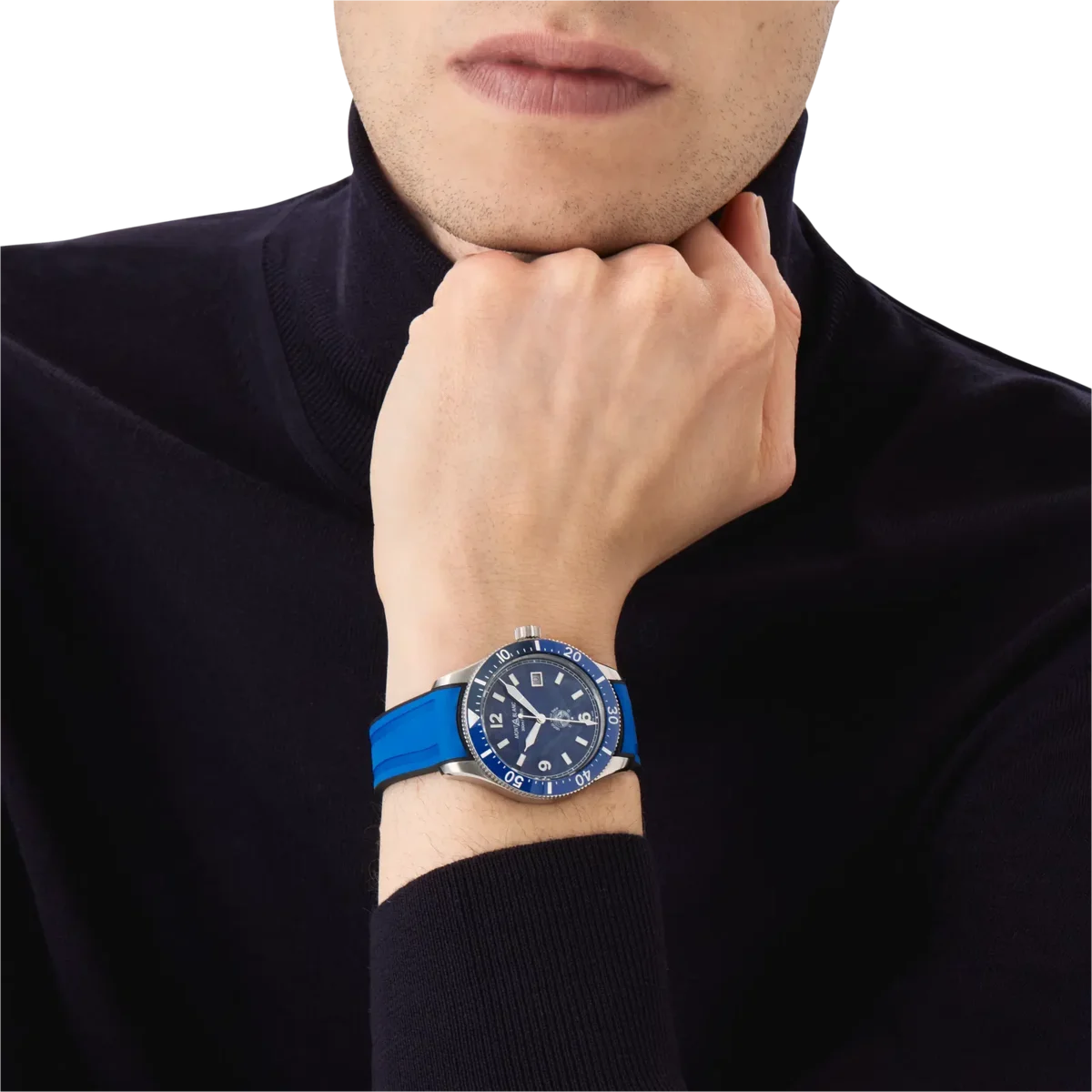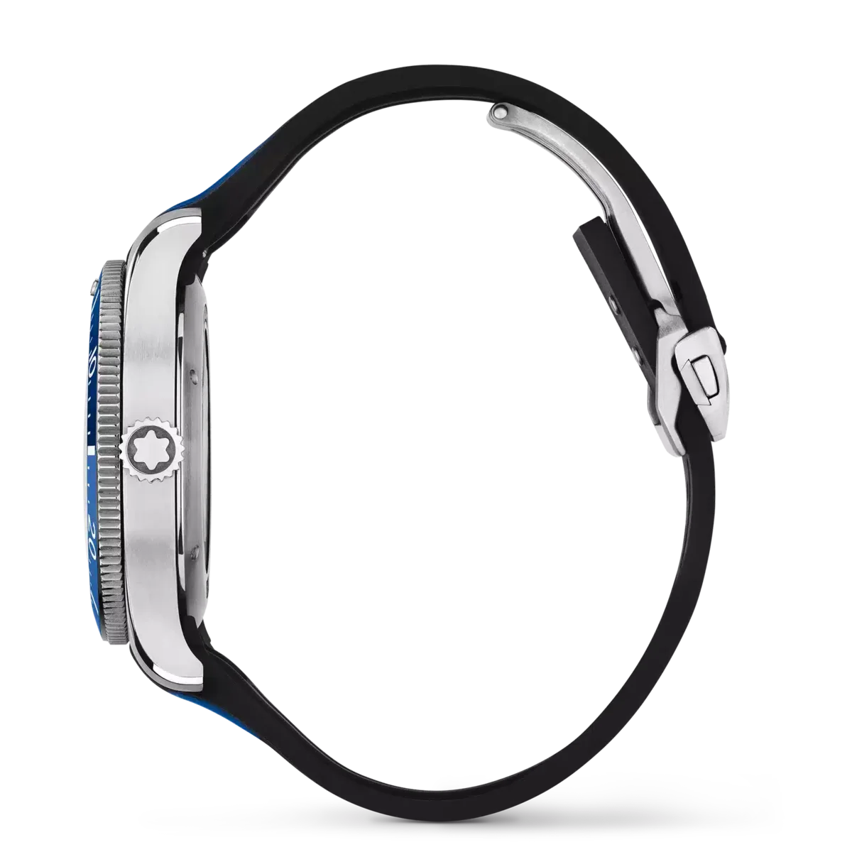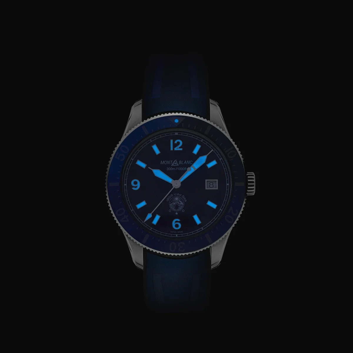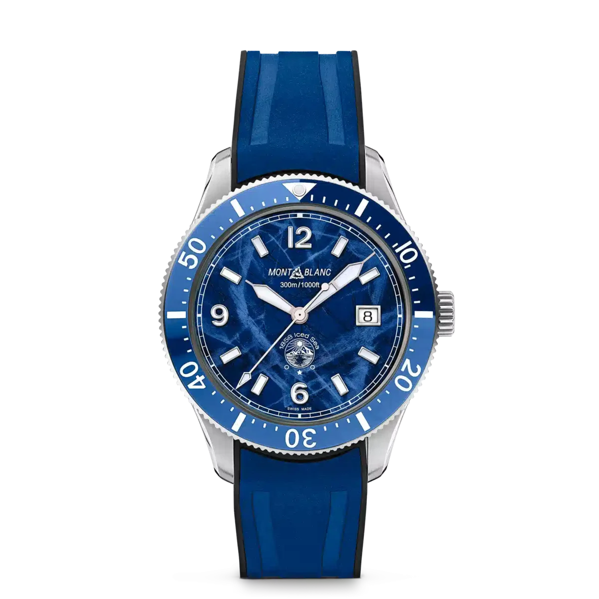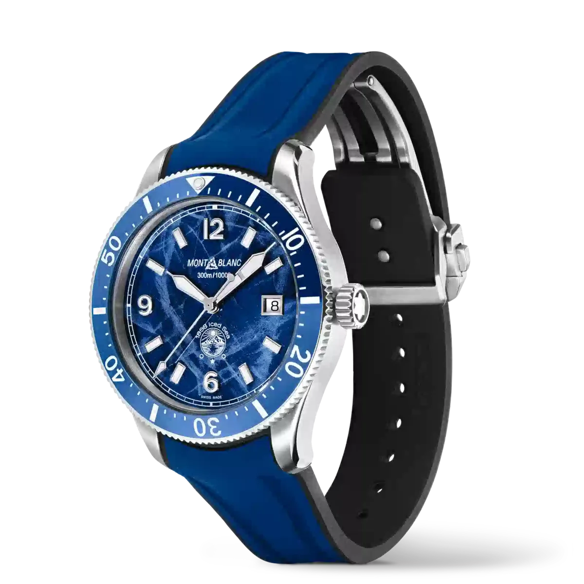 El Montblanc Iced Sea Automatic Date, el primer reloj de buceo deportivo de Montblanc, cuenta con una esfera con motivo glaciar que da la impresión de estar contemplando las profundidades de un glaciar. Esta esfera azul con motivo glaciar se inspira en el Mer de Glace (Mar de Hielo), el principal glaciar del macizo del Mont Blanc. Su textura se ha conseguido utilizando una técnica ancestral casi olvidada llamada gratté-boisé. El reloj tiene una caja de acero inoxidable de 41 mm y cuenta con un bisel cerámico bicolor unidireccional, un fondo grabado y una correa de caucho azul intercambiable con sistema de ajuste fino. El reloj cumple con la norma ISO 6425 para relojes de buceo y es resistente al agua hasta 300 metros. N.º de identificación: MB129370. Ancho de la asa: 20 mm.