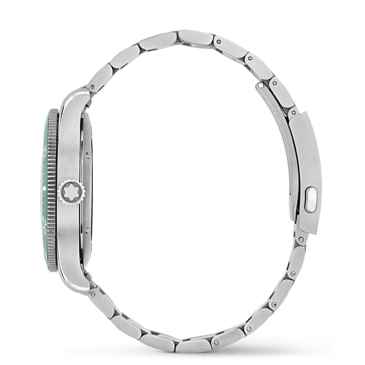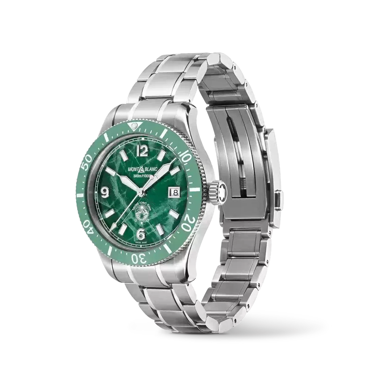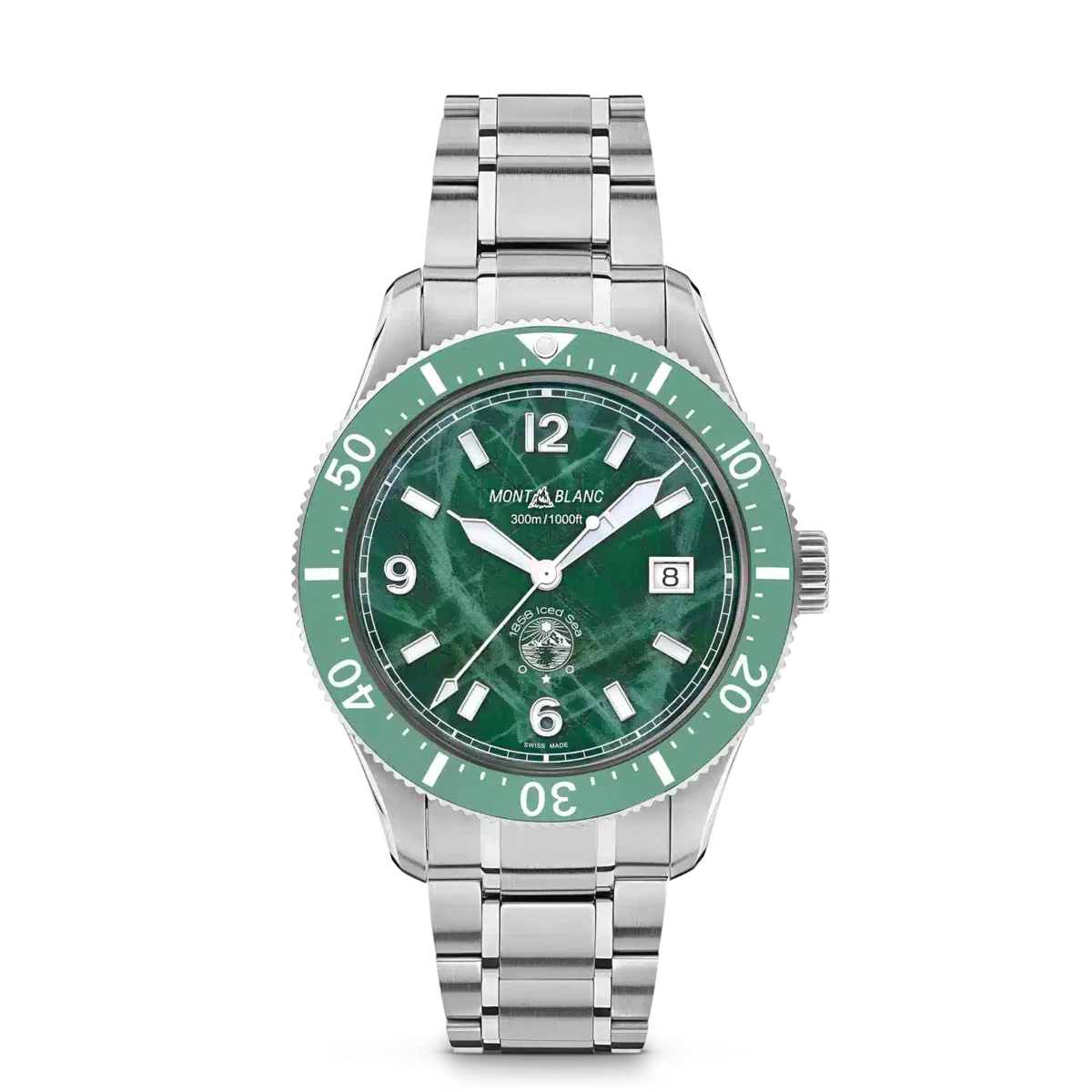 El Montblanc Iced Sea Automatic Date, el primer reloj de buceo deportivo de Montblanc, cuenta con una esfera con motivo glaciar que da la impresión de estar contemplando las profundidades de un glaciar. Esta esfera con diseño glacial verde se inspira en el Mer de Glace (Mar de Hielo), el glaciar principal del macizo del Mont Blanc. Su textura se ha conseguido utilizando una técnica ancestral casi olvidada llamada gratté-boisé. El reloj tiene una caja de acero inoxidable de 41 mm y cuenta con un bisel cerámico bicolor unidireccional, un fondo grabado y un brazalete de acero inoxidable intercambiable con sistema de ajuste fino. El reloj cumple con la norma ISO 6425 para relojes de buceo y es resistente al agua hasta 300 metros. N.º de identificación: MB129373