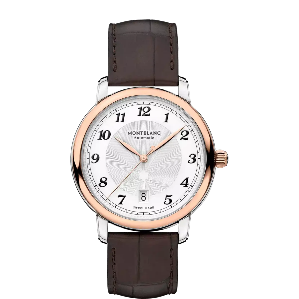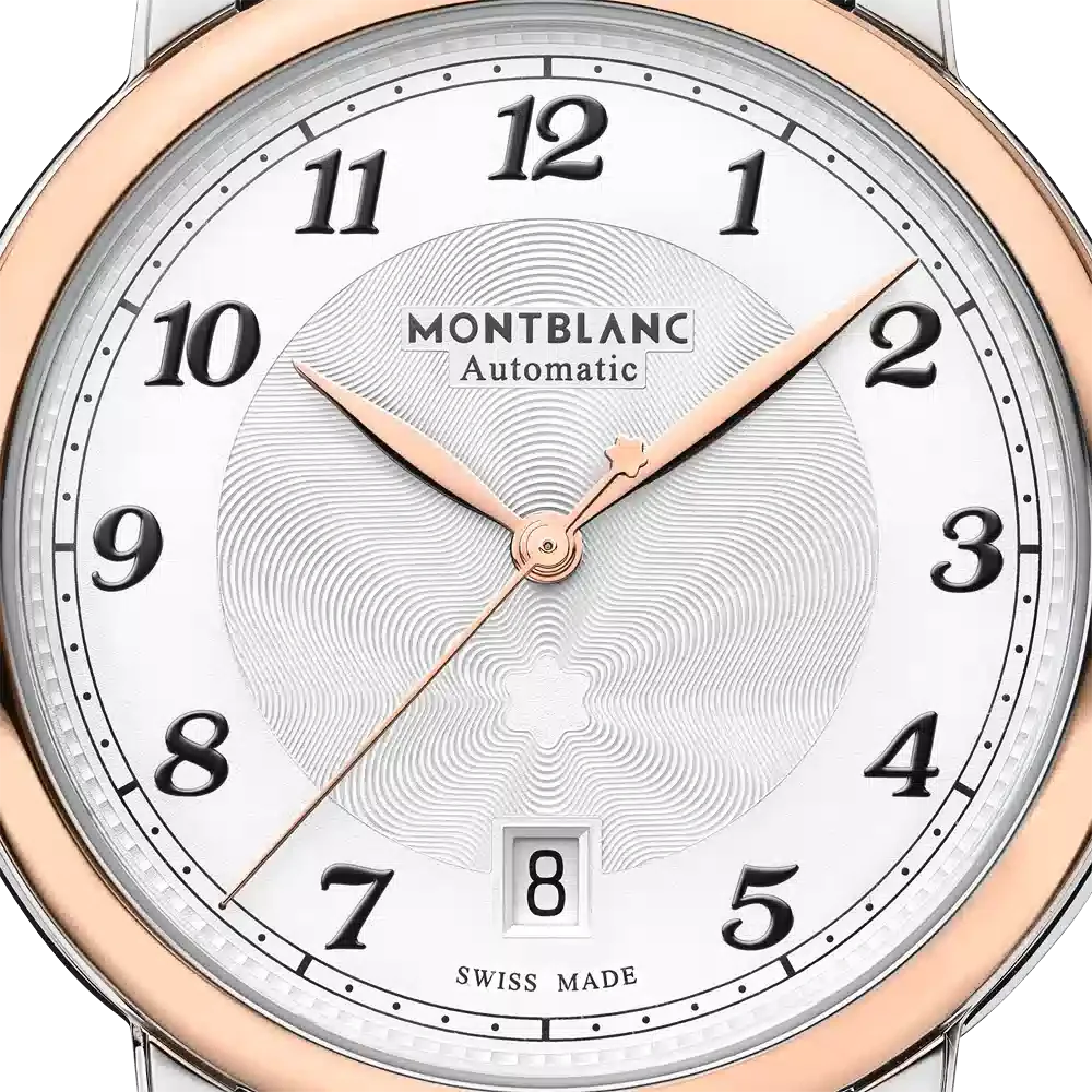 La línea de productos Montblanc Star Legacy se inspira en la herencia de Minerva y en los relojes de bolsillo que la empresa fabricó a finales del siglo XIX y principios del XX. El Star Legacy Automatic Date presenta todos los códigos de diseño de la línea, incluida una esfera refinada con el patrón guilloché de estrella explosiva de Montblanc, agujas de las horas y los minutos en forma de hoja recubiertas de oro rosa, números arábigos rediseñados que recuerdan a los históricos relojes de bolsillo Minerva, un filet sauté (líneas guilloché ascendentes y descendentes), una escala de minutos tipo ferrocarril y un segundero con el emblema de Montblanc en su extremo. El reloj tiene una caja de acero inoxidable y oro rosa 750/1000 (18 quilates) de 39 mm, cuenta con una esfera de color blanco plateado y viene con una correa de piel de cocodrilo marrón. N.º de identificación: MB117577 Ancho de la asa: 19 mm