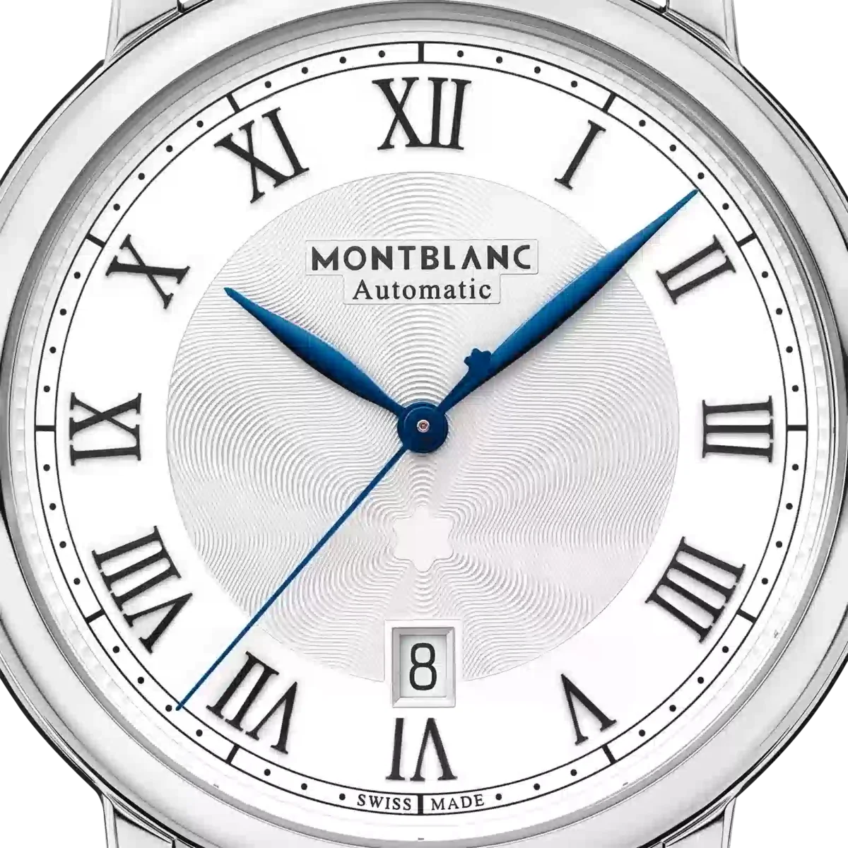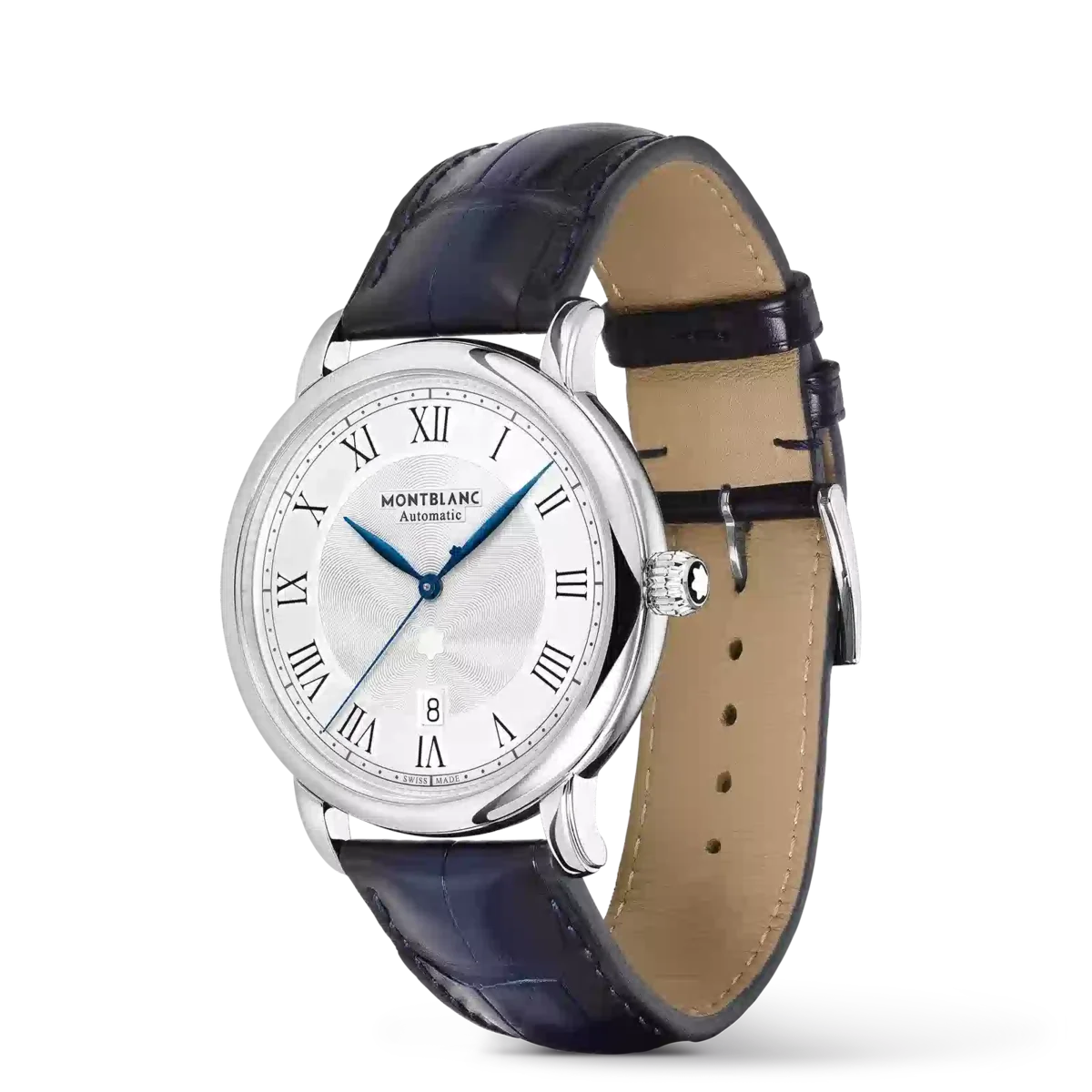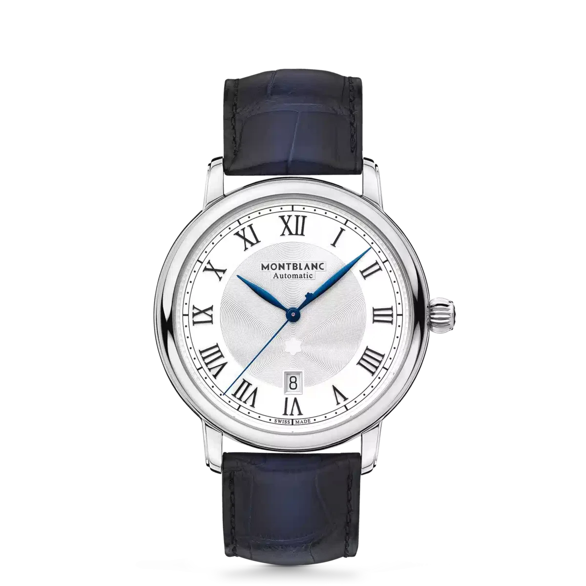 La línea de productos Montblanc Star Legacy se inspira en la herencia de Minerva y en los relojes de bolsillo que la empresa fabricó a finales del siglo XIX y principios del XX. En consonancia con los códigos de diseño de la gama de productos, el Montblanc Star Legacy Automatic Date presenta una refinada esfera blanco plateada con el patrón guilloché de estrella explosiva de Montblanc, números romanos, agujas en forma de hoja, un motivo guilloché «filet sauté» y una vía de tren. El reloj está equipado con el calibre automático MB 24.09 y cuenta con las horas, los minutos y los segundos en el centro y la fecha en una ventanilla a las seis en punto. Viene en una caja de acero inoxidable de 42 mm y está equipado con una moderna correa de piel de cocodrilo azul sfumato. N.º de identificación MB131209 Ancho de la asa 21 mm