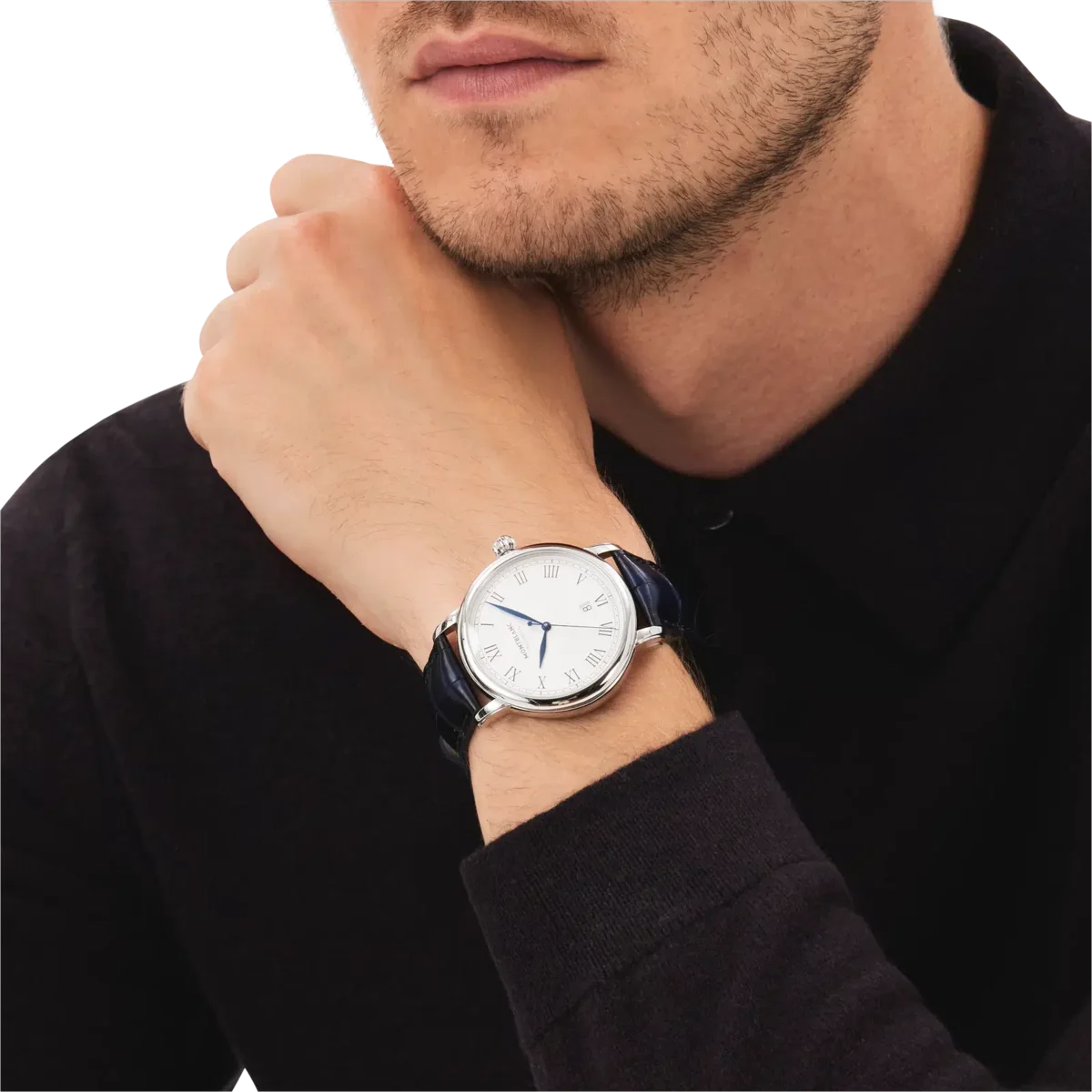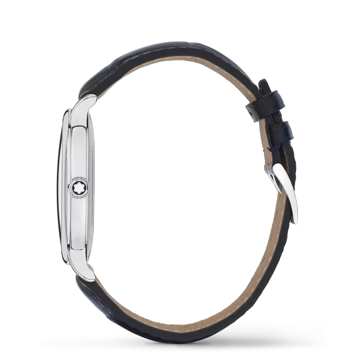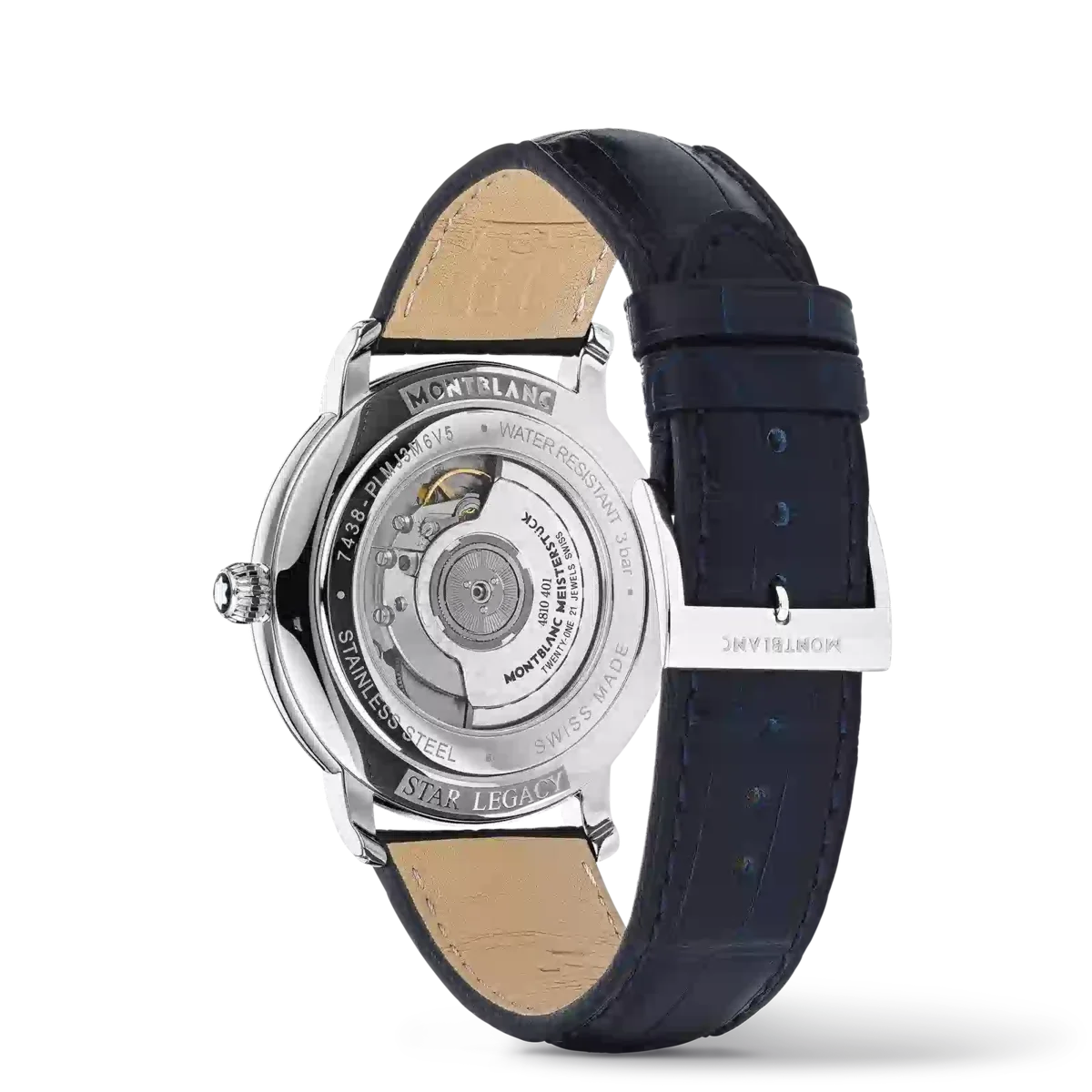 La línea de productos Montblanc Star Legacy se inspira en la herencia de Minerva y en los relojes de bolsillo que la empresa fabricó a finales del siglo XIX y principios del XX. En consonancia con los códigos de diseño de la gama de productos, el Montblanc Star Legacy Automatic Date presenta una refinada esfera blanco plateada con el patrón guilloché de estrella explosiva de Montblanc, números romanos, agujas en forma de hoja, un motivo guilloché «filet sauté» y una vía de tren. El reloj está equipado con el calibre automático MB 24.09 y cuenta con las horas, los minutos y los segundos en el centro y la fecha en una ventanilla a las seis en punto. Viene en una caja de acero inoxidable de 42 mm y está equipado con una moderna correa de piel de cocodrilo azul sfumato. N.º de identificación MB131209 Ancho de la asa 21 mm