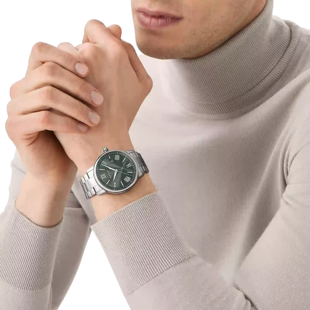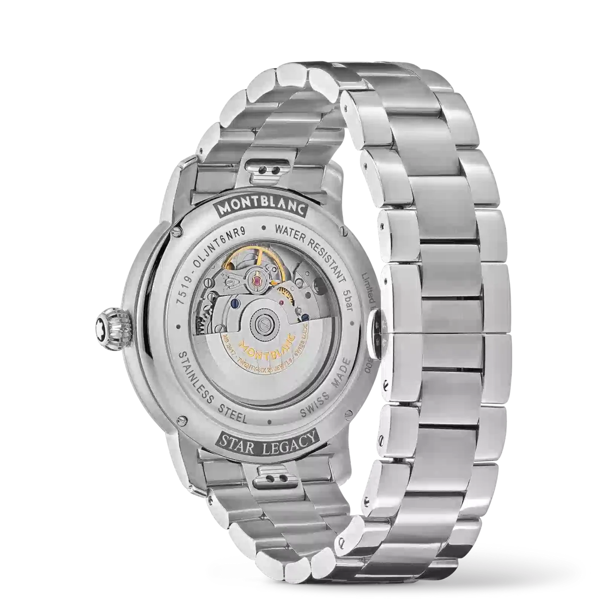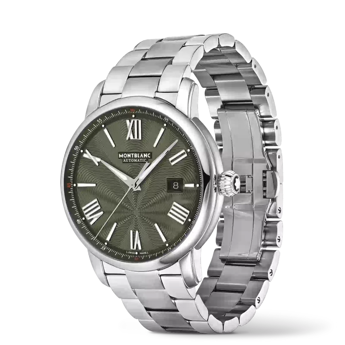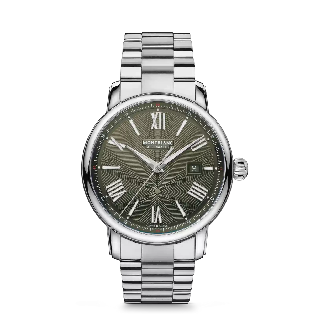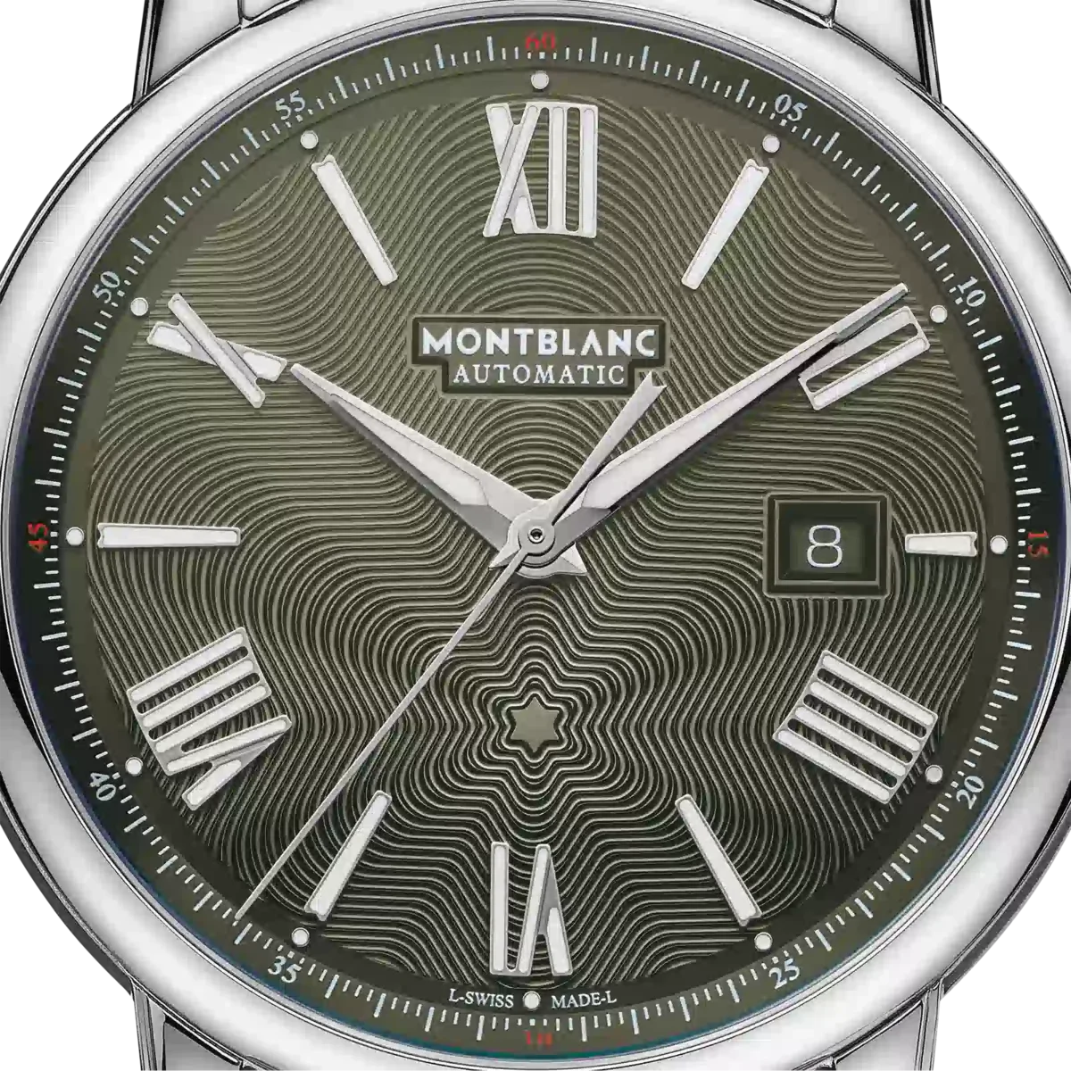 El Montblanc Star Legacy Automatic Date Limited Edition de 800 piezas está adornado con una esfera verde con el característico patrón de estrella explosiva de Montblanc y agujas y números en forma de espada recubiertos de rodio. Está impulsado por el movimiento automático MB 24.17 que indica las horas, los minutos, los segundos y la fecha. En cuanto al diseño, el reloj se inspira en los relojes de bolsillo Minerva de finales del siglo XIX y principios del XX, con sus cajas redondas, pulidas y con forma de guijarro, y sus coronas en forma de cebolla. Este reloj también está equipado con un brazalete intercambiable de acero inoxidable. N.º de identificación: MB132949
