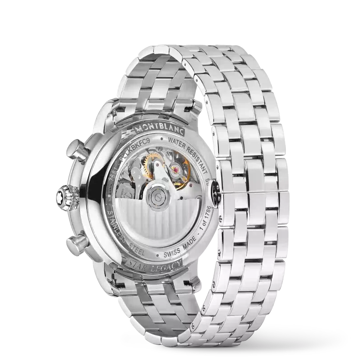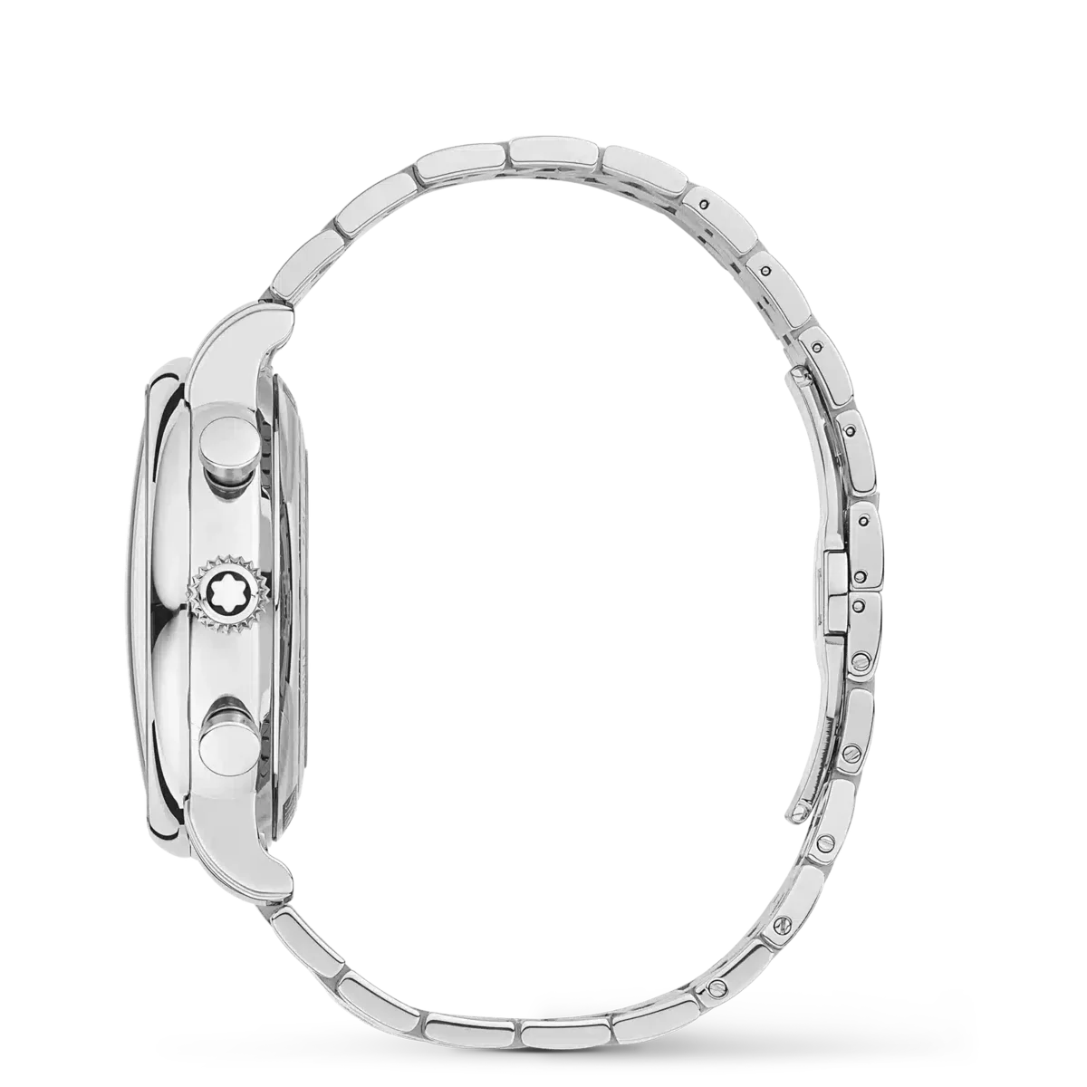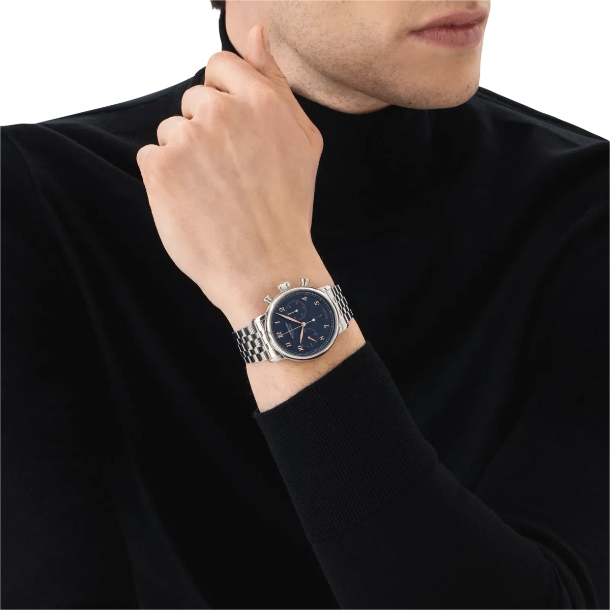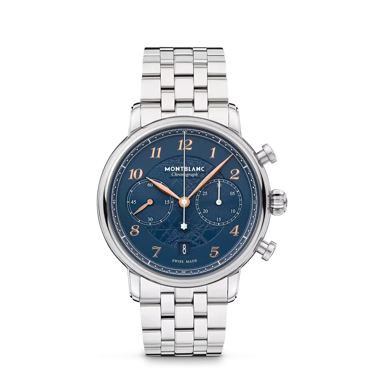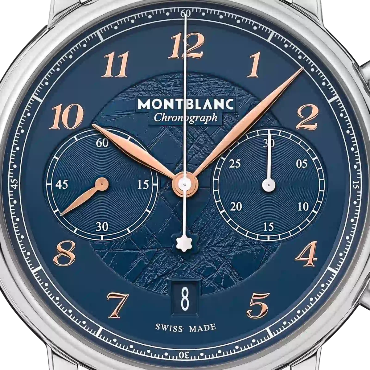 El Montblanc Star Legacy Chronograph está limitado a 1786 piezas y viene en una caja de acero inoxidable de 42 mm con forma de guijarro, números arábigos recubiertos de oro rosa y una llamativa esfera azul con diseño de glaciar. La esfera está decorada con un diseño de capas de hielo inspirado en el Mer de Glace, el glaciar principal del monte Mont Blanc. El centro de la esfera se ha creado utilizando un sello especial que reproduce la textura de este glaciar y celebra la «hora azul» (l’heure bleue), durante la cual un tono de azul intenso cae sobre el glaciar al atardecer, cuando sale la luna y comienzan a brillar las estrellas. Fue a esta hora del día cuando Jacques Balmat se convirtió en la primera persona en alcanzar la cima del Mont Blanc, a las 18:23 del 7 de agosto de 1786. Las funciones incluyen horas, minutos, segundos centrales con el emblema de Montblanc en el contrapeso, cronógrafo y fecha, y están impulsadas por el movimiento automático MB 25.13, que se puede admirar a través del fondo de la caja de cristal de zafiro. Las funciones horarias se muestran con agujas en forma de hoja recubiertas de oro rosa, mientras que las indicaciones del cronógrafo utilizan agujas «baton» recubiertas de rodio. El reloj se combina con un brazalete de acero inoxidable. N.º de identificación: MB129627