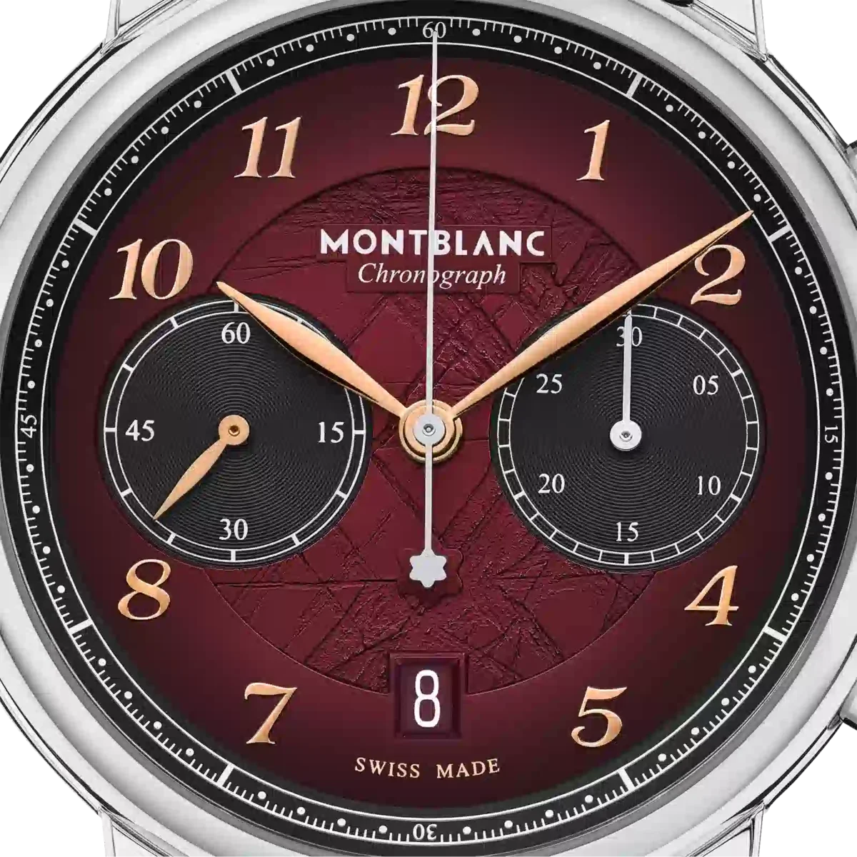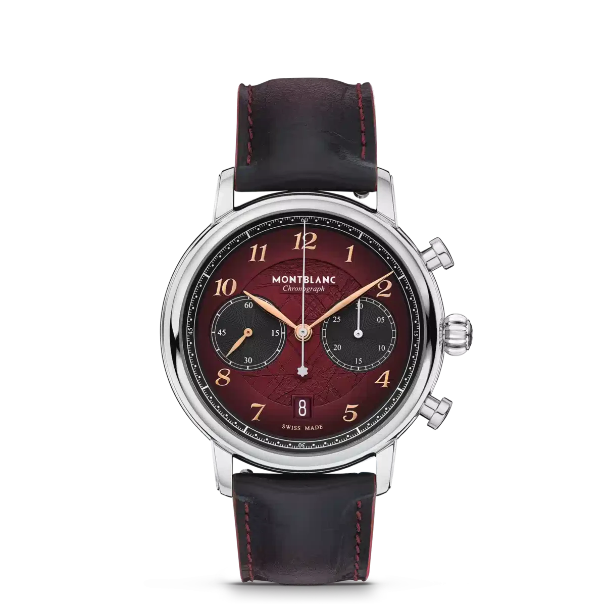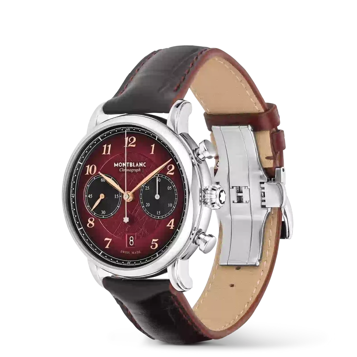El Montblanc Star Legacy Chronograph Edición Limitada de 1786 piezas rinde homenaje al intrépido Jacques Balmat, quien fue el primero en alcanzar la cima del Mont Blanc en 1786. El reloj presenta una esfera de color burdeos con motivo glaciar y efecto sfumato en el exterior, una minutería en forma de cremallera y números recubiertos de oro rosa. Las indicaciones incluyen una aguja central de segundos del cronógrafo con el emblema de Montblanc en el contrapeso y un contador de 30 minutos del cronógrafo con agujas recubiertas de rodio, mientras que las funciones de relojería (horas, minutos y segundero pequeño) cuentan con agujas recubiertas de oro rosa. Este modelo está impulsado por el movimiento automático MB 25.13 y se aloja en una caja de acero inoxidable de 42 mm con fondo abierto sobre el movimiento. El reloj viene con una correa intercambiable de piel de becerro con estampado de cocodrilo y sfumato vertical. N.º de identificación: MB133245 Ancho de la asa: 21 mm
