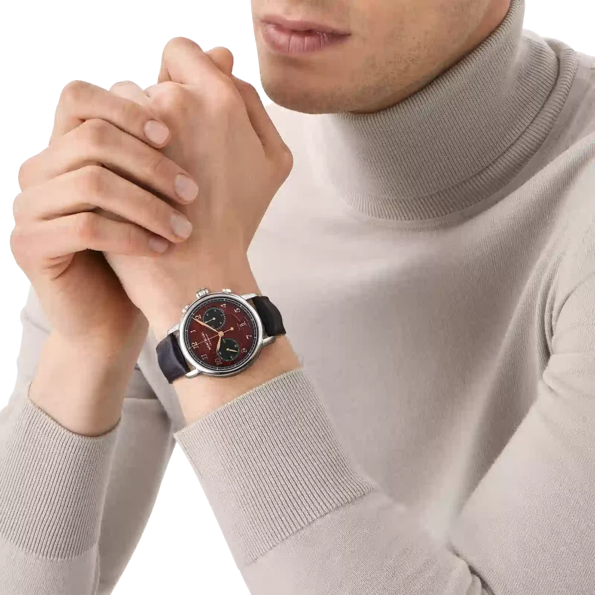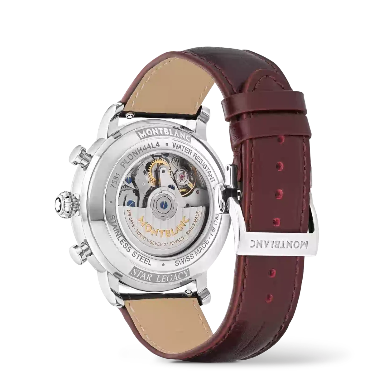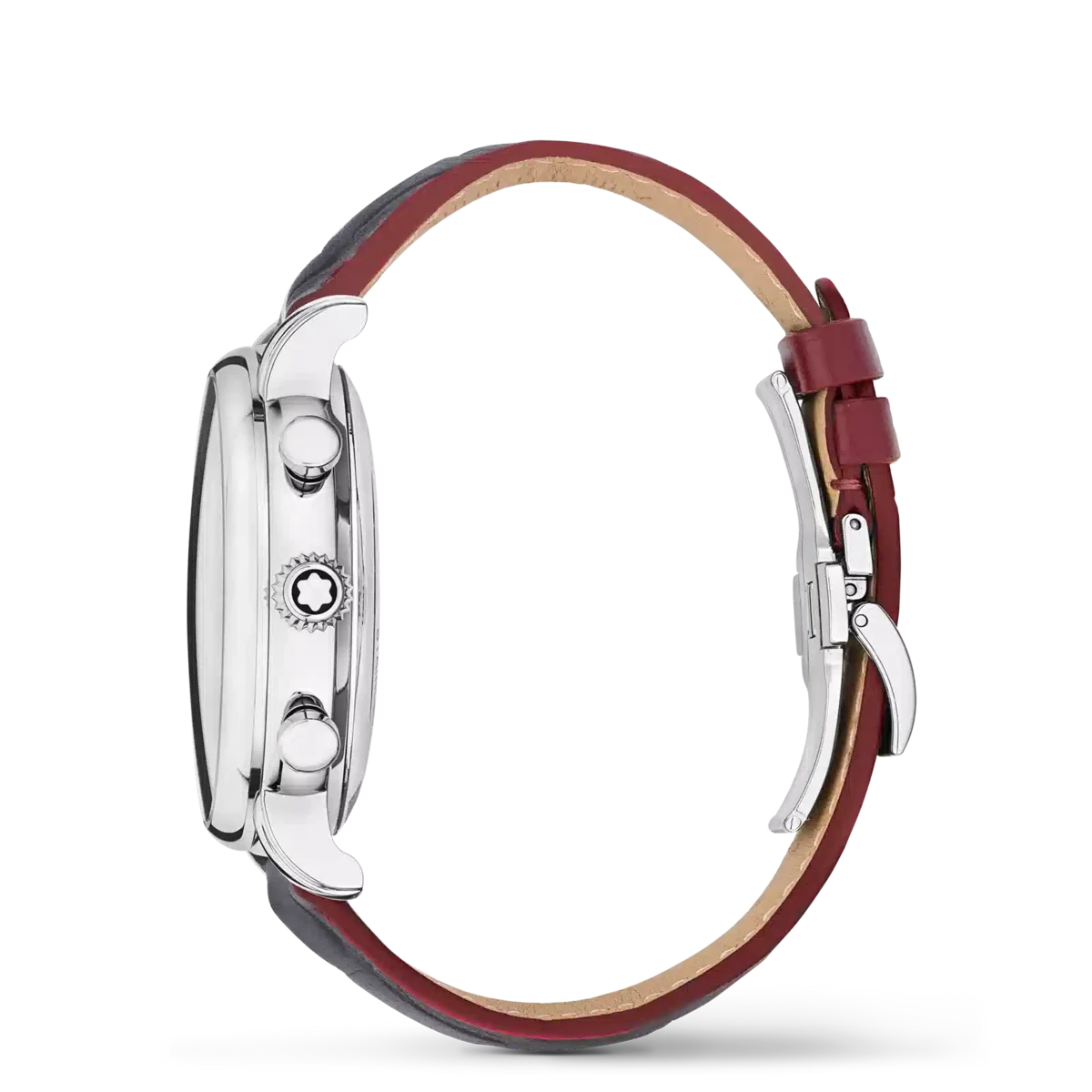 El Montblanc Star Legacy Chronograph Edición Limitada de 1786 piezas rinde homenaje al intrépido Jacques Balmat, quien fue el primero en alcanzar la cima del Mont Blanc en 1786. El reloj presenta una esfera de color burdeos con motivo glaciar y efecto sfumato en el exterior, una minutería en forma de cremallera y números recubiertos de oro rosa. Las indicaciones incluyen una aguja central de segundos del cronógrafo con el emblema de Montblanc en el contrapeso y un contador de 30 minutos del cronógrafo con agujas recubiertas de rodio, mientras que las funciones de relojería (horas, minutos y segundero pequeño) cuentan con agujas recubiertas de oro rosa. Este modelo está impulsado por el movimiento automático MB 25.13 y se aloja en una caja de acero inoxidable de 42 mm con fondo abierto sobre el movimiento. El reloj viene con una correa intercambiable de piel de becerro con estampado de cocodrilo y sfumato vertical. N.º de identificación: MB133245 Ancho de la asa: 21 mm