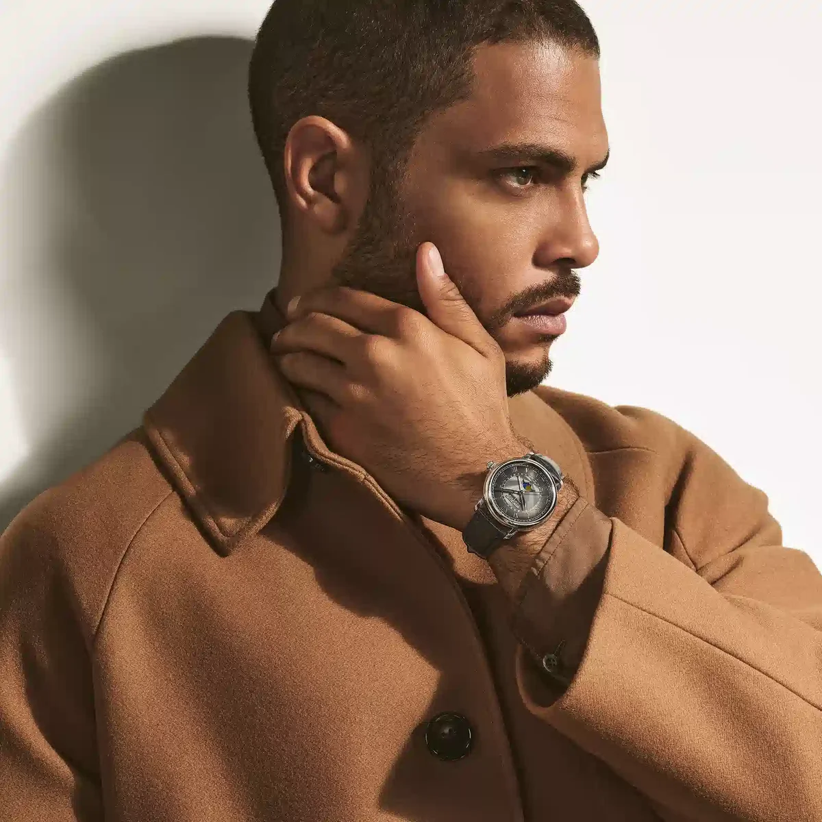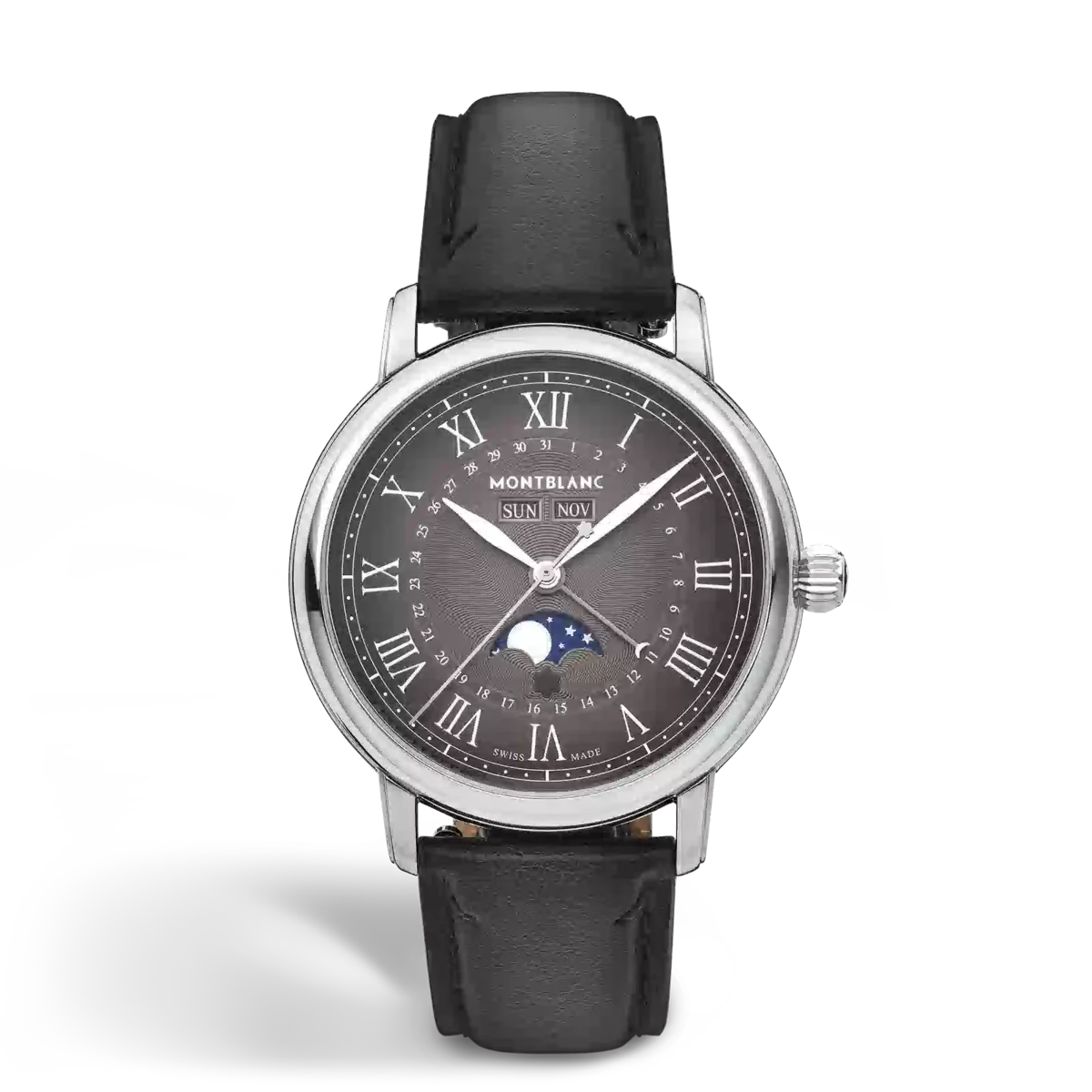El Montblanc Star Legacy Full Calendar lleva los mejores códigos de diseño de la Maison a un nuevo nivel de elegancia. El reloj presenta una esfera antracita sfumato con motivo guilloché de estrellas explosivas, un filete sauté, números romanos recubiertos de rodio, agujas en forma de hoja e indica las horas, los minutos y los segundos, así como el día, la fecha, el mes y la fase lunar de una manera sencilla y elegante. Este modelo está impulsado por el movimiento automático MB 24.30 y se aloja en una caja de acero inoxidable de 42 mm con forma de guijarro, provista de un fondo abierto que permite ver la masa oscilante decorada con el emblema de Montblanc. La correa intercambiable de piel de becerro antracita ha sido especialmente diseñada por el director artístico de Montblanc, Marco Tomasetta, quien se inspiró en las plumillas de los instrumentos de escritura de la Maison por su forma puntiaguda, realzada con un efecto sfumato vertical. N.º de identificación: MB134358