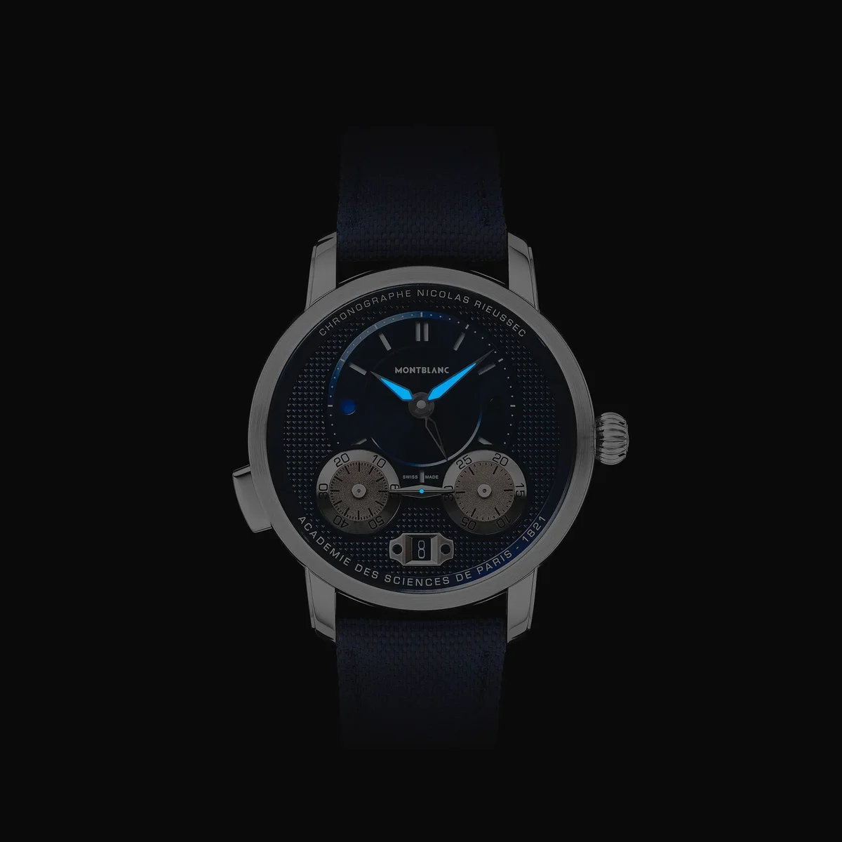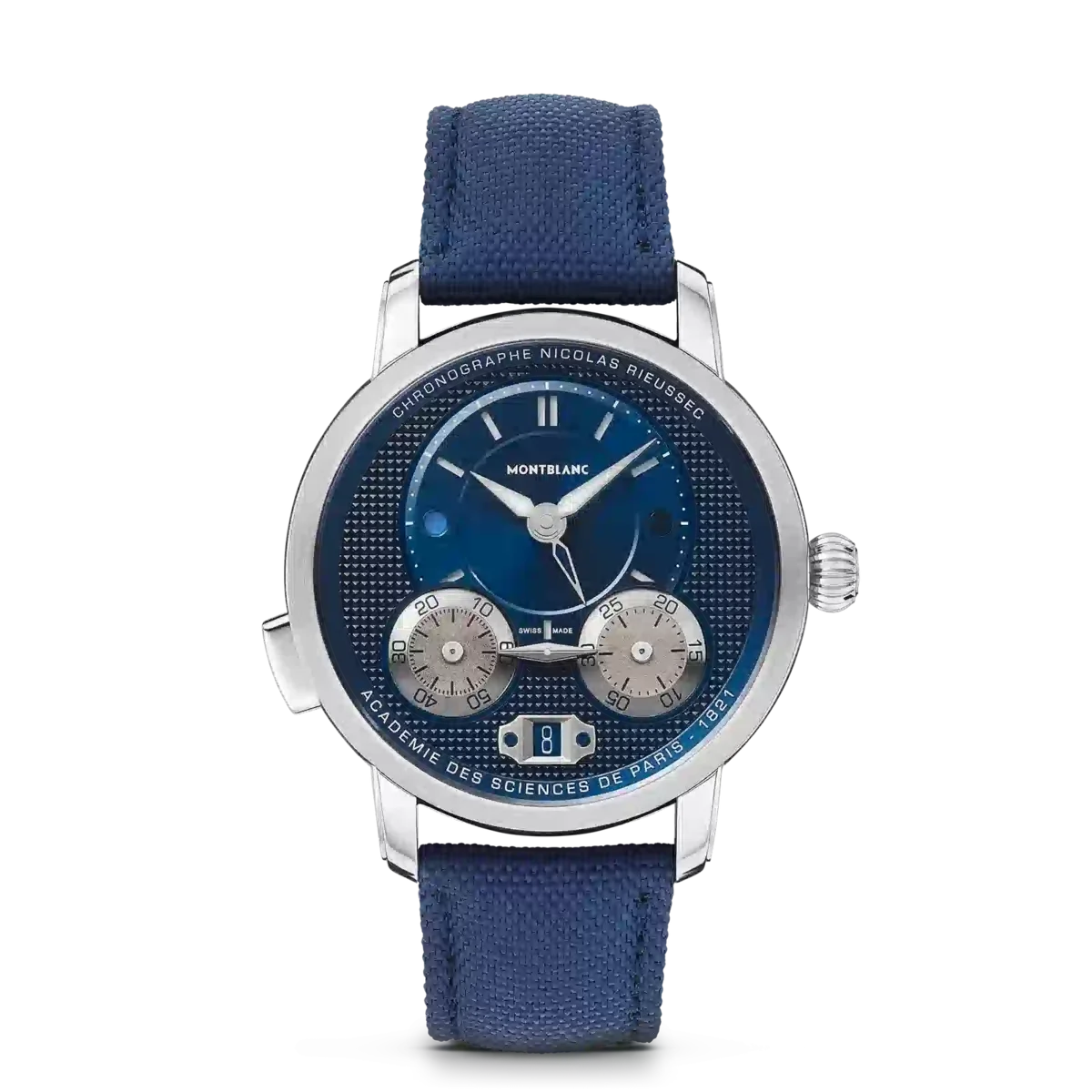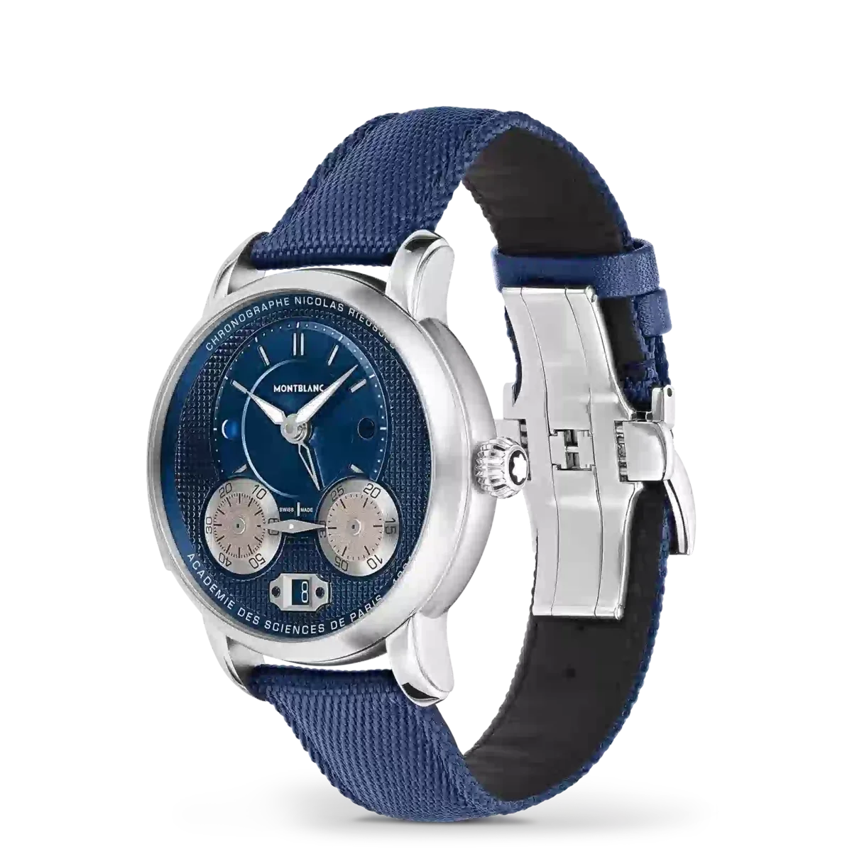 El Montblanc Star Legacy Nicolas Rieussec Monopusher Chronograph funciona con el movimiento de fabricación MB R200 y presenta una caja de acero inoxidable de 43 mm con esfera azul, agujas recubiertas de rodio e índices de color blanco plateado. Este nuevo modelo presenta varios detalles que refuerzan la conexión histórica con París, donde comenzó la historia de los cronógrafos Montblanc en el hipódromo Champ-de-Mars, como el motivo Clou de Paris en la esfera, que se repite en la masa oscilante y la correa textil. Este motivo tiene su origen en el diseño geométrico de las calles empedradas de París y es el nexo entre el pasado y el futuro de este reloj.