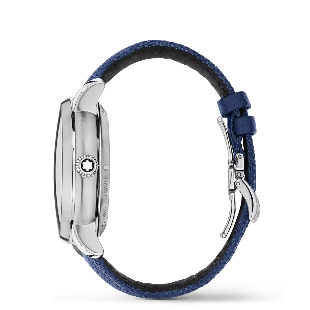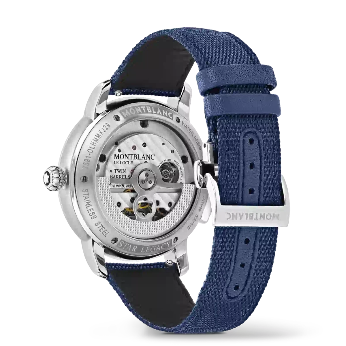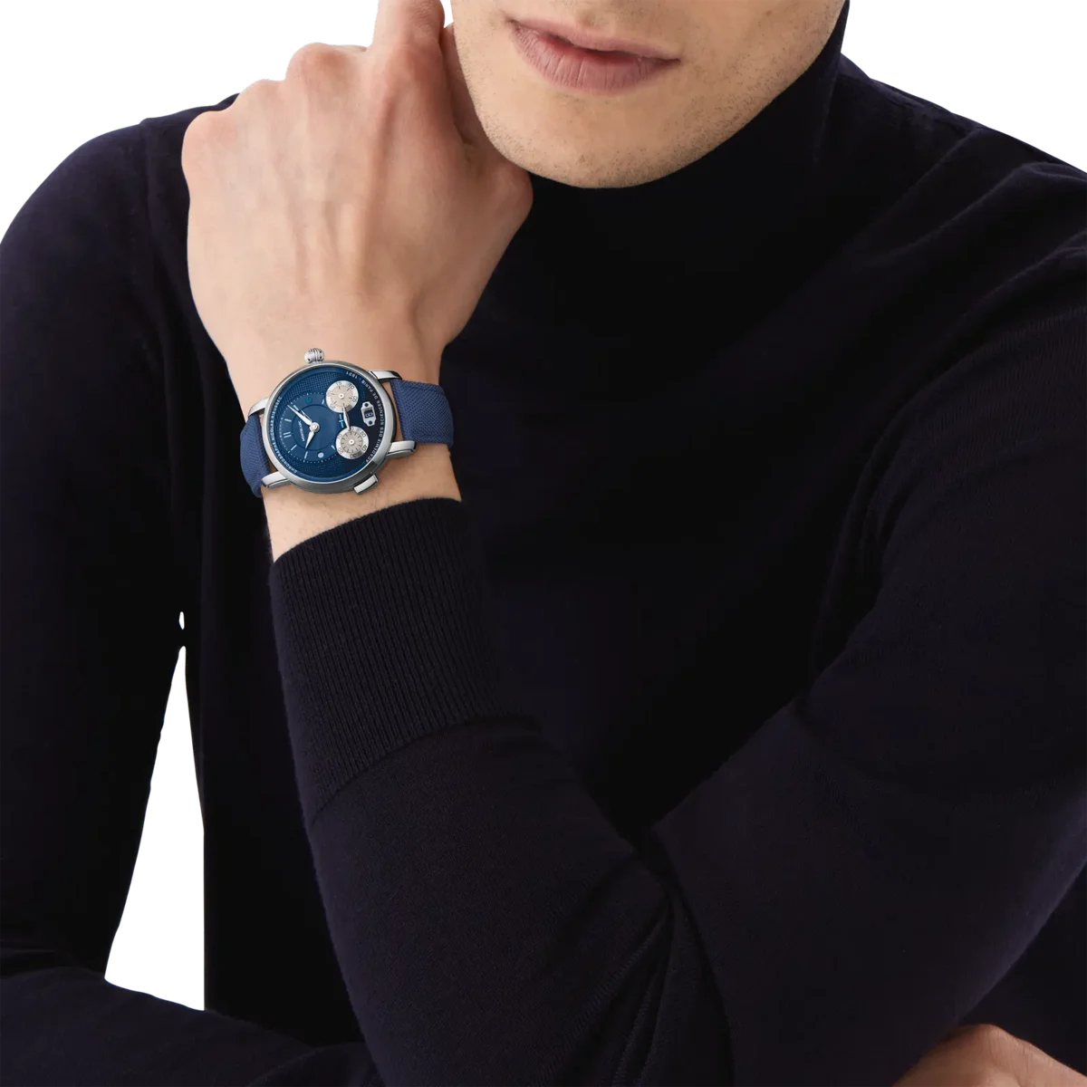El Montblanc Star Legacy Nicolas Rieussec Monopusher Chronograph funciona con el movimiento de fabricación MB R200 y presenta una caja de acero inoxidable de 43 mm con esfera azul, agujas recubiertas de rodio e índices de color blanco plateado. Este nuevo modelo presenta varios detalles que refuerzan la conexión histórica con París, donde comenzó la historia de los cronógrafos Montblanc en el hipódromo Champ-de-Mars, como el motivo Clou de Paris en la esfera, que se repite en la masa oscilante y la correa textil. Este motivo tiene su origen en el diseño geométrico de las calles empedradas de París y es el nexo entre el pasado y el futuro de este reloj.